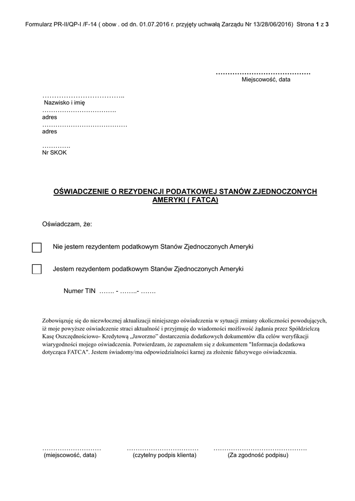 Formularz PR-II/QP-I /F-14 ( obow . od dn. 01.07.2016 r. przyjęty uchwałą Zarządu Nr 13/28/06/2016) Strona 1 z 3 …………………………………. Miejscowość, data …………………………….. Nazwisko i imię ……………………………. adres ………………………………… adres …………. Nr SKOK OŚWIADCZENIE O REZYDENCJI PODATKOWEJ STANÓW ZJEDNOCZONYCH AMERYKI ( FATCA) Oświadczam, że: Nie jestem rezydentem podatkowym Stanów Zjednoczonych Ameryki Jestem rezydentem podatkowym Stanów Zjednoczonych Ameryki Numer TIN ……. - ……..- ……. Zobowiązuję się do niezwłocznej aktualizacji niniejszego oświadczenia w sytuacji zmiany okoliczności powodujących, iż moje powyższe oświadczenie straci aktualność i przyjmuję do wiadomości możliwość żądania przez Spółdzielczą Kasę Oszczędnościowo- Kredytową „Jaworzno” dostarczenia dodatkowych dokumentów dla celów weryfikacji wiarygodności mojego oświadczenia. Potwierdzam, że zapoznałem się z dokumentem "Informacja dodatkowa dotycząca FATCA". Jestem świadomy/ma odpowiedzialności karnej za złożenie fałszywego oświadczenia. ……………………… (miejscowość, data) …………………………… (czytelny podpis klienta) ……………………………………. (Za zgodność podpisu) Formularz PR-II/QP-I /F-14 ( obow . od dn. 01.07.2016 r. przyjęty uchwałą Zarządu Nr 13/28/06/2016) Strona 2 z 3 INFORMACJA DODATKOWA DOTYCZĄCA FATCA W związku z Ustawą o wykonywaniu Umowy między Rządem Rzeczypospolitej Polskiej a Rządem Stanów Zjednoczonych Ameryki w sprawie poprawy wypełniania międzynarodowych obowiązków podatkowych oraz wdrożenia ustawodawstwa FATCA, na Spółdzielczą Kasę Oszczędnościowo – Kredytową „Jaworzno” (dalej: SKOK ) został nałożony obowiązek stosowania przepisów wprowadzonej przez rząd Stanów Zjednoczonych ustawy o wypełnianiu obowiązków podatkowych w stosunku do rachunków posiadanych za granicą (dalej FATCA). Co to oznacza Celem FATCA jest raportowanie przez polskie władze podatkowe amerykańskim organom podatkowym informacji o aktywach znajdujących się w posiadaniu osób podlegających obowiązkowi podatkowemu w USA. Kto jest rezydentem podatkowym Stanów Zjednoczonych Ameryki Definicja rezydenta podatkowego Stanów Zjednoczonych Ameryki (dalej: USA) powinna być interpretowana zgodnie z przepisami Kodeksu Podatkowego USA (z ang. Internal Revenue Code), wedle którego podatnikiem Stanów Zjednoczonych jest osoba fizyczna spełniająca co najmniej jeden z warunków wymienionych poniżej: 1. Posiada obywatelstwo USA (również w przypadku jednoczesnego posiadania innego obywatelstwa). 2. Posiada tzw. Zieloną Kartę, czyli prawo do stałego pobytu w USA. 3. Dokonała wyboru amerykańskiej rezydencji dla celów podatkowych po spełnieniu warunków przewidzianych w przepisach USA. 4. Spełnia warunki tzw. testu długości pobytu na terytorium USA, który dotyczy weryfikacji długości pobytu na terytorium USA w okresie ostatnich 3 lat, tzn. osoba przebywała w USA przez co najmniej 31 dni w ciągu roku i jednocześnie liczba dni, w których dana osoba przebywała na terenie USA w ciągu bieżącego roku i 2 poprzednich lat kalendarzowych wynosi co najmniej 183 dni. Ustalając liczbę dni pobytu stosuje się mnożnik 1 dla liczby dni pobytu w roku bieżącym, 1/3 dla dni pobytu w roku poprzednim i 1/6 dla dni pobytu dwa lata wstecz. Jakie informacje będziemy przekazywać SKOK obowiązany jest do raportowania za pośrednictwem krajowych organów podatkowych informacji o przychodach i zyskach Klientów amerykańskich do amerykańskich organów podatkowych. W przypadku, kiedy SKOK ustali, że jest Pani/Pan obywatelem lub rezydentem USA dla celów podatkowych, przekaże określone informacje do polskich organów podatkowych, które następnie przekażą je władzom podatkowym USA. Przekazywane informacje będą obejmowały: 1) imię, nazwisko, adres, amerykański numer identyfikacji podatkowej (TIN), 2) numer konta bankowego, 3) saldo konta lub wartość aktywów ustalone według stanu na koniec danego roku kalendarzowego, a jeśli rachunek ten został zamknięty w ciągu tego roku kalendarzowego – według stanu bezpośrednio przed zamknięciem rachunku, 4) w zakresie rachunków będących rachunkami powierniczymi: a. łączną wartość brutto odsetek, dywidend oraz innych dochodów uzyskiwanych z aktywów znajdujących się na tym rachunku, a w każdym przypadku wypłacanych lub uznanych w poczet rachunku (lub w powiązaniu z tym rachunkiem) w ciągu danego roku kalendarzowego lub w innym odpowiednim okresie sprawozdawczym, b. łączną wartość brutto przychodów ze sprzedaży lub umorzenia aktywów wypłaconych lub uznanych w poczet rachunku w ciągu danego roku kalendarzowego lub w innym odpowiednim okresie sprawozdawczym, w odniesieniu do którego SKOK działała jako powiernik, broker, pełnomocnik lub innego rodzaju agent, 5) w zakresie rachunków będących rachunkami depozytowymi: łączną wartość brutto odsetek wypłaconych lub uznanych w poczet rachunku w ciągu danego roku kalendarzowego lub w innym odpowiednim okresie sprawozdawczym, Formularz PR-II/QP-I /F-14 ( obow . od dn. 01.07.2016 r. przyjęty uchwałą Zarządu Nr 13/28/06/2016) Strona 3 z 3 6) w przypadku innych rachunków wyżej nie wymienionych: łączną wartość brutto wypłacaną lub uznaną w poczet rachunku w ciągu roku kalendarzowego lub w innym odpowiednim okresie sprawozdawczym, w odniesieniu do którego SKOK jest podmiotem zobowiązanym lub dłużnikiem, w tym łączną wartość wszelkich kwot umorzeń dokonywanych na rzecz posiadacza rachunku w ciągu roku kalendarzowego lub w innym odpowiednim okresie sprawozdawczym. Administratorem danych osobowych dotyczących FATCA zebranych przez SKOK jest Spółdzielcza Kasa Oszczędnościowo Kredytowa w Jaworznie(adres: ul. Gwarków 2, 43-600 Jaworzno). Dane te są przetwa