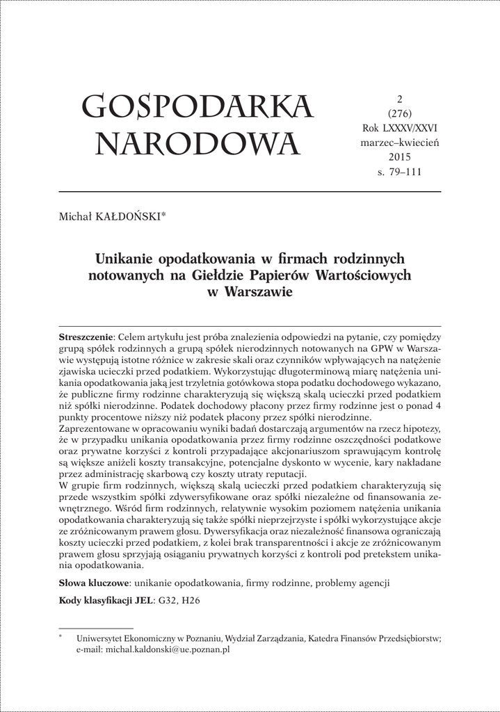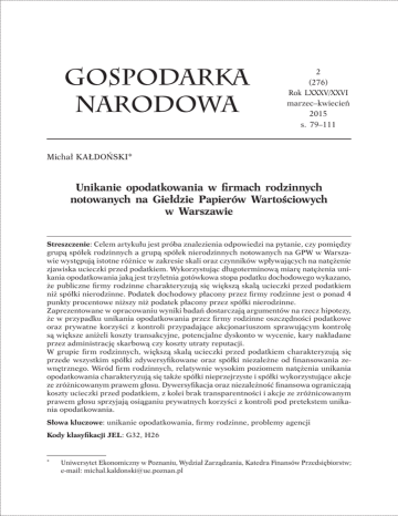 Michał Kałdoński, Unikanie opodatkowania w firmach rodzinnych notowanych na Giełdzie... Gospodarka narodowa 79 2 (276) Rok LXXXV/XXVI marzec–kwiecień 2015 s. 79–111 Michał KAŁDOŃSKI* Unikanie opodatkowania w firmach rodzinnych notowanych na Giełdzie Papierów Wartościowych w Warszawie Streszczenie: Celem artykułu jest próba znalezienia odpowiedzi na pytanie, czy pomiędzy grupą spółek rodzinnych a grupą spółek nierodzinnych notowanych na GPW w Warszawie występują istotne różnice w zakresie skali oraz czynników wpływających na natężenie zjawiska ucieczki przed podatkiem. Wykorzystując długoterminową miarę natężenia unikania opodatkowania jaką jest trzyletnia gotówkowa stopa podatku dochodowego wykazano, że publiczne firmy rodzinne charakteryzują się większą skalą ucieczki przed podatkiem niż spółki nierodzinne. Podatek dochodowy płacony przez firmy rodzinne jest o ponad 4 punkty procentowe niższy niż podatek płacony przez spółki nierodzinne. Zaprezentowane w opracowaniu wyniki badań dostarczają argumentów na rzecz hipotezy, że w przypadku unikania opodatkowania przez firmy rodzinne oszczędności podatkowe oraz prywatne korzyści z kontroli przypadające akcjonariuszom sprawującym kontrolę są większe aniżeli koszty transakcyjne, potencjalne dyskonto w wycenie, kary nakładane przez administrację skarbową czy koszty utraty reputacji. W grupie firm rodzinnych, większą skalą ucieczki przed podatkiem charakteryzują się przede wszystkim spółki zdywersyfikowane oraz spółki niezależne od finansowania zewnętrznego. Wśród firm rodzinnych, relatywnie wysokim poziomem natężenia unikania opodatkowania charakteryzują się także spółki nieprzejrzyste i spółki wykorzystujące akcje ze zróżnicowanym prawem głosu. Dywersyfikacja oraz niezależność finansowa ograniczają koszty ucieczki przed podatkiem, z kolei brak transparentności i akcje ze zróżnicowanym prawem głosu sprzyjają osiąganiu prywatnych korzyści z kontroli pod pretekstem unikania opodatkowania. Słowa kluczowe: unikanie opodatkowania, firmy rodzinne, problemy agencji Kody klasyfikacji JEL: G32, H26 * Uniwersytet Ekonomiczny w Poznaniu, Wydział Zarządzania, Katedra Finansów Przedsiębiorstw; e-mail: [email protected] 80 GOSPODARKA NARODOWA nr 2/2015 Artykuł nadesłany 1 września 2014 r., zaakceptowany 11 marca 2015 r. Wprowadzenie Unikanie opodatkowania dochodów przez indywidualnych podatników, rozpatrywane z perspektywy osób zajmujących się finansami publicznymi, było i jest przedmiotem licznych badań prowadzonych na całym świecie [Allingham, Sandmo, 1972; Slemrod, Yitzhaki, 2002], w tym także w Polsce [Bernal, 2008; Kudła, 2004; Karwat, 2002]. Obecne zainteresowanie naukowców unikaniem opodatkowania przez korporacje dotyczy skali, determinant oraz konsekwencji zjawiska i ma dwie podstawowe przyczyny. Jedną z nich jest znacząca erozja dochodów podatkowych wypracowywanych w przeszłości przez korporacje. Inną przyczyną jest kryzys nadzoru korporacyjnego. Wypadki związane z Enronem, WorldComem, czy innymi korporacjami dowiodły z kolei, że w wielu przypadkach, pod pretekstem ucieczki przed podatkiem, menedżerowie spółek realizowali swoje własne cele. Dorobek naukowy w zakresie unikania opodatkowania dochodów przez korporacje jest zdominowany przez piśmiennictwo amerykańskie i odnosi się prawie wyłącznie do spółek publicznych. Niestety, jak dotychczas nie przeprowadzono analogicznych badań dla innych państw. Specyfika systemu finansowego oraz systemu podatkowego, które obowiązują w Stanach Zjednoczonych, sprawia, że modele tam tworzone traktowane są jako specyficzne dla warunków amerykańskich. Przykładem zagadnienia, które nie jest rozwijane i pogłębiane w takim stopniu, na jaki zasługuje, jest problem unikania opodatkowania w firmach rodzinnych. Wyniki prowadzonych na świecie badań potwierdzają, że jedną z cech charakterystycznych modelu systemu finansowego zorientowanego na kontrolę, który dominuje w Europie, jest koncentracja kontroli nad przedsiębiorstwami w rękach rodzin [La Porta, Lopez de Silanes, Schleifer, 1999; Faccio, Lang, 2002]. Pojęcie firmy rodzinnej utożsamiane jest najczęściej z przedsiębiorstwem, którego kapitał w całości lub w przeważającej części znajduje się w posiadaniu rodziny, przynajmniej jeden jej członek wywiera decydujący wpływ na kierownictwo lub sam sprawuje funkcję kierowniczą z zamiarem trwałego utrzymania przedsięwzięcia w rękach rodziny. Dowodów na odrębność i specyfikę firm rodzinnych dostarczają rozmaite badania. Wiele ośrodków naukowych wykazuje coraz większe zainteresowanie tego typu podmiotami: ich liczbą, wynikami finansowymi oraz naturą różnic pomiędzy nimi a przedsiębiorstwami nierodzinnymi. Cały czas brakuje jednak badań mających na celu potwierdzenie odrębności tych podmiotów ze względu na motywy i natężenie zjawiska unikania opodatkowania. Niniejsze opracowanie jest próbą uzupełnienia luki badawczej dotyczącej skali i przyczyn ewentualnego zróżnicowania zjawiska unikania opodatkowania dochodów pomiędzy publicznymi firmami rodzinnymi i nierodzinnymi, które funkcjonują w warunkach instytucjonalnych odmiennych od Michał Kałdoński, Unikanie opodatkowania w firmach rodzinnych notowanych na Giełdzie... 81 realiów amerykańskich. Prowadzone badania wpisują się bezpośrednio w nurt badawczy określany w literaturze przedmiotu jako „unikanie opodatkowania w świetle teorii agencji” (agency perspective on tax avoidance), zaś samo pojęcie unikanie opodatkowania rozumiane jest bardzo szeroko jako każde zachowanie podatnika zmierzające do ograniczenia ciężaru podatkowego związanego z osiąganymi dochodami1. Rozdzielenie własności i kontroli nad przedsiębiorstwem sprawia, że poza czynnikami charakterystycznymi dla indywidualnych podatników takimi jak: stawka podatku, prawdopodobie