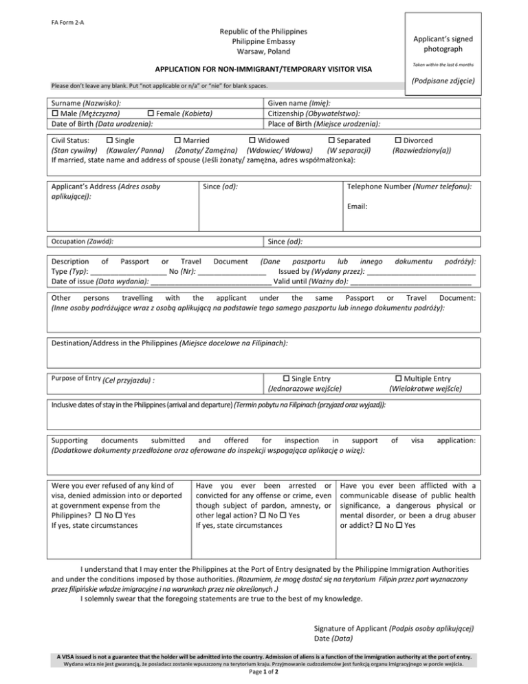 FA Form 2-A Republic of the Philippines Philippine Embassy Warsaw, Poland Applicant’s signed photograph Taken within the last 6 months APPLICATION FOR NON-IMMIGRANT/TEMPORARY VISITOR VISA (Podpisane zdjęcie) Please don’t leave any blank. Put “not applicable or n/a” or “nie” for blank spaces. Surname (Nazwisko): Male (Mężczyzna) Female (Kobieta) Date of Birth (Data urodzenia): Given name (Imię): Citizenship (Obywatelstwo): Place of Birth (Miejsce urodzenia): Civil Status: Single Married Widowed Separated (Stan cywilny) (Kawaler/ Panna) (Żonaty/ Zamężna) (Wdowiec/ Wdowa) (W separacji) If married, state name and address of spouse (Jeśli żonaty/ zamężna, adres współmałżonka): Applicant’s Address (Adres osoby aplikującej): Since (od): Divorced (Rozwiedziony(a)) Telephone Number (Numer telefonu): Email: Occupation (Zawód): Since (od): Description of Passport or Travel Document (Dane paszportu lub innego dokumentu podróży): Type (Typ): ___________________ No (Nr): _________________ Issued by (Wydany przez): ___________________________ Date of issue (Data wydania): ______________________________ Valid until (Ważny do): ______________________________ Other persons travelling with the applicant under the same Passport or Travel Document: (Inne osoby podróżujące wraz z osobą aplikującą na podstawie tego samego paszportu lub innego dokumentu podróży): Destination/Address in the Philippines (Miejsce docelowe na Filipinach): Purpose of Entry (Cel przyjazdu) : Single Entry (Jednorazowe wejšcíe) Multiple Entry (Wielokrotwe wejšcíe) Inclusive dates of stay in the Philippines (arrival and departure) (Termin pobytu na Filipinach (przyjazd oraz wyjazd)): Supporting documents submitted and offered for inspection in support (Dodatkowe dokumenty przedłożone oraz oferowane do inspekcji wspogająca aplikację o wizę): Were you ever refused of any kind of visa, denied admission into or deported at government expense from the Philippines? No Yes If yes, state circumstances Have you ever been arrested or convicted for any offense or crime, even though subject of pardon, amnesty, or other legal action? No Yes If yes, state circumstances of visa application: Have you ever been afflicted with a communicable disease of public health significance, a dangerous physical or mental disorder, or been a drug abuser or addict? No Yes I understand that I may enter the Philippines at the Port of Entry designated by the Philippine Immigration Authorities and under the conditions imposed by those authorities. (Rozumiem, że mogę dostać się na terytorium Filipin przez port wyznaczony przez filipińskie władze imigracyjne i na warunkach przez nie określonych .) I solemnly swear that the foregoing statements are true to the best of my knowledge. Signature of Applicant (Podpis osoby aplikującej) Date (Data) A VISA issued is not a guarantee that the holder will be admitted into the country. Admission of aliens is a function of the immigration authority at the port of entry. Wydana wiza nie jest gwarancją, że posiadacz zostanie wpuszczony na terytorium kraju. Przyjmowanie cudzoziemców jest funkcją organu imigracyjnego w porcie wejścia. Page 1 of 2 FA Form 2-A For Official Use Only Non-Immigrant Visa No. _____________________________ under Section ___________of the Philippine Immigration Act of 1940, as amended issued on: __________________________ and valid until _____________________________. Service No: OR No: Fee paid: Remarks, if any: Page 2 of 2