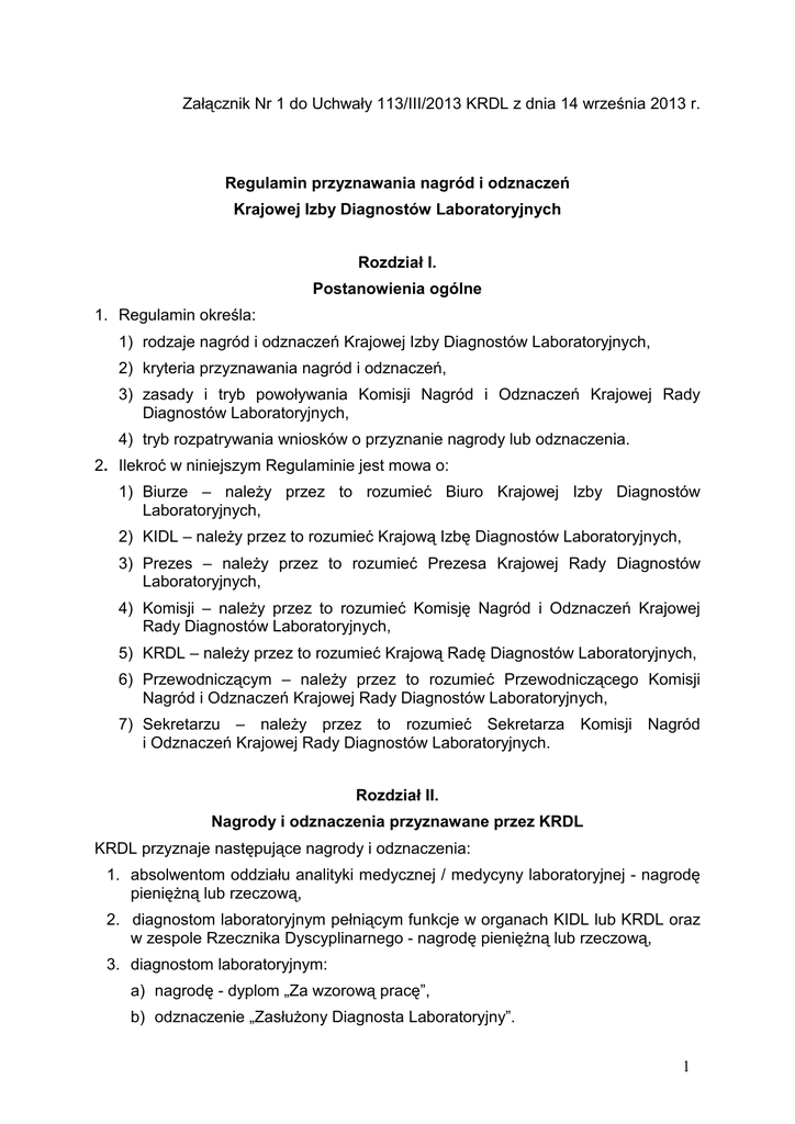 Załącznik Nr 1 do Uchwały 113/III/2013 KRDL z dnia 14 września 2013 r. Regulamin przyznawania nagród i odznaczeń Krajowej Izby Diagnostów Laboratoryjnych Rozdział I. Postanowienia ogólne 1. Regulamin określa: 1) rodzaje nagród i odznaczeń Krajowej Izby Diagnostów Laboratoryjnych, 2) kryteria przyznawania nagród i odznaczeń, 3) zasady i tryb powoływania Komisji Nagród i Odznaczeń Krajowej Rady Diagnostów Laboratoryjnych, 4) tryb rozpatrywania wniosków o przyznanie nagrody lub odznaczenia. 2. Ilekroć w niniejszym Regulaminie jest mowa o: 1) Biurze – należy przez to rozumieć Biuro Krajowej Izby Diagnostów Laboratoryjnych, 2) KIDL – należy przez to rozumieć Krajową Izbę Diagnostów Laboratoryjnych, 3) Prezes – należy przez to rozumieć Prezesa Krajowej Rady Diagnostów Laboratoryjnych, 4) Komisji – należy przez to rozumieć Komisję Nagród i Odznaczeń Krajowej Rady Diagnostów Laboratoryjnych, 5) KRDL – należy przez to rozumieć Krajową Radę Diagnostów Laboratoryjnych, 6) Przewodniczącym – należy przez to rozumieć Przewodniczącego Komisji Nagród i Odznaczeń Krajowej Rady Diagnostów Laboratoryjnych, 7) Sekretarzu – należy przez to rozumieć Sekretarza Komisji Nagród i Odznaczeń Krajowej Rady Diagnostów Laboratoryjnych. Rozdział II. Nagrody i odznaczenia przyznawane przez KRDL KRDL przyznaje następujące nagrody i odznaczenia: 1. absolwentom oddziału analityki medycznej / medycyny laboratoryjnej - nagrodę pieniężną lub rzeczową, 2. diagnostom laboratoryjnym pełniącym funkcje w organach KIDL lub KRDL oraz w zespole Rzecznika Dyscyplinarnego - nagrodę pieniężną lub rzeczową, 3. diagnostom laboratoryjnym: a) nagrodę - dyplom „Za wzorową pracę”, b) odznaczenie „Zasłużony Diagnosta Laboratoryjny”. 1 4. osobom niebędącym diagnostami laboratoryjnymi odznaczenie „Zasłużony dla medycznej diagnostyki laboratoryjnej”. Rozdział III. Kryteria przyznawania nagród i odznaczeń 1. Nagroda pieniężna lub rzeczowa przyznawana jest dla najlepszego absolwenta oddziału analityki medycznej lub medycyny laboratoryjnej oraz za wyróżniające się prace magisterskie. 2. Nagroda - dyplom „Za wzorową pracę” przyznawana jest wyróżniającym się diagnostom laboratoryjnym, którzy mogą wykazać się pięcioletnim stażem nienagannej pracy w zawodzie diagnosty laboratoryjnego. 3. Nagroda pieniężna lub rzeczowa przyznawana jest dla najbardziej aktywnych w danym roku diagnostów laboratoryjnych pełniących funkcje w organach KIDL lub KRDL oraz w zespole Rzecznika Dyscyplinarnego. Przy ocenie aktywności diagnostów laboratoryjnych bierze się w szczególności uwagę udział diagnosty laboratoryjnego w przedsięwzięciach organizowanych przez samorząd diagnostów laboratoryjnych, publikacje w gazecie „Diagnosta Laboratoryjny” oraz w innych wydawnictwach. 4. Odznaczenie „Zasłużony diagnosta laboratoryjny” przyznawane jest diagnostom laboratoryjnym, którzy posiadają co najmniej dziesięcioletni staż nienagannej pracy w zawodzie diagnosty laboratoryjnego, a ponadto w szczególności posiadający tytuł specjalisty i równocześnie są osobami zasłużonymi dla samorządu zawodowego diagnostów laboratoryjnych lub zasłużonymi dla postępu w dziedzinie diagnostyki laboratoryjnej, ochrony zdrowia, profilaktyki, promocji zdrowia i oświaty zdrowotnej, kształcenia lub podnoszenia kwalifikacji pracowników ochrony zdrowia. 5. Honorowa Statuetka „Sapere aude” jest najwyższym odznaczeniem KIDL przyznawanym za znaczący wkład w rozwój i podnoszenie prestiżu zawodu diagnosty laboratoryjnego. Zasady i tryb jej przyznawania reguluje odrębny Regulamin. 6. Odznaczenie „Zasłużony dla medycznej diagnostyki laboratoryjnej” przyznawane jest osobom niebędącym diagnostami laboratoryjnymi, które mogą się wykazać zasługami dla medycznej diagnostyki laboratoryjnej w zakresie wspomagania, rozwoju i postępu wiedzy, a także kształcenia i podnoszenia kwalifikacji diagnostów laboratoryjnych. 7. Nagrody dla diagnostów laboratoryjnych mogą być przyznawane wyłącznie diagnostom laboratoryjnym posiadającym Prawo Wykonywania Zawodu Diagnosty Laboratoryjnego i mającym uregulowane składki członkowskie. Rozdział IV. Komisja Nagród i Odznaczeń 1. Do zakresu działania Komisji Nagród i Odznaczeń należy: 1) rozpatrywanie wniosków o przyznanie nagrody lub odznaczenia, o których mowa w rozdziale II, 2 2) podejmowanie decyzji o przyznaniu nagrody lub odznaczenia, o których mowa w pkt 1; 3) wstępne rozpatrywanie pod względem formalnym wniosków, dotyczących przyznania odznaczenia, o którym mowa w rozdziale III pkt 5. 2. Komisja składa się z pięciu członków wybieranych przez KRDL, w ciągu pierwszego roku funkcjonowania KRDL nowej kadencji, do czasu powołania Komisji kolejnej kadencji. 3. Na czele Komisji stoi Przewodniczący wybierany przez KRDL w głosowaniu tajnym. Przewodniczący kieruje pracami Komisji, w tym zwołuje jej posiedzenia. 4. Dokumentację związaną z działalnością Komisji prowadzi jej Sekretarz wybierany przez KRDL w głosowaniu jawnym. 5. W posiedzeniach Komisji mogą uczestniczyć, bez prawa głosu stanowiącego, osoby nie będące jej członkami, zaproszone przez Przewodniczącego. 6. Wakat w składzie Komisji, powstały w wyniku rezygnacji jej członka lub śmierci, jest niezwłocznie uzupełniany przez powołanie nowego członka. Uzupełnienie składu Komisji następuje w drodze uchwały KRDL. 7. Członkowie Komisji wynagrodzenia. pełnią swoje funkcje honorowo, bez pobierania 8. Utrata członkostwa w Komisji następuje na skutek: 1) śmierci członka, 2) rezygnacji z członkostwa, 3) odwołania ze składu Komisji przez KRDL. 9. Rezygnację z członkostwa, o której mowa w pkt 8 ust 2, składa się w formie pisemnej do KRDL, powiadamiając równocześnie o tym fakcie Przewodniczącego. 10. Odwołanie członków ze składu Komisji następuje w tym samym trybie co i