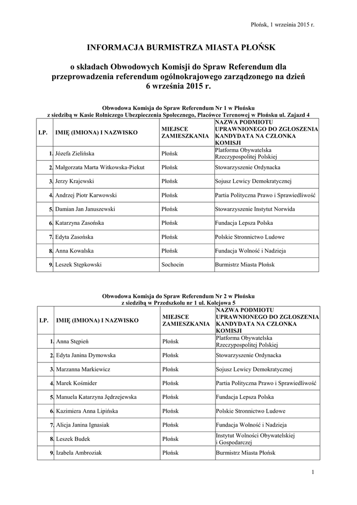 Płońsk, 1 września 2015 r. INFORMACJA BURMISTRZA MIASTA PŁOŃSK o składach Obwodowych Komisji do Spraw Referendum dla przeprowadzenia referendum ogólnokrajowego zarządzonego na dzień 6 września 2015 r. Obwodowa Komisja do Spraw Referendum Nr 1 w Płońsku z siedzibą w Kasie Rolniczego Ubezpieczenia Społecznego, Placówce Terenowej w Płońsku ul. Zajazd 4 NAZWA PODMIOTU MIEJSCE UPRAWNIONEGO DO ZGŁOSZENIA LP. IMIĘ (IMIONA) I NAZWISKO ZAMIESZKANIA KANDYDATA NA CZŁONKA KOMISJI Platforma Obywatelska Płońsk 1. Józefa Zielińska Rzeczypospolitej Polskiej 2. Małgorzata Marta Witkowska-Piekut Płońsk Stowarzyszenie Ordynacka 3. Jerzy Krajewski Płońsk Sojusz Lewicy Demokratycznej 4. Andrzej Piotr Karwowski Płońsk Partia Polityczna Prawo i Sprawiedliwość 5. Damian Jan Januszewski Płońsk Stowarzyszenie Instytut Norwida 6. Katarzyna Zasońska Płońsk Fundacja Lepsza Polska 7. Edyta Zasońska Płońsk Polskie Stronnictwo Ludowe 8. Anna Kowalska Płońsk Fundacja Wolność i Nadzieja 9. Leszek Stępkowski Sochocin Burmistrz Miasta Płońsk Obwodowa Komisja do Spraw Referendum Nr 2 w Płońsku z siedzibą w Przedszkolu nr 1 ul. Kolejowa 5 NAZWA PODMIOTU MIEJSCE UPRAWNIONEGO DO ZGŁOSZENIA LP. IMIĘ (IMIONA) I NAZWISKO ZAMIESZKANIA KANDYDATA NA CZŁONKA KOMISJI Platforma Obywatelska Płońsk 1. Anna Stępień Rzeczypospolitej Polskiej 2. Edyta Janina Dymowska Płońsk Stowarzyszenie Ordynacka 3. Marzanna Markiewicz Płońsk Sojusz Lewicy Demokratycznej 4. Marek Kośmider Płońsk Partia Polityczna Prawo i Sprawiedliwość 5. Manuela Katarzyna Jędrzejewska Płońsk Fundacja Lepsza Polska 6. Kazimiera Anna Lipińska Płońsk Polskie Stronnictwo Ludowe 7. Alicja Janina Ignasiak Płońsk Fundacja Wolność i Nadzieja 8. Leszek Budek Płońsk Instytut Wolności Obywatelskiej i Gospodarczej 9. Izabela Ambroziak Płońsk Burmistrz Miasta Płońsk 1 Płońsk, 1 września 2015 r. Obwodowa Komisja do Spraw Referendum Nr 3 w Płońsku z siedzibą w Zespole Szkół nr 2 im. L. Rutkowskiego ul. ZWM 10 NAZWA PODMIOTU MIEJSCE UPRAWNIONEGO DO ZGŁOSZENIA LP. IMIĘ (IMIONA) I NAZWISKO ZAMIESZKANIA KANDYDATA NA CZŁONKA KOMISJI Platforma Obywatelska Płońsk 1. Katarzyna Chudzyńska Rzeczypospolitej Polskiej 2. Joanna Elżbieta Bukowska Płońsk Stowarzyszenie Ordynacka 3. Andrzej Waldemar Rykowski Płońsk Sojusz Lewicy Demokratycznej 4. Cezary Chodorski Płońsk Partia Polityczna Prawo i Sprawiedliwość 5. Joanna Kalinowska Płońsk Stowarzyszenie Instytut Norwida 6. Justyna Aleksandrowicz Płońsk Fundacja Lepsza Polska 7. Joanna Dorota Przedpełska Płońsk Polskie Stronnictwo Ludowe 8. Jolanta Jadwiga Madany Płońsk Instytut Wolności Obywatelskiej i Gospodarczej 9. Marek Lewandowski Drobin Burmistrz Miasta Płońsk Obwodowa Komisja do Spraw Referendum Nr 4 w Płońsku z siedzibą w Przedsiębiorstwie Gospodarki Komunalnej Sp. z o.o. w Płońsku przy ulicy Mickiewicza 4 NAZWA PODMIOTU UPRAWNIONEGO DO ZGŁOSZENIA MIEJSCE LP. IMIĘ (IMIONA) I NAZWISKO ZAMIESZKANIA KANDYDATA NA CZŁONKA KOMISJI Platforma Obywatelska Płońsk 1. Hanna Makowska-Oporska Rzeczypospolitej Polskiej 2. Maria Magdalena Witkowska Płońsk Stowarzyszenie Ordynacka 3. Iwona Grażyna Łoniewska Płońsk Sojusz Lewicy Demokratycznej 4. Ryszard Antoniewski Płońsk Partia Polityczna Prawo i Sprawiedliwość 5. Marcin Żołądek Płońsk Stowarzyszenie Instytut Norwida 6. Joanna Domańska Płońsk Fundacja Lepsza Polska 7. Dorota Cieszewska Płońsk Polskie Stronnictwo Ludowe 8. Grażyna Irena Zielińska Płońsk Fundacja Wolność i Nadzieja 9. Beata Klik Sarnowo Góry Burmistrz Miasta Płońsk 2 Płońsk, 1 września 2015 r. Obwodowa Komisja do Spraw Referendum nr 5 w Płońsku z siedzibą w Zakładzie Gospodarki Mieszkaniowej (Biblioteka Pedagogiczna) ul. Warszawska 7 NAZWA PODMIOTU MIEJSCE UPRAWNIONEGO DO ZGŁOSZENIA LP. IMIĘ (IMIONA) I NAZWISKO ZAMIESZKANIA KANDYDATA NA CZŁONKA KOMISJI Platforma Obywatelska Płońsk 1. Barbara Bilińska Rzeczypospolitej Polskiej 2. Joanna Janina Piechocka Płońsk Stowarzyszenie Ordynacka 3. Anna Gabryela Rogacka Płońsk Sojusz Lewicy Demokratycznej 4. Marcin Maciej Kośmider Płońsk Partia Polityczna Prawo i Sprawiedliwość 5. Damian Bułka Płońsk Stowarzyszenie Instytut Norwida 6. Henryka Żebrowska Płońsk Fundacja Lepsza Polska 7. Irena Gizińska Płońsk Polskie Stronnictwo Ludowe 8. Emilia Orłowska Płońsk Fundacja Wolność i Nadzieja 9. Jagoda Katarzyna Mrozowicz Płońsk Burmistrz Miasta Płońsk Obwodowa Komisja do Spraw Referendum nr 6 w Płońsku z siedzibą w Gimnazjum Publicznym nr 2 im. Bolesława Chrobrego ul. Wolności 4 NAZWA PODMIOTU MIEJSCE UPRAWNIONEGO DO ZGŁOSZENIA LP. IMIĘ (IMIONA) I NAZWISKO ZAMIESZKANIA KANDYDATA NA CZŁONKA KOMISJI Platforma Obywatelska Płońsk 1. Teresa Danuta Przyborowska Rzeczypospolitej Polskiej 2. Danuta Modesta Borowska Płońsk Stowarzyszenie Ordynacka 3. Danuta Marianna Chodorska Płońsk Sojusz Lewicy Demokratycznej 4. Małgorzata Jaszczur Płońsk Partia Polityczna Prawo i Sprawiedliwość 5. Danuta Teresa Lewandowska Płońsk Fundacja Lepsza Polska 6. Agnieszka Gabriela Graczyk Płońsk Polskie Stronnictwo Ludowe 7. Katarzyna Weronika Szatkowska Płońsk Fundacja Wolność i Nadzieja 8. Elżbieta Kruszyńska Płońsk Instytut Wolności Obywatelskiej i Gospodarczej 9. Anna Małgorzata Czerniawska Płońsk Burmistrz Miasta Płońsk 3 Płońsk, 1 września 2015 r. Obwodowa Komisja do Spraw Referendum nr 7 w Płońsku z siedzibą w Zespole Szkół Ogólnokształcących ul. Płocka 56 NAZWA PODMIOTU MIEJSCE UPRAWNIONEGO DO ZGŁOSZENIA LP. IMIĘ (IMIONA) I NAZWISKO ZAMIESZKANIA KANDYDATA NA CZŁONKA KOMISJI Platforma Obywatelska Płońsk 1. Milena Beata Osiecka Rzeczypospolitej Polskiej 2. Izabela Podgórska Płońsk Stowarzyszenie Ordynacka 3. Małgorzata Kurzątkowska Płońsk Partia Polityczna Prawo i Sprawiedliwość 4. Michał Żabowski Płońsk Stowarzyszenie Instytut Norwida 5. Izabela Laskowska Płońsk Fundacja L
