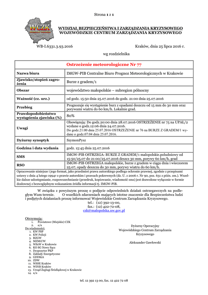 Strona 1 z 1 WYDZIAŁ BEZPIECZEŃSTWA I ZARZĄDZANIA KRYZYSOWEGO WOJEWÓDZKIE CENTRUM ZARZĄDZANIA KRYZYSOWEGO WB-I.6331.3.93.2016 Kraków, dnia 25 lipca 2016 r. wg rozdzielnika Ostrzeżenie meteorologiczne Nr 77 Nazwa biura IMGW-PIB Centralne Biuro Prognoz Meteorologicznych w Krakowie Zjawisko/stopień zagrożenia Burze z gradem/1 Obszar województwo małopolskie – subregion północny Ważność (cz. urz.) od godz. 15:50 dnia 25.07.2016 do godz. 21:00 dnia 25.07.2016 Przebieg Prognozuje się wystąpienie burz z opadami deszczu od 15 mm do 30 mm oraz porywami wiatru do 60 km/h. Lokalnie grad. Prawdopodobieństwo wystąpienia zjawiska (%) 80% Uwagi Obowiązują: Do godz.20:00 dnia 28.07.2016 OSTRZEŻENIE nr 75 na UPAŁ/2 wydane o godz.12:06 dnia 24.07.2016. Do godz.21:00 dnia 25.07.2016 OSTRZEŻENIE nr 76 na BURZE Z GRADEM/1 wydane o godz.07:04 dnia 25.07.2016. Dyżurny synoptyk SzymonPysz Godzina i data wydania godz. 15:45 dnia 25.07.2016 IMGW-PIB OSTRZEGA: BURZE Z GRADEM/1 malopolskie.poludniowy od 15:50/25.07 do 21:00/25.07.2016 deszcz 30 mm, porywy 60 km/h, grad IMGW-PIB OSTRZEGA małopolskie, burze z gradem w ciągu dnia i wieczorem 25.07, opady deszczu do 30 mm, porywy wiatru do 60 km/h. SMS RSO Opracowanie niniejsze i jego format, jako przedmiot prawa autorskiego podlega ochronie prawnej, zgodnie z przepisami ustawy z dnia 4 lutego 1994r o prawie autorskim i prawach pokrewnych (dz. U. z 2006 r. Nr 90, poz. 631 z późn. zm.). Wszelkie dalsze udostępnianie, rozpowszechnianie (przedruk, kopiowanie, wiadomość sms) jest dozwolone wyłącznie w formie dosłownej z bezwzględnym wskazaniem źródła informacji tj. IMGW-PIB. W związku z powyższym proszę o podjęcie odpowiednich działań ostrzegawczych na podległym Wam terenie. O wszelkich zdarzeniach mających istotne znaczenie dla Bezpieczeństwa ludzi i podjętych działaniach proszę informować Wojewódzkie Centrum Zarządzania Kryzysowego. tel.: (12) 392-13-00, fax.: (12) 422-72-08, [email protected] Otrzymują: 1. Powiatowe (Miejskie) CZK 2. a/a Do wiadomości: 1. KW PSP 2. KW Policji 3. RZGW 4. MZMiUW 5. WSzW w Krakowie 6. KO SG Nowy Sącz 7. Dyspozytor PKP 8. Zakłady Energetyczne 9. GDDKiA 10. ZDW 11. WSSE Kraków 12. WINB Kraków 13. Urząd Żeglugi Śródlądowej w Krakowie 14. a/a Dyżurny Operacyjny Wojewódzkiego Centrum Zarządzania Kryzysowego tel. 12 392 13 00, fax. 12 422 72 08 Aleksander Gawłowski