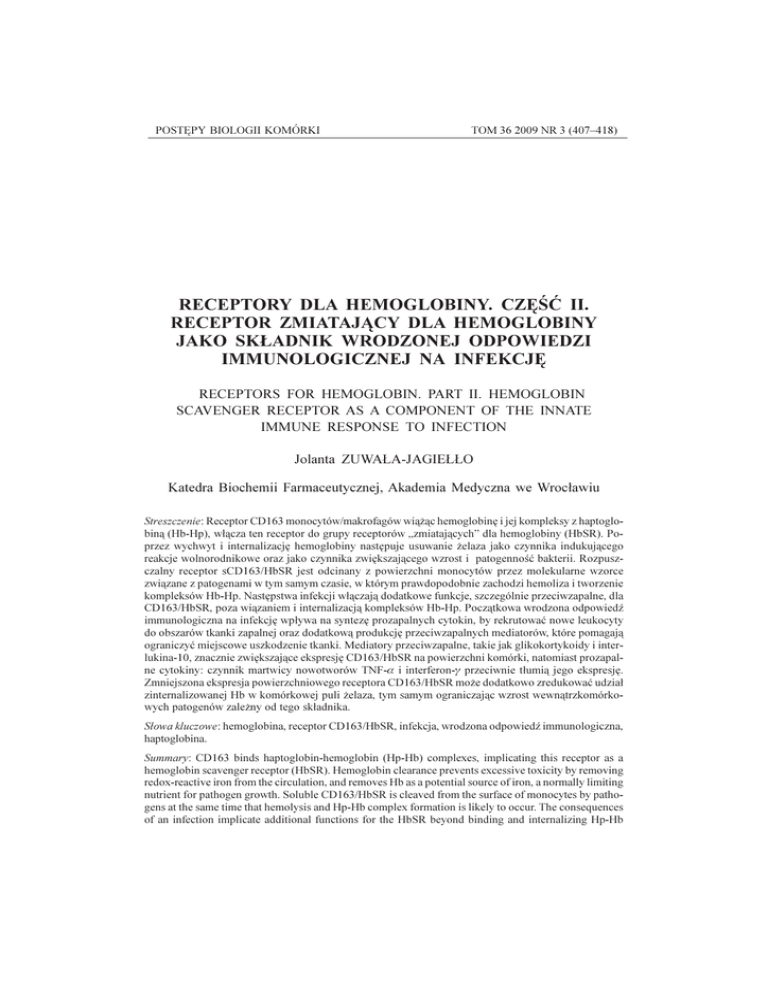HbSR SK£ADNIK ODPOWIEDZI IMMUNOLOGICZNEJ 407 POSTÊPY BIOLOGII KOMÓRKI TOM 36 2009 NR 3 (407418) RECEPTORY DLA HEMOGLOBINY. CZÊÆ II. RECEPTOR ZMIATAJ¥CY DLA HEMOGLOBINY JAKO SK£ADNIK WRODZONEJ ODPOWIEDZI IMMUNOLOGICZNEJ NA INFEKCJÊ RECEPTORS FOR HEMOGLOBIN. PART II. HEMOGLOBIN SCAVENGER RECEPTOR AS A COMPONENT OF THE INNATE IMMUNE RESPONSE TO INFECTION Jolanta ZUWA£A-JAGIE££O Katedra Biochemii Farmaceutycznej, Akademia Medyczna we Wroc³awiu Streszczenie: Receptor CD163 monocytów/makrofagów wi¹¿¹c hemoglobinê i jej kompleksy z haptoglobin¹ (Hb-Hp), w³¹cza ten receptor do grupy receptorów zmiataj¹cych dla hemoglobiny (HbSR). Poprzez wychwyt i internalizacjê hemoglobiny nastêpuje usuwanie ¿elaza jako czynnika indukuj¹cego reakcje wolnorodnikowe oraz jako czynnika zwiêkszaj¹cego wzrost i patogennoæ bakterii. Rozpuszczalny receptor sCD163/HbSR jest odcinany z powierzchni monocytów przez molekularne wzorce zwi¹zane z patogenami w tym samym czasie, w którym prawdopodobnie zachodzi hemoliza i tworzenie kompleksów Hb-Hp. Nastêpstwa infekcji w³¹czaj¹ dodatkowe funkcje, szczególnie przeciwzapalne, dla CD163/HbSR, poza wi¹zaniem i internalizacj¹ kompleksów Hb-Hp. Pocz¹tkowa wrodzona odpowied immunologiczna na infekcjê wp³ywa na syntezê prozapalnych cytokin, by rekrutowaæ nowe leukocyty do obszarów tkanki zapalnej oraz dodatkow¹ produkcjê przeciwzapalnych mediatorów, które pomagaj¹ ograniczyæ miejscowe uszkodzenie tkanki. Mediatory przeciwzapalne, takie jak glikokortykoidy i interlukina-10, znacznie zwiêkszaj¹ce ekspresjê CD163/HbSR na powierzchni komórki, natomiast prozapalne cytokiny: czynnik martwicy nowotworów TNF-a i interferon-g przeciwnie t³umi¹ jego ekspresjê. Zmniejszona ekspresja powierzchniowego receptora CD163/HbSR mo¿e dodatkowo zredukowaæ udzia³ zinternalizowanej Hb w komórkowej puli ¿elaza, tym samym ograniczaj¹c wzrost wewn¹trzkomórkowych patogenów zale¿ny od tego sk³adnika. S³owa kluczowe: hemoglobina, receptor CD163/HbSR, infekcja, wrodzona odpowied immunologiczna, haptoglobina. Summary: CD163 binds haptoglobin-hemoglobin (Hp-Hb) complexes, implicating this receptor as a hemoglobin scavenger receptor (HbSR). Hemoglobin clearance prevents excessive toxicity by removing redox-reactive iron from the circulation, and removes Hb as a potential source of iron, a normally limiting nutrient for pathogen growth. Soluble CD163/HbSR is cleaved from the surface of monocytes by pathogens at the same time that hemolysis and Hp-Hb complex formation is likely to occur. The consequences of an infection implicate additional functions for the HbSR beyond binding and internalizing Hp-Hb 408 J. ZUWA£A-JAGIE££O complexes, as this receptor is cleaved from the surface of monocytes during infections at a time when HpHb complexes are forming, and complex clearance is imperative. The initial innate immune response to infection includes the release of proinflammatory cytokines to recruit new leukocytes to areas of inflamed tissue, in addition to the production of anti-inflammatory mediators such as IL-10, which help to limit damage to the local tissue environment. CD163/HbSR is involved in the resolution of inflammation; antiinflammatory mediator IL-10 markedly increases expression of CD163/HbSR on the cell surface, and the pro-inflammatory cytokines TNF-a and IFN-g suppress CD163/HbSR expression. Decreased surface expression of CD163/HbSR may reduce the contribution of Hb internalization to intracellular iron pools, thereby limiting the growth of intracellular pathogens dependent on iron for replication. Key words: hemoglobin, receptor CD163/HbSR, infection, innate immune response, haptoglobin. WSTÊP Obfitoæ hemoglobiny (Hb), która zawiera 80% ¿elaza organizmu, czyni j¹ atrakcyjnym ród³em ¿elaza dla patogenów, pomimo jej lokalizacji w czerwonych krwinkach w uk³adzie kr¹¿enia. Patogeny mog¹ uzyskaæ dostêp do wolnej hemoglobiny w drodze transcytozy przez warstwê nab³onka, zaka¿enia przez otwarte rany [31] lub ekspansji z ognisk zaka¿enia m.in. w sepsie [39]. W dodatku, niektóre Gramdodatnie [2,15,1] i Gram-ujemne bakterie [26,9], wraz z licznymi gatunkami Candida [32] uwalniaj¹ podczas infekcji hemolizyny, które odpowiadaj¹ za obecnoæ wolnej Hb we krwi kr¹¿¹cej i tkance ródmi¹¿szowej. Chocia¿ Hb jest szybko wi¹zana przez haptoglobinê w kompleks (Hb-Hp), to tworzenie tego kompleksu nie zawsze hamuje zdolnoæ patogenów do wykorzystania hemoglobiny jako ród³a ¿elaza [53]. Niektóre patogeny zachowuj¹ nawet wiêksz¹ zdolnoæ wykorzystania ¿elaza zawartego w kompleksach Hb-Hp lub w cz¹steczce hemu ni¿ w samej hemoglobinie podczas infekcji [52,56]. Wychwyt i endocytoza Hb czy kompleksów Hb-Hp przez makrofagowy receptor CD163/HbSR jest pierwsz¹ fizjologiczn¹ funkcj¹ przypisan¹ bia³ku CD163 w grupie B receptorów zmiataj¹cych dla hemoglobiny (HbSR) [29]. Natomiast kontrola ekspresji receptora CD163/HbSR przez czynniki ostrej fazy sugeruje tak¿e immunoregulacyjne funkcje tej cz¹steczki. Szersze informacje dotycz¹ce powierzchniowego receptora CD163/HbSR zosta³y zamieszczone w czêci I cyklu pt.: Receptory dla hemoglobiny: budowa i funkcje. CD163/HbSR zosta³ niedawno zidentyfikowany jako rozpuszczalne bia³ko w nads¹czu kultur komórkowych monocytów/makrofagów i w osoczu krwi ludzkiej [57,44]. Rozpuszczalna forma CD163/HbSR (sCD163/HbSR) (ang. soluble hemoglobin scavenger receptor) powstaje przez odcinanie zewn¹trzkomórkowej domeny od formy b³onowej receptora CD163/HbSR. Podczas gdy forma b³onowa CD163/HbSR jest g³ównie odpowiedzialna za usuwanie kompleksów Hb-Hp z krwi, rozpuszczalna forma sCD163/HbSR wydaje siê byæ zaanga¿owana zarówno w usuwanie kompleksów Hb-Hp, jak i odpowied przeciwzapaln¹ pónej fazy. Zaobserwowano, ¿e ¿elazo (pochodz¹ce z rozk³adu Hb) jako kofaktor du¿ej liczby enzymów jest wa¿nym sk³adnikiem od¿ywczym bakterii. Posocznica, zapalenie p³uc oraz 