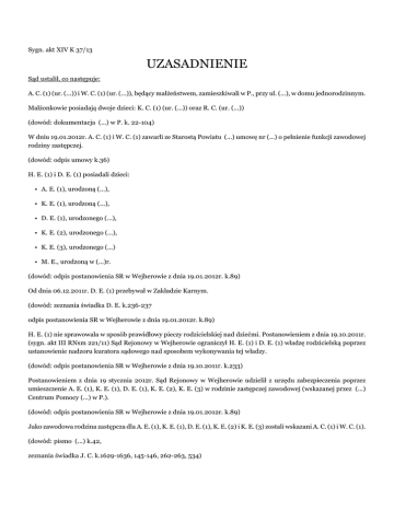Sygn. akt XIV K 37/13 UZASADNIENIE Sąd ustalił, co następuje: A. C. (1) (ur. (...)) i W. C. (1) (ur. (...)), będący małżeństwem, zamieszkiwali w P., przy ul. (...), w domu jednorodzinnym. Małżonkowie posiadają dwoje dzieci: K. C. (1) (ur. (...)) oraz R. C. (ur. (...)) (dowód: dokumentacja (...) w P. k. 22-104) W dniu 19.01.2012r. A. C. (1) i W. C. (1) zawarli ze Starostą Powiatu (...) umowę nr (...) o pełnienie funkcji zawodowej rodziny zastępczej. (dowód: odpis umowy k.36) H. E. (1) i D. E. (1) posiadali dzieci: • A. E. (1), urodzoną (...), • K. E. (1), urodzoną (...), • D. E. (1), urodzonego (...), • K. E. (2), urodzonego (...), • K. E. (3), urodzonego (...) • M. E., urodzoną w (...)r. (dowód: odpis postanowienia SR w Wejherowie z dnia 19.01.2012r. k.89) Od dnia 06.12.2011r. D. E. (1) przebywał w Zakładzie Karnym. (dowód: zeznania świadka D. E. k.236-237 odpis postanowienia SR w Wejherowie z dnia 19.01.2012r. k.89) H. E. (1) nie sprawowała w sposób prawidłowy pieczy rodzicielskiej nad dziećmi. Postanowieniem z dnia 19.10.2011r. (sygn. akt III RNsm 221/11) Sąd Rejonowy w Wejherowie ograniczył H. E. (1) i D. E. (1) władzę rodzicielską poprzez ustanowienie nadzoru kuratora sądowego nad sposobem wykonywania tej władzy. (dowód: odpis postanowienia SR w Wejherowie z dnia 19.10.2011r. k.233) Postanowieniem z dnia 19 stycznia 2012r. Sąd Rejonowy w Wejherowie udzielił z urzędu zabezpieczenia poprzez umieszczenie A. E. (1), K. E. (1), D. E. (1), K. E. (2), K. E. (3) w rodzinie zastępczej zawodowej (wskazanej przez (...) Centrum Pomocy (...) w P.). (dowód: odpis postanowienia SR w Wejherowie z dnia 19.01.2012r. k.89) Jako zawodowa rodzina zastępcza dla A. E. (1), K. E. (1), D. E. (1), K. E. (2) i K. E. (3) zostali wskazani A. C. (1) i W. C. (1). (dowód: pismo (...) k.42, zeznania świadka J. C. k.1629-1636, 145-146, 262-263, 534) Dzieci zostały umieszczone u A. i W. C. (1) w dniu 20.01.2012r., z wyjątkiem K. E. (3), który dołączył do rodzeństwa po otrzymaniu pomocy medycznej. (dowód: zeznania świadka H. E. k. 1316-1325, 154) zeznania świadka M. G. k. 1730-1732, 159) zeznania świadka J. C. k. k.1629-1636, 145-146, 262-263, 534) Dzieci przyjęte przez A. i W. C. (1) w ramach rodziny zastępczej były zaniedbane wychowawczo i środowiskowo. Wymagały nauki higieny i podstawowych zasad zachowań, zapewnienia opieki lekarskiej. (dowód: wyjaśnienia oskarżonego W. C. k. 1256-1260, 1310-1315, 318, 333, 544-545, 725-733, 602 wyjaśnienia oskarżonej A. C. k.1254-1256, 311-312, 326, 550-553,601-602, 610-611 zeznania świadka K. C. k.284-286, 713-716) Po jakimś czasie od przybycia dzieci do domu A. i W. C. (1), poczynając od kwietnia 2012r., A. C. (1) i W. C. (1) zaczęli stosować wobec dzieci przemoc fizyczną. Różnego rodzaju agresywne zachowania wobec dzieci miały miejsce z dużą częstotliwością, kilka razy w tygodniu. (dowód: zeznania świadka K. C. k. 284-286, 713-716) A. C. (1) biła dzieci: A. E. (1), K. E. (1), K. E. (2), D. E. (1), a także K. E. (3) uderzając ich ręką i pięścią w różne części ciała. (dowód: wyjaśnienia oskarżonej A. C. k. 1254-1256, 311-312, 326, 550-553,601-602, 610-611 wyjaśnienia oskarżonego W. C. k. 1256-1260, 1310-1315, 318, 333, 544-545, 725-733, 602 zeznania świadka A. E. k.687-691 zeznania świadka K. C. k. 284-286, 713-716) Do bicia dzieci A. C. (1) używała też pasa. K. E. (1) A. C. (1) zbiła pasem przekładając przez poręcz schodów ją na schodach. Również kapeć (laczek) służył A. C. (1) do bicia dzieci. (dowód: wyjaśnienia oskarżonej A. C. k. 1254-1256, 311-312, 326, 550-553,601-602, 610-611 wyjaśnienia oskarżonego W. C. k. 1256-1260, 1310-1315, 318, 333, 544-545, 725-733, 602 zeznania świadka A. E. k. 687-691 zeznania świadka K. C. k. 284-286, 713-716) Dzieci były też przez A. C. (1) kopane. D., K. i A. E. (1) byli kopani w brzuch. K. E. (2) A. C. (1) kopała w pupę. Zdarzyło się także, iż D. E. (1) i A. E. (1) mieli za karę stać przy ścianie, a gdy dzieci stały przy ścianie, A. C. (1) kopała je. (dowód: zeznania świadka K. C. k. 284-286, 713-716) Zdarzało się, że A. C. (1) dusiła K. E. (2), K. E. (1), A. E. (1), K. E. (3) chwytając dziecko ręką za szyję i ściskając, czy podnosząc do góry przy ścianie lub też rzucając na podłogę. (dowód: zeznania świadka K. C. k. 284-286, 713-716 zeznania świadka A. E. k. 687-691) Dzieci były także zabierane do pomieszczenia kotłowni w domu, gdzie A. C. (1) biła je. D. E. (1) był przez A. C. (1) w pomieszczeniu kotłowni bity pogrzebaczem, która uderzała go w okolice nóg, pupy, głowy. (dowód: wyjaśnienia oskarżonego W. C. k. 1256-1260, 1310-1315, 318, 333, 544-545, 725-733, 602 wyjaśnienia oskarżonej A. C. k. 1254-1256, 311-312, 326, 550-553,601-602, 610-611 zeznania świadka K. C. k. 284-286, 713-716) Do bicia dzieci A. C. (1) używała również rury od odkurzacza. Przedmiotem tym zbity został D. E. (1) - uderzenia kierowane były w nogi, głowę lub tylną część ciała. (dowód: wyjaśnienia oskarżonego W. C. k. 1256-1260, 1310-1315, 318, 333, 544-545, 725-733, 602) K. E. (3) był przez A. C. (1) bity, kopany i duszony. (dowód: zeznania świadka K. C. k. 284-286, 713-716) A. C. (1) popychała dzieci. K. popchnęła tak, że dziewczynka uderzyła o drzwi do pomieszczenia. D. E. (1) popchnęła w obecności P. P. (1). (dowód: zeznania świadka K. C. k. 284-286, 713-716) zeznania świadka P. P. k.1383-1385, 134-136, 381-382v) A. E. (1) i D. E. (1) A. C. (1) przypalała zapalniczką. Dzieci były bez ubrań, A. C. (1) wyjęła zapalniczkę i zaczęła przypalać A. E. (1) i D. E. (1) w różnych miejscach: w okolicach pasa, na udach, przy twarzy. (dowód: zeznania świadka A. E. k. 687-691 wyjaśnienia oskarżonego W. C. k. 1256-1260, 1310-1315, 318, 333, 544-545, 725-733, 602) We wrześniu 2012r. (do dnia 12.09.2012r.) A. C. (1) uderzyła pięścią w twarz, w okol