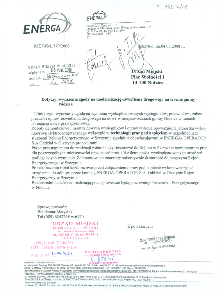 ~ i. 3tl:l-1!10>] I EN~ ENERGA - Ore.!;;.!..~\ ..,. _ ". . "e,> OdcziClt w Ols.ztynl~~h.t..::jLdl Enel';v.yl,;.l..II)~"'" J ul Po!na 28, 12-10:j Szc.zytno fNfRG~ o 5 MAR. ZOOB podplS ·.. ·•. lal ~ / zyton, do.04.03.2008 f.. I,N \~iDZI(V URZ4.D MI[.!SKi wPtYne~~O :0 ~'~ 53,.000-11·90 ,;ICJ zq~~jSki Plac Wothosci 1 13-100 Nidzica . js:Z'f: .. z nk: . Dotyczy: wyrazenia zgody na modernizacj~ oswietlenia drogowego na terenie gminy Nidzica Niniejszym wyrazamy zgod~ na wymian~ wyeksploatowanych wysi~gnikow, przewodow, zabezpieczen i opraw oswietlenia drogowego na nowe w miejscowosciach gminy Nidzica w ramach istniejqcej mocy przyhtczeniowej. Roboty demontazowe i montaz nowych wysi~gnikow i opraw wykona upowaznionajednostka wykonawstwa elektroenergetycznego wylqcznie w technologii prac pod napi~ciemw uzgodnieniu ze sluzbami Rejonu Energetycznego w Szczytnie zgodnie z obowiqzujqcymi w ENERGA- OPERATOR S.A.Oddzial w Olsztynie procedurami. Przed przystqpieniem do realizacji robot nalezy dostarczyc do Rejonu w Szczytnie harmonogram prac dla poszczegolnych miejscowosci oraz spisac protokol z demontazu wyeksploatowanych urzqdzen podlegajqcych wymianie. Zdemontowane materialy sukcesywnie dostarczac do magazynu Rejonu Energetycznego w Szczytnie. Po zakonczeniu robot kaZdorazowo przed zalqczeniem opraw pod napi((cie wykonawca zglosi urzqdzenia do odbioru przez komisj~ ENERGA-OPERATOR S.A. Oddzial w Olsztynie Rejon Energetyczny w Szczytnie. Bezposredni nadzor nad realizacjqprac sprawowac b~dqpracownicy Posterunku Energetycznego wNidzicy. Spraw~ prowadzi: Waldemar Matysiak Tel.(089) 6242268 w.6120 URZAD 13-100 MIEJSKI Nidzica, Pl. Wolnosci 1 woj. warminsko-mazurskie tel. (089) 625-07-10, lax 625-07-11 ,1 000687764 ST~IERDZAM KOpl OOpl I AI. 1l1ZIC<l d 'l-ca DYFt' \~ d~ $( I I, 11'1.()'1. .. _. . ._.__.._. '~1'0.~' n" r:. owD-J( dJ... z£Jr .. Idr6~:rYCh D_ _ mar t_,,~· -' " EJONU H " ~rzysztot W6dkiewicZ IOZ .. \, PODINSPEKTOR , ... . . .._.__ .. .__.. ENERGA • OPERATOR SA Ter Brzo ?)wska ul. Marynarki Polskiej 130,80-557 Gdansk, tel.: +48583473013, faks: +48 58 3010152, www.energa·[email protected] Bank Handlowy w Warszawie, nr konta: 98 1030 15080000000503936003, NIP: 583-000-11-90, Regan 190275904 ... .....__... .... -- §.'.t~.~~j~n.t:J~~.§~~~.S.l5.::':<i.\n.!l~.~ Gdansku.~1.~Y-~:I:~~\~51.?P2~~~Y Krajowe9.2J3~~.!IIJ..§s.c!l?wego,KRS OOOO~';>i§§.,.~pltalzaklad()~~pI~~()ny..?9.~.}Ol 400 zl. ENERGA - OPERATOR SA Oddzia! w Olsztynie ul. Tuwima 6.10-950 Olsztyn, tel.: +48 89 52315 55, faks: +488952704 . ..~.~rl~ E3..I"I::1 .. §c"'_c>!QI~J:!y.rl,rl~kC>rl!~: ..?!lQ?O.OQ!?OQO9.~Q.1~ll.QOQ.Q039.,I\I!.I" .. ?~~:OOl,l::!!:~O,.~_~.9()rll~O?T~~9.~:OOO?~ __.............._ Rejon Energetyczny ul. Polna 28,12-100 Szczytno Szczytno, tel.: +48 896242267,68,69, -'.'.'-"-'- 27, [email protected] faks: +48896243104, __................ Bank BPH SA o/Olsztyn, nr konta: 21106000760000401380000020 . _ .
