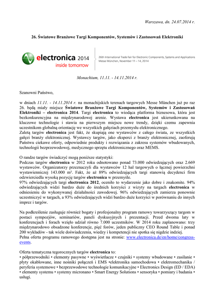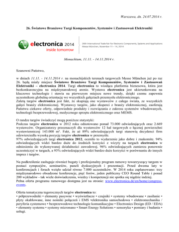 Warszawa, dn. 24.07.2014 r. 26. Światowe Branżowe Targi Komponentów, Systemów i Zastosowań Elektroniki Monachium, 11.11. - 14.11.2014 r. Szanowni Państwo, w dniach 11.11. - 14.11.2014 r. na monachijskich terenach targowych Messe München już po raz 26. będą miały miejsce Światowe Branżowe Targi Komponentów, Systemów i Zastosowań Elektroniki – electronica 2014. Targi electronica to wiodąca platforma biznesowa, która jest bezkonkurencyjna na międzynarodowej arenie. Wystawa electronica jest ukierunkowana na kluczowe technologie i stawia na pierwszym miejscu nowe trendy, dzięki czemu zapewnia uczestnikom globalną orientację we wszystkich gałęziach przemysłu elektronicznego. Zaletą targów electronica jest fakt, że skupiają one wystawców z całego świata, ze wszystkich gałęzi branży elektronicznej. Wystawcy targów, jako eksperci z branży elektronicznej, zaoferują Państwu ciekawe oferty, odpowiednie produkty i rozwiązania z zakresu systemów wbudowanych, technologii bezprzewodowej, medycznego sprzętu elektronicznego oraz MEMS. O randze targów świadczyć mogą poniższe statystyki: Podczas targów electronica w 2012 roku odnotowano ponad 73.000 odwiedzających oraz 2.669 wystawców. Organizatorzy przeznaczyli dla wystawców 12 hal targowych o łącznej powierzchni wystawienniczej 143.000 m². Fakt, że aż 89% odwiedzających targi stanowią decydenci firm odzwierciedla wysoką pozycję targów electronica w przemyśle. 97% odwiedzających targi electronica 2012, oceniło to wydarzenie jako dobre i znakomite. 94% odwiedzających widzi bardzo duże do średnich korzyści z wizyty na targach electronica w odniesieniu do wykonywanej działalności zawodowej. 96% odwiedzających zamierza ponownie uczestniczyć w targach, a 93% odwiedzających widzi bardzo duże korzyści w porównaniu do innych imprez i targów. Na podkreślenie zasługuje również bogaty i profesjonalny program ramowy towarzyszący targom w postaci sympozjów, seminariów, paneli dyskusyjnych i prezentacji. Przed dwoma laty w konferencjach i forach wzięło udział równo 7.000 uczestników. W 2014 roku zaplanowano: trzy międzynarodowo obsadzone konferencje, pięć forów, jeden publiczny CEO Round Table i ponad 200 wykładów - tak wiele doświadczenia, wiedzy i kompetencji nie spotka się nigdzie indziej. Pełna oferta programu ramowego dostępna jest na stronie: www.electronica.de/en/home/congressevents. Oferta tematyczna tegorocznych targów electronica to: • półprzewodniki • elementy pasywne • wyświetlacze • czujniki • systemy wbudowane • zasilanie • płyty okablowane, inne nośniki połączeń i EMS •elektronika samochodowa • elektromechanika / peryferia systemowe • bezprzewodowe technologie komunikacyjne • Electronics Design (ED / EDA) • elementy systemu • systemy micronano • Smart Energy Solutions • sensoryka • pomiary i badania • usługi. Procedura zamawiania biletów wstępu na targi electronica 2014: Bilety wstępu na targi można zakupić na miejscu w kasach targowych oraz w przedsprzedaży poprzez zarejestrowanie się i złożenie zamówienia w internecie na stronie www.electronica.de. Zachęcamy Państwa do skorzystania z zakupu biletów w przedsprzedaży, co zaoszczędzi zarówno czas jak i pieniądze. Ceny biletów wstępu na targi electronica 2014: Cena w przedsprzedaży Cena w kasach Bilet 1-dniowy (jednorazowe wejście)* 27,50 € 34,50 € Bilet 2-dniowy* 46,50 € 58,00 € Bilet na całe targi* 63,00 € 78,00 € * Katalog wystawców wliczony jest w cenę biletu wstępu i można go odebrać przy wejściu na targi. Katalog będzie dostępny do wyczerpania nakładu. Uwaga: Podczas rejestracji prosimy nie używać polskich znaków! Tak wygląda procedura zamawiania i odbioru biletów w przedsprzedaży: Rejestrujecie się Państwo na stronie targów www.electronica.de, zakładka Vor visitors // Für Besucher, a następnie Prices & Registration // Preise & Registrierung oraz Online-TicketRegistration // Online-Ticket Registrierung klikając w: Purchase ticket/Reedem voucher // Ticket kaufen/Gutschein einlösen przechodzicie Państwo do procesu rejestracji. Po udanym wygenerowaniu loginu i hasła oraz po udzieleniu odpowiedzi na kilka pytań w systemie rejestracyjnym można dokonać zamówienia na bilety wstępu na targi. Płatność za zamówione bilety wstępu jest możliwa wyłącznie kartą kredytową. • Złożone przez Państwa zamówienie automatycznie trafia do organizatora targów – spółki Messe München GmbH, który jest odpowiedzialny za jego realizację. • Po dokonaniu płatności kartą kredytową na podany przez Państwa w trakcie rejestracji adres emailowy przesyłany jest bilet wstępu (Print@home Ticket). • Bilet należy wydrukować i koniecznie zabrać ze sobą na targi do Monachium. • Wydrukowany bilet wstępu (Print@home Ticket) jest jednocześnie fakturą VAT, dlatego ważne jest, żeby przy rejestracji podać bezbłędne i kompletne dane Państwa firmy! Targi electronica 2014 odbywać się będą w następujących godzinach: wtorek - czwartek 9:00 – 18:00 piątek 9:00 – 17:00 Więcej informacji o targach oraz na temat procedury zamawiania biletów wstępu na targi uzyskają Państwo w: Biurze Targów Monachijskich w Polsce ul. Biała 4, 00-895 Warszawa kontakt: Agnieszka Lenartowicz tel. 22 620 44 15, faks: 22 624 94 78 e-mail: [email protected] lub na stronie: www.electronica.de Zapraszamy do Monachium!