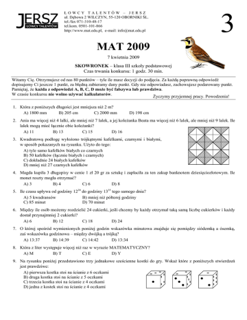ŁOWCY TALENTÓW – JERSZ ul. Dębowa 2 WILCZYN, 55-120 OBORNIKI ŚL. tel./fax 071-310-48-17 tel.kom. 0501-101-866 http://www.mat.edu.pl, e-mail: [email protected] 3 MAT 2009 7 kwietnia 2009 SKOWRONEK – klasa III szkoły podstawowej Czas trwania konkursu: 1 godz. 30 min. Witamy Cię. Otrzymujesz od nas 80 punktów – tyle ile masz decyzji do podjęcia. Za każdą poprawną odpowiedź dopisujemy Ci jeszcze 1 punkt, za błędną zabieramy dany punkt. Gdy nie odpowiadasz, zachowujesz podarowany punkt. Pamiętaj, że każda z odpowiedzi A, B, C, D może być fałszywa lub prawdziwa. W czasie konkursu nie wolno używać kalkulatorów. Życzymy przyjemnej pracy. Powodzenia! 1. Która z poniższych długości jest mniejsza niż 2 m? A) 1800 mm B) 205 cm C) 2000 mm D) 198 cm 2. Ania ma więcej niż 4 lalki, ale mniej niż 7 lalek, a jej koleżanka Beata ma więcej niż 6 lalek, ale mniej niż 9 lalek. Ile lalek mogą mieć łącznie obie koleżanki? A) 11 B) 13 C) 15 D) 16 3. Kwadratową podłogę wyłożono trójkątnymi kafelkami, czarnymi i białymi, w sposób pokazanych na rysunku. Użyto do tego: A) tyle samo kafelków białych co czarnych B) 50 kafelków (łącznie białych i czarnych) C) dokładnie 24 białych kafelków D) mniej niż 27 czarnych kafelków 4. Magda kupiła 3 długopisy w cenie 1 zł 20 gr za sztukę i zapłaciła za ten zakup banknotem dziesięciozłotowym. Ile monet reszty mogła otrzymać? A) 3 B) 4 C) 6 D) 8 5. Ile czasu upływa od godziny 1220 do godziny 1335 tego samego dnia? A) 5 kwadransów B) mniej niż półtorej godziny C) 85 minut D) 70 minut 6. Między ile osób możemy rozdzielić 24 cukierki, jeśli chcemy by każdy otrzymał taką samą liczbę cukierków i każdy dostał przynajmniej 2 cukierki? A) 6 B) 12 C) 18 D) 24 7. O której spośród wymienionych poniżej godzin wskazówka minutowa znajduje się pomiędzy siódemką a ósemką, zaś wskazówka godzinowa – między dwójką a trójką? A) 13:37 B) 14:39 C) 14:42 D) 13:34 8. Która z liter występuje więcej niż raz w wyrazie MATEMATYCZNY? A) M B) T C) E D) Y 9. Na rysunku poniżej przedstawiono trzy jednakowe sześcienne kostki do gry. Wskaż które z poniższych stwierdzeń jest prawdziwe: A) pierwsza kostka stoi na ścianie z 6 oczkami B) druga kostka stoi na ścianie z 5 oczkami C) trzecia kostka stoi na ścianie z 4 oczkami D) jedna z kostek stoi na ścianie z 4 oczkami 10. Banany rozłożono na stole w trzech koszykach. Jeśli liczbę bananów w pierwszym koszu pomnożymy przez liczbę bananów w drugim koszu, to otrzymamy liczbę bananów w trzecim koszu. Jaką liczbę możemy otrzymać mnożąc liczbę bananów w pierwszym koszu, liczbę bananów w drugim koszu i liczbę bananów w trzecim koszu? A) 32 B) 36 C) 48 D) 49 11. W pewnym sklepie twaróg pakowany jest w dwa rodzaje opakowań: małe, zawierające 20 dag twarogu i duże, zawierające 35 dag twarogu. Mama kupiła w tym sklepie kilka opakowań twarogu. Ile mógł ważyć ser zakupiony przez mamę? A) 90 dag B) 2 kg C) 50 dag D) 1 kg 25 dag 12. Od stada słoni liczącego 16 osobników, odłączyły się 3 samice. Ile samic może być teraz w stadzie jeśli pierwotnie samców było mniej niż samic? A) 5 B) 6 C) 7 D) 8 13. Ile czekoladek mogą zawierać dwa jednakowe opakowania czekoladek, jeśli pojedyncze opakowanie zawiera więcej niż 15 czekoladek, ale mniej niż 20 czekoladek? A) 30 B) 35 C) 36 D) 40 14. Jeśli pierwszy dzień lutego pewnego roku wypadł w poniedziałek, to w jakim dniu tygodnia mógł wypaść ostatni dzień lutego (w owym roku)? A) w poniedziałek B) we wtorek C) w sobotę D) w niedzielę 15. Tarczę zegara z rysunku obok można jednym prostym cięciem podzielić na dwie części (nie rozcinając żadnej z dwunastu liczb) w taki sposób, aby: 12 A) suma liczb w każdej z obu części była taka sama 11 1 B) suma liczb w jednej z części była równa 30 10 2 C) w jednej części znalazły się liczby 1 i 7, a w drugiej części liczby 3 i 9 D) w jednej części było 5 liczb, a w drugiej części 7 liczb 9 3 16. Kasia jest dokładnie dwa razy starsza od swojego młodszego brata. W jakim wieku może być brat Kasi, jeśli wiadomo, że różnica wieku między dwójką rodzeństwa jest mniejsza niż 5 lat? A) 3 lata B) 4 lata C) 5 lat D) 6 lat 8 4 7 6 5 17. Torebkę cukierków chcemy rozdzielić między Alicję i jej trzech braci w taki sposób, by każde dziecko dostało więcej niż 10 cukierków i każde dostało inną liczbę cukierków (cukierków nie wolno kroić). Można to zrobić, jeśli w torebce jest: A) 36 cukierków B) 50 cukierków C) 48 cukierków D) 60 cukierków 18. W każde pole diagramu pokazanego na rysunku obok chcemy wpisać jedną spośród liczb 1, 2, 3, 4, 5, 6, 7, 8, 9 (w każde pole inną liczbę) w taki sposób, by liczby wpisane w pola połączone odcinkiem różniły się przynajmniej o 3. Diagram można uzupełnić tak, aby w środkowym polu znalazła się liczba: A) 4 B) 5 C) 7 D) 1 19. Jacek i Agatka razem zjedli pełną miskę pierogów. Jacek zjadł ponad 2 razy tyle pierogów co Agatka, a Agatka zjadła o 5 pierogów mniej od Jacka. Ile pierogów mogło być w misce? A) 14 B) 13 C) 12 D) 11 20. Liczba chłopców w pewnej klasie jest dokładnie półtora raza większa od liczby dziewcząt. Ilu uczniów może liczyć ta klasa? A) 24 B) 25 C) 28 D) 30 W sprzedaży posiadamy zbiory zadań z rozwiązaniami z Alfika Matematycznego: „Konkursy matematyczne dla najmłodszych” (zadania dla klas III – IV z lat 1994 – 2003) „Konkursy matematyczne dla uczniów szkół podstawowych” (zadania dla klas V – VI z lat 1994 – 2003) „Konkursy matematyczne dla gimnazjalistów” (zadania dla klas I – III gimnazjum z lat 1994 – 2002) Książki do nabycia w sprzedaży wysyłkowej. Przyjmujemy zamówienia listownie i przez Internet. Zapraszamy też na obozy wypoczynkowo-naukowe w czasie wakacji. © Copyright by Łowcy Talentów – JERSZ, Wilczyn 2009