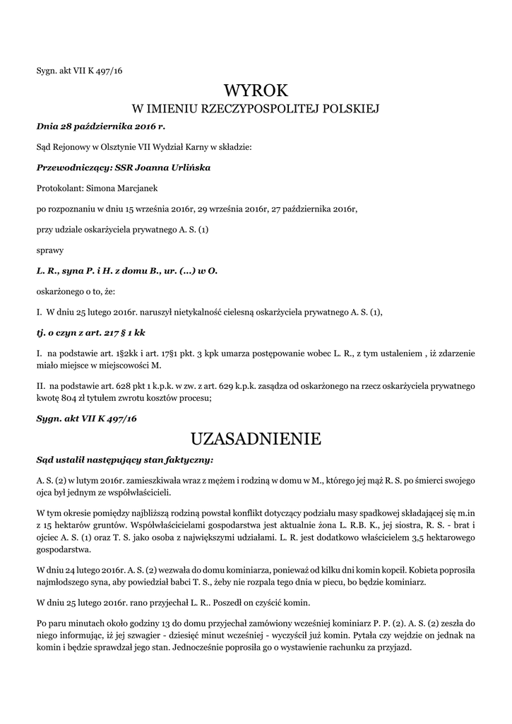 Sygn. akt VII K 497/16 WYROK W IMIENIU RZECZYPOSPOLITEJ POLSKIEJ Dnia 28 października 2016 r. Sąd Rejonowy w Olsztynie VII Wydział Karny w składzie: Przewodniczący: SSR Joanna Urlińska Protokolant: Simona Marcjanek po rozpoznaniu w dniu 15 września 2016r, 29 września 2016r, 27 października 2016r, przy udziale oskarżyciela prywatnego A. S. (1) sprawy L. R., syna P. i H. z domu B., ur. (...) w O. oskarżonego o to, że: I. W dniu 25 lutego 2016r. naruszył nietykalność cielesną oskarżyciela prywatnego A. S. (1), tj. o czyn z art. 217 § 1 kk I. na podstawie art. 1§2kk i art. 17§1 pkt. 3 kpk umarza postępowanie wobec L. R., z tym ustaleniem , iż zdarzenie miało miejsce w miejscowości M. II. na podstawie art. 628 pkt 1 k.p.k. w zw. z art. 629 k.p.k. zasądza od oskarżonego na rzecz oskarżyciela prywatnego kwotę 804 zł tytułem zwrotu kosztów procesu; Sygn. akt VII K 497/16 UZASADNIENIE Sąd ustalił następujący stan faktyczny: A. S. (2) w lutym 2016r. zamieszkiwała wraz z mężem i rodziną w domu w M., którego jej mąż R. S. po śmierci swojego ojca był jednym ze współwłaścicieli. W tym okresie pomiędzy najbliższą rodziną powstał konflikt dotyczący podziału masy spadkowej składającej się m.in z 15 hektarów gruntów. Współwłaścicielami gospodarstwa jest aktualnie żona L. R.B. K., jej siostra, R. S. - brat i ojciec A. S. (1) oraz T. S. jako osoba z największymi udziałami. L. R. jest dodatkowo właścicielem 3,5 hektarowego gospodarstwa. W dniu 24 lutego 2016r. A. S. (2) wezwała do domu kominiarza, ponieważ od kilku dni komin kopcił. Kobieta poprosiła najmłodszego syna, aby powiedział babci T. S., żeby nie rozpala tego dnia w piecu, bo będzie kominiarz. W dniu 25 lutego 2016r. rano przyjechał L. R.. Poszedł on czyścić komin. Po paru minutach około godziny 13 do domu przyjechał zamówiony wcześniej kominiarz P. P. (2). A. S. (2) zeszła do niego informując, iż jej szwagier - dziesięć minut wcześniej - wyczyścił już komin. Pytała czy wejdzie on jednak na komin i będzie sprawdzał jego stan. Jednocześnie poprosiła go o wystawienie rachunku za przyjazd. W tym czasie L. R. wyszedł z garażu, w którym prowadzi działalność gospodarczą. A. S. (2) zapytała go dlaczego wyczyścił komin skoro wiedział, że miał być kominiarz. Mężczyzna kazał jej jechać do swojej mamy i tam rządzić. Pomiędzy wymienionymi doszło do wzajemnej wymiany zdań. Po chwili P. P. (2) zapytał L. R. czy może wejść na komin i go wyczyścić. Został on odesłany o uzyskanie zgody teściowej, która początkowo odmówiła, a następnie wyraziła zgodę na wykonanie usługi. Wówczas L. R. poszedł sobie, zanieść koniom siana. Zostawił on uchylone drzwi do garażu, który jest pomieszczeniem wyodrębnionym z części spadku pod działalność gospodarczą i należy do żony L. R.. Z uwagi na fakt , iż w czasie wcześniejszych konfliktów L. R. informował rodzinę S., iż jak będą wchodzić do garażu to zgłosi kradzież. A. S. (2) po przeprowadzeniu rozmowy telefonicznej z mężem R. S., poprosiła syna A., aby wszedł do środka pomieszczenia, zobaczył czy są tam klucze i zamknął garaż. A. S. (1) wszedł więc do garażu. Przebywał tam 20 – 30 sekund. Sprawdził on czy nikogo nie ma w środku. W tym czasie przybiegł L. R.. Kazał on chłopakowi opuścić pomieszczenie. Ten tłumaczył, iż ojciec kazał mu je zamknąć. Mimo to wymieniony wyszarpnął go. A. S. (1) nie chcąc się przewrócić złapał się atakującego. Gdy L. R. trzymał go za koszulę, A. S. (1) trzymał go za ręce. Po wyjściu z pomieszczenia na podwórko L. R. trzymał A. S. (1) za klapy ubrania, gdy ten trzymał go za ramiona. Po chwili mężczyźni się puścili. W czasie zdarzenia obaj mężczyźni wypowiadali słowa wulgarne. Widząc zdarzenie A. S. (2) zaczęła dzwonić na policję. W tym czasie L. R. puścił chłopca i zamknął garaż. Całe zdarzenie trwało kilka sekund. (dowód zeznania A. S. (1) k. 25-26, ,zeznania A. S. (2), k.26, oraz k. 2 akt 1 Ds. 524/16 w odczytanym zakresie, zeznania P. P. (2) k. 32v, częściowo wyjaśnienia oskarżonego k.24v-25 ) Wyjaśniając przed Sądem L. R. nie przyznał się do dokonania zarzucanego mu czynu. Podkreślił, iż teściowa prosiła go, aby poszedł wyczyścić komin, wobec czego A. S. (2) wybiegła z domu i pytała jakim prawem wszedł na prywatny dach. Wskazał, iż za jakieś 10 minut przyjechał kominiarz. Zaznaczył, iż jak teściowa pozwoliła mu wejść na komin on poszedł zanieść koniom siano i w pewnym momencie zauważył jak A. S. (1) wszedł do środka garażu. Podał, iż jego matka nagrywała to na telefon, choć jest to budynek oznakowany tabliczkami „nieupoważnionym wstęp wzbroniony” i on za niego odpowiada. Wskazał, iż mając tam przygotowane pieniądze, na części wybiegł ze stodoły i pobiegł do garażu, gdzie pytał się A. S. (1) co tutaj robił. Podkreślił, iż kiedy kazał mu opuścić garaż, ten odepchnął go. Podał, iż gdy ponownie wezwał go do opuszczenia lokalu, to ten chwycił go za koszulę, za ubranie, na co oskarżony zrobił to samo i wystawił go za drzwi. Podkreślił, iż nic więcej się nie działo, a po tym fakcie A. S. (2) wezwała policję. Potwierdził , iż jest konflikt związany ze spadkiem (wyjaśnienia k 24v-25). Sąd zważył, co następuje: Dokonując oceny wyjaśnień oskarżonego Sąd podzielił ten fragment jego relacji, w jakich przyznał, iż czyścił komin na prośbę teściowej, przed przyjazdem kominiarza zamówionego przez A. S. (2). Wiarygodne są również jego relacje potwierdzające istniejący po śmierci teścia konflikt w rodzinie. Ten zakres relacji jest konsekwentny i wiarygodny oraz potwierdzony innymi przeprowadzonymi w sprawie dowodami. Odnosząc się do samego zdarzenia objętego przedmiotowym postępowaniem Sąd podzielił jako wiarygodne wyjaśnienia w jakich przyznał fakt wymiany zdań pomięd