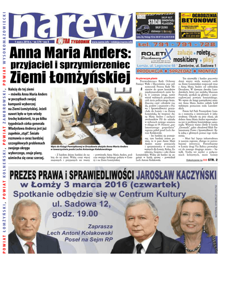 P O W I AT Ł O M Ż Y Ń S K I , P O W I AT KO L N E Ń S K I , P O W I AT Z A M B R O W S K I , P O W I AT W Y S O KO M A ZO W I E C K I reklama 1 MARCA 2016 R. l NR 374 l ROK X www.narew.info [email protected] l Anna Maria Anders: przyjaciel i sprzymierzeniec Ziemi Łomżyńskiej Należę do tej ziemi – mówiła Anna Maria Anders w początkach swojej kampanii wyborczej na Ziemi Łomżyńskiej. Jeżeli nawet było w tym wtedy trochę kokieterii, to po kilku tygodniach córka generała Władysława Andersa jest już zupełnie „stąd”. Śmiało rozmawia o coraz bardziej szczegółowych problemach swojego okręgu wyborczego, snuje plany, uśmiecha się coraz szerzej. Wpis do Księgi Pamiątkowej w Drozdowie złożyła Anna Maria Anders w towarzystwie posła Lecha Antoniego Kołakowskiego – Z każdym dniem bardziej do należę do tej ziemi. Widzę coraz więcej znajomych i przyjaznych mi twarzy – powtórzyła Anna Maria Anders, podczas swojego kolejnego pobytu w Łomży i na Ziemi Łomżyńskiej. Na pierwszym planie Prze wodnicząca Rady Ochrony Pamięci Walk i Męczeństwa oraz pełnomocnik Prezesa Rady Ministrów do spraw kontaktów międzynarodowych znów była w centrum uwagi, nawet wśród wybitnych przedstawicieli życia politycznego kraju. Znaczna część członków rządu, posłów i senatorów z Prawa i Sprawiedliwości przyjechała do Łomży i na Ziemię Łomżyńską, by wesprzeć Annę Marię Anders i zachęcić zwolenników PiS do udziału w wyborach nowego senatora w okręgu nr 59. Honory „parlamentar nego gospodarza” regionu pełnił poseł Lech Antoni Kołakowski. – Im bardziej się poznajemy, tym bardziej jestem pewien, że w pani Annie Marii Anders mamy przy jaciela i sprzymierzeńca w rzeczach ważnych dla Łomży, Kolna, Zambrowa, Grajewa i całej Ziemi Łomżyńskiej. Widzę jak bardzo się angażuje w każdą sprawę – powiedział Lech Antoni Kołakowski. Ten niezwykły i bardzo pracowity dzień wizyty wielu ważnych osób na Ziemi Łomżyńskiej rozpoczęli wraz z Anną Marią Anders od odwiedzin Drozdowa. W dawnym dworku Lutosławskich, który jest siedzibą Muzeum Przyrody, spotkali się głównie z samorządowcami powiatu łomżyńskiego. We wpisie do księgi pamiątkowej minister Anna Maria Andres oddała hołd wybitnym postaciom rodu Lutosławskich. Potem był Park Przemysłowy Łomża z rozmową o inwestycjach w infrastrukturę. Okazało się przy okazji, jak dobrze Anna Maria Anders wprowadzona jest w problemy łomżyńskiego samorządu. Wreszcie ważne chwile w hotelu „Gromada”, gdzie obradował Klub Parlamentarny Prawo i Sprawiedliwość. Była jedną z głównych postaci tego wydarzenia. – Musi być lepsza infrastruktura w naszym regionie, dlatego że potrzebujemy inwestycji. Potrzebujemy w Łomży drogi Via Baltica prowadzącej do naszego drugiego miasta – Suwałk. Trzeba też myśleć o połączeniach kolejowych, może Łomży Dokończenie na ááá STR. 2 2 / wAżne spRAwy Anna Maria Anders: przyjaciel i sprzymierzeniec Ziemi Łomżyńskiej Dokończenie ze ááá STR. 1 z Warszawą. Nasze firmy potrzebują inwestycji, a inwestorzy nie dojadą bez dobrych dróg i kolei. Nareszcie się zaczyna praca w dobrym kierunku – mówiła Anna Maria Anders. Po polsku – polubiła Jeszcze wyraźniej dobre emocje ujawniły się podczas spotkania z przedstawicielami twórców i instytucji kultury w Teatrze Lalki i Aktora. Udział wziął w nim profesor Piotr Gliński, wicepremier i minister kultury. To on wystąpił do premier Beaty Szydło o powołanie Anny Marii Anders do rządu, jako przewodniczącej Rady Ochrony Pamięci Walki Męczeństwa. – Pani Anna Maria Anders w swojej niezbyt długiej – przecież – karierze publicznej w Polsce, tak wiele dobrego zrobiła już dla nas – mówił wicepremier. – Nie wyobrażam sobie lepszej kandydatki i bardzo ją polecam. Anna Maria Anders nie kryła wzruszenia. – Bardzo mi zależy na was, naprawdę. Tu są kochani ludzie. Naprawdę nie mam słów, bo czuję, że to jest wszystko czym jestem tu otoczona jest szczere. I wiem, że nie chodzi tylko o kampanię. Polubiliśmy się... – mówiła. – Wiedziałem, że jest osobą tak bardzo polską w sensie emocjonalnym – dodał profesor Piotr Gliński. – Po prostu polubiła Polskę, region, ludzi, to, co Państwo robicie... Kampania wyborcza do Senatu w okręgu nr 59, czyli łomżyńsko – suwalskim, dobiega końca. Głosowanie już w niedzielę 6 marca. Jednym z ważniejszych wydarzeń była wizyta członków rządu i parlamentarzystów Prawa i Sprawiedliwości. – To był bardzo ważny i piękny dzień dla Łomży, ale także Kolna, Zambrowa, Grajewa, całej Ziemi Łomżyńskiej – podkreślił z satysfakcją poseł Lech Antoni Kołakowski. 18-400 Łomża, Stary Rynek 13 e-mail: [email protected] tel./fax 86 216 71 07 reDaktor nacZelny: Artur Filipkowski Współpraca: Maciej Gryguc, Karolina Łomotowska, Karol Babiel, Maciej Kosiński Dyrektor Biura reklamy i ogŁoSZeŃ: Monika Strzelecka tel. 600 680 638 Katarzyna Sałacka e-mail: [email protected] www.narew.info „Narew Extra Tygodnik” wydawany jest na podst. umowy franchisowej z Extra Media Sp. z o.o. Druk: Agora SA, ul. Daniszewska 27, Warszawa Redakcja nie ponosi odpowiedzialności za treść zamieszczanych ogłoszeń i zastrzega sobie prawo do skracania nadesłanych tekstów. www.narew.info 1 marca 2016 Rozmowy i spotkania na Ziemi Łomżyńskiej może wystarczyć. Jerzy Szmit poinformował, że rząd analizuje finansowe możliwości realizowania poszczególnych inwestycji. Via Baltica przez Łomżę pozostaje wśród priorytetów, ale żadnych konkretów finansowych jeszcze nie ma. W wypowiedziach przedstawicieli rządu pojawiły terminy: 2017 rok jako czas pierwszych działań realizacyjnych i 2021 rok na ich możliwe zakończenie. Rząd będzie poszukiwał sposobów obniżenia kosztów budowy dróg. Briefing prasowy w Hotelu Gromada w Łomży, od lewej minister rolnictwa