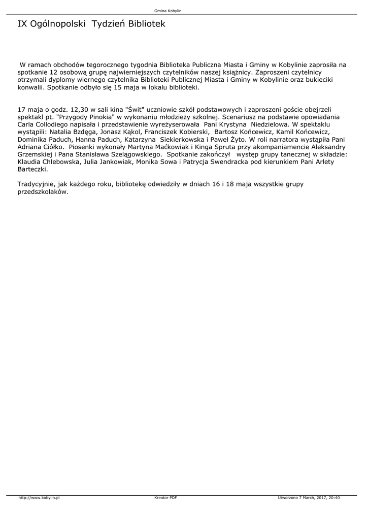 Gmina Kobylin IX Ogólnopolski Tydzień Bibliotek W ramach obchodów tegorocznego tygodnia Biblioteka Publiczna Miasta i Gminy w Kobylinie zaprosiła na spotkanie 12 osobową grupę najwierniejszych czytelników naszej książnicy. Zaproszeni czytelnicy otrzymali dyplomy wiernego czytelnika Biblioteki Publicznej Miasta i Gminy w Kobylinie oraz bukieciki konwalii. Spotkanie odbyło się 15 maja w lokalu biblioteki. 17 maja o godz. 12,30 w sali kina "Świt" uczniowie szkół podstawowych i zaproszeni goście obejrzeli spektakl pt. "Przygody Pinokia" w wykonaniu młodzieży szkolnej. Scenariusz na podstawie opowiadania Carla Collodiego napisała i przedstawienie wyreżyserowała Pani Krystyna Niedzielowa. W spektaklu wystąpili: Natalia Bzdęga, Jonasz Kąkol, Franciszek Kobierski, Bartosz Końcewicz, Kamil Końcewicz, Dominika Paduch, Hanna Paduch, Katarzyna Siekierkowska i Paweł Żyto. W roli narratora wystąpiła Pani Adriana Ciółko. Piosenki wykonały Martyna Maćkowiak i Kinga Spruta przy akompaniamencie Aleksandry Grzemskiej i Pana Stanisława Szelągowskiego. Spotkanie zakończył występ grupy tanecznej w składzie: Klaudia Chlebowska, Julia Jankowiak, Monika Sowa i Patrycja Swendracka pod kierunkiem Pani Arlety Barteczki. Tradycyjnie, jak każdego roku, bibliotekę odwiedziły w dniach 16 i 18 maja wszystkie grupy przedszkolaków. http://www.kobylin.pl Kreator PDF Utworzono 7 March, 2017, 20:40