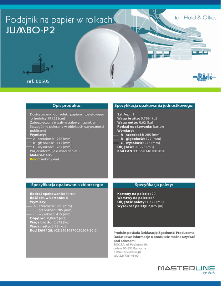 Podajnik na papier w rolkach JUMBO-P2 ref. 00505 Opis produktu: Dostosowany do rolek papieru toaletowego o średnicy 19 i 23 [cm] Zabezpieczony trwałym stalowym zamkiem Szczególnie polecany w obiektach użyteczności publicznej Wymiary: A - szerokość: 258 [mm] B - głębokość: 117 [mm] C - wysokość: 267 [mm] Wizjer informuje o ilości papieru Materiał: ABS Kolor: srebrny mat Specyfikacja opakowania zbiorczego: Rodzaj opakowania: karton Ilość szt. w kartonie: 6 Wymiary: A - szerokość: 560 [mm] B - głębokość: 285 [mm] C - wysokość: 415 [mm] Objętość: 0,0662 [m3] Waga brutto: 5,572 [kg] Waga netto: 3,72 [kg] Kod EAN 128: (02)59014870050504(30)6 Specyfikacja opakowania jednostkowego: Szt./op.: 1 Waga brutto: 0,799 [kg] Waga netto: 0,62 [kg] Rodzaj opakowania: karton Wymiary: A - szerokość: 265 [mm] B - głębokość: 127 [mm] C - wysokość: 275 [mm] Objętość: 0,0925 [m3] Kod EAN 13: 5901487005050 Specyfikacja palety: Kartony na palecie: 20 Warstwy na palecie: 5 Objętość palety: 1,325 [m3] Wysokość palety: 2,075 [m] Produkt posiada Deklarację Zgodności Producenta Dodatkowe informacje o produkcie można uzyskać pod adresem: BISK S.A. ul. Podleśna 19, Łubna 05-532 Baniocha e-mail: [email protected] tel. (22) 736-46-00