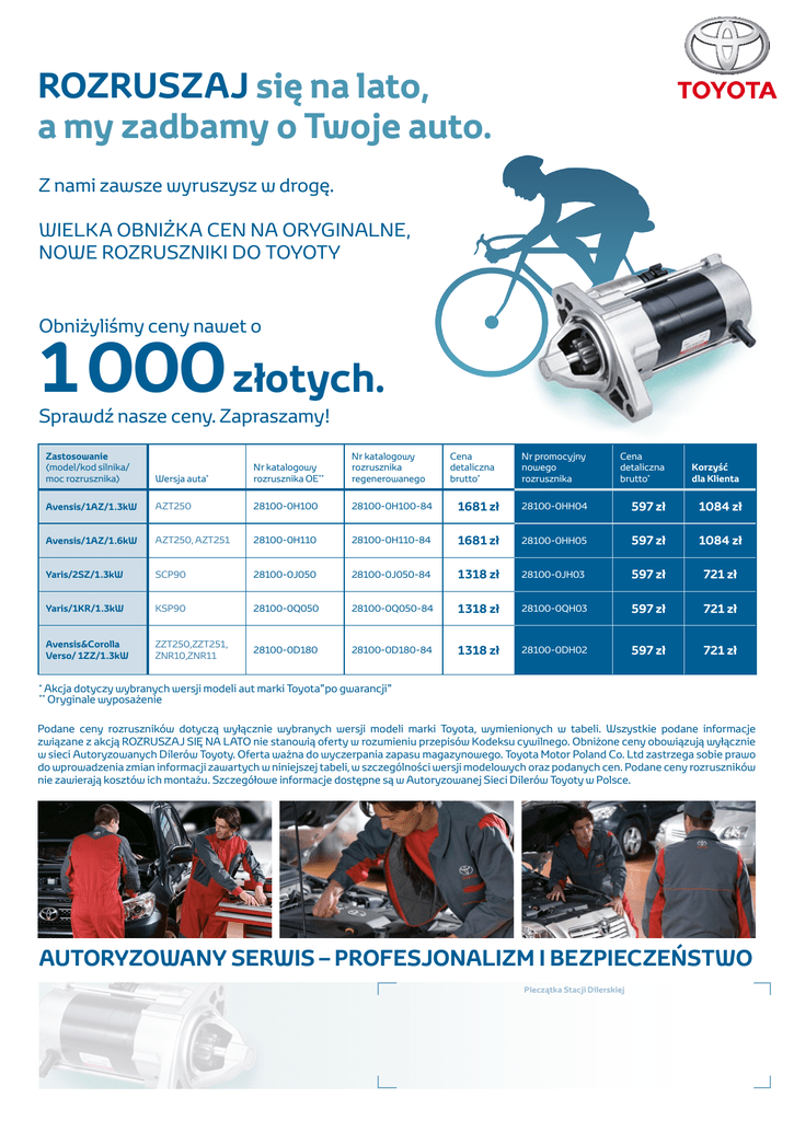 ROZRUSZAJ się na lato, a my zadbamy o Twoje auto. Z nami zawsze wyruszysz w drogę. WIELKA OBNIŻKA CEN NA ORYGINALNE, NOWE ROZRUSZNIKI DO TOYOTY Obniżyliśmy ceny nawet o 1 000 złotych. Sprawdź nasze ceny. Zapraszamy! * Zastosowanie (model/kod silnika/ moc rozrusznika) Wersja auta Nr katalogowy rozrusznika OE** Nr katalogowy rozrusznika regenerowanego Nr promocyjny nowego rozrusznika Cena detaliczna brutto* Korzyść dla Klienta Avensis/1AZ/1.3kW AZT250 28100-0H100 28100-0H100-84 1681 zł 28100-0HH04 597 zł 1084 zł Avensis/1AZ/1.6kW AZT250, AZT251 28100-0H110 28100-0H110-84 1681 zł 28100-0HH05 597 zł 1084 zł Yaris/2SZ/1.3kW SCP90 28100-0J050 28100-0J050-84 1318 zł 28100-0JH03 597 zł 721 zł Yaris/1KR/1.3kW KSP90 28100-0Q050 28100-0Q050-84 1318 zł 28100-0QH03 597 zł 721 zł Avensis&Corolla Verso/ 1ZZ/1.3kW ZZT250,ZZT251, ZNR10,ZNR11 28100-0D180 28100-0D180-84 1318 zł 28100-0DH02 597 zł 721 zł * Cena detaliczna brutto* Akcja dotyczy wybranych wersji modeli aut marki Toyota”po gwarancji” Oryginale wyposażenie ** Podane ceny rozruszników dotyczą wyłącznie wybranych wersji modeli marki Toyota, wymienionych w tabeli. Wszystkie podane informacje związane z akcją ROZRUSZAJ SIĘ NA LATO nie stanowią oferty w rozumieniu przepisów Kodeksu cywilnego. Obniżone ceny obowiązują wyłącznie w sieci Autoryzowanych Dilerów Toyoty. Oferta ważna do wyczerpania zapasu magazynowego. Toyota Motor Poland Co. Ltd zastrzega sobie prawo do wprowadzenia zmian informacji zawartych w niniejszej tabeli, w szczególności wersji modelowych oraz podanych cen. Podane ceny rozruszników nie zawierają kosztów ich montażu. Szczegółowe informacje dostępne są w Autoryzowanej Sieci Dilerów Toyoty w Polsce. AUTORYZOWANY SERWIS – PROFESJONALIZM I BEZPIECZEŃSTWO Pieczątka Stacji Dilerskiej