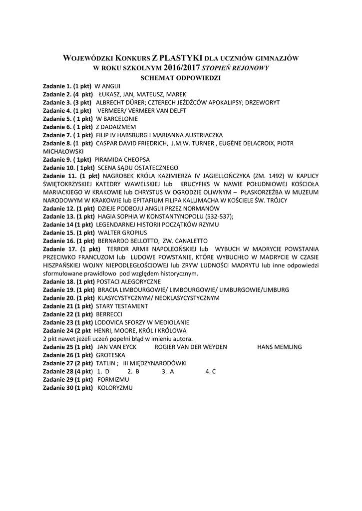 WOJEWÓDZKI KONKURS Z PLASTYKI DLA UCZNIÓW GIMNAZJÓW W ROKU SZKOLNYM 2016/2017 STOPIEŃ REJONOWY SCHEMAT ODPOWIEDZI Zadanie 1. (1 pkt) W ANGLII Zadanie 2. (4 pkt) ŁUKASZ, JAN, MATEUSZ, MAREK Zadanie 3. (3 pkt) ALBRECHT DÜRER; CZTERECH JEŹDŹCÓW APOKALIPSY; DRZEWORYT Zadanie 4. (1 pkt) VERMEER/ VERMEER VAN DELFT Zadanie 5. ( 1 pkt) W BARCELONIE Zadanie 6. ( 1 pkt) Z DADAIZMEM Zadanie 7. ( 1 pkt) FILIP IV HABSBURG I MARIANNA AUSTRIACZKA Zadanie 8. (1 pkt) CASPAR DAVID FRIEDRICH, J.M.W. TURNER , EUGÈNE DELACROIX, PIOTR MICHAŁOWSKI Zadanie 9. ( 1pkt) PIRAMIDA CHEOPSA Zadanie 10. ( 1pkt) SCENA SĄDU OSTATECZNEGO Zadanie 11. (1 pkt) NAGROBEK KRÓLA KAZIMIERZA IV JAGIELLOŃCZYKA (ZM. 1492) W KAPLICY ŚWIĘTOKRZYSKIEJ KATEDRY WAWELSKIEJ lub KRUCYFIKS W NAWIE POŁUDNIOWEJ KOŚCIOŁA MARIACKIEGO W KRAKOWIE lub CHRYSTUS W OGRODZIE OLIWNYM – PŁASKORZEŹBA W MUZEUM NARODOWYM W KRAKOWIE lub EPITAFIUM FILIPA KALLIMACHA W KOŚCIELE ŚW. TRÓJCY Zadanie 12. (1 pkt) DZIEJE PODBOJU ANGLII PRZEZ NORMANÓW Zadanie 13. (1 pkt) HAGIA SOPHIA W KONSTANTYNOPOLU (532-537); Zadanie 14 (1 pkt) LEGENDARNEJ HISTORII POCZĄTKÓW RZYMU Zadanie 15. (1 pkt) WALTER GROPIUS Zadanie 16. (1 pkt) BERNARDO BELLOTTO, ZW. CANALETTO Zadanie 17. (1 pkt) TERROR ARMII NAPOLEOŃSKIEJ lub WYBUCH W MADRYCIE POWSTANIA PRZECIWKO FRANCUZOM lub LUDOWE POWSTANIE, KTÓRE WYBUCHŁO W MADRYCIE W CZASIE HISZPAŃSKIEJ WOJNY NIEPODLEGŁOŚCIOWEJ lub ZRYW LUDNOŚCI MADRYTU lub inne odpowiedzi sformułowane prawidłowo pod względem historycznym. Zadanie 18. (1 pkt) POSTACI ALEGORYCZNE Zadanie 19. (1 pkt) BRACIA LIMBOURGOWIE/ LIMBOURGOWIE/ LIMBURGOWIE/LIMBURG Zadanie 20. (1 pkt) KLASYCYSTYCZNYM/ NEOKLASYCYSTYCZNYM Zadanie 21 (1 pkt) STARY TESTAMENT Zadanie 22 (1 pkt) BERRECCI Zadanie 23 (1 pkt) LODOVICA SFORZY W MEDIOLANIE Zadanie 24 (2 pkt HENRI, MOORE, KRÓL I KRÓLOWA 2 pkt nawet jeżeli uczeń popełni błąd w imieniu autora. Zadanie 25 (1 pkt) JAN VAN EYCK ROGIER VAN DER WEYDEN HANS MEMLING Zadanie 26 (1 pkt) GROTESKA Zadanie 27 (2 pkt) TATLIN ; III MIĘDZYNARODÓWKI Zadanie 28 (4 pkt) 1. D 2. B 3. A 4. C Zadanie 29 (1 pkt) FORMIZMU Zadanie 30 (1 pkt) KOLORYZMU