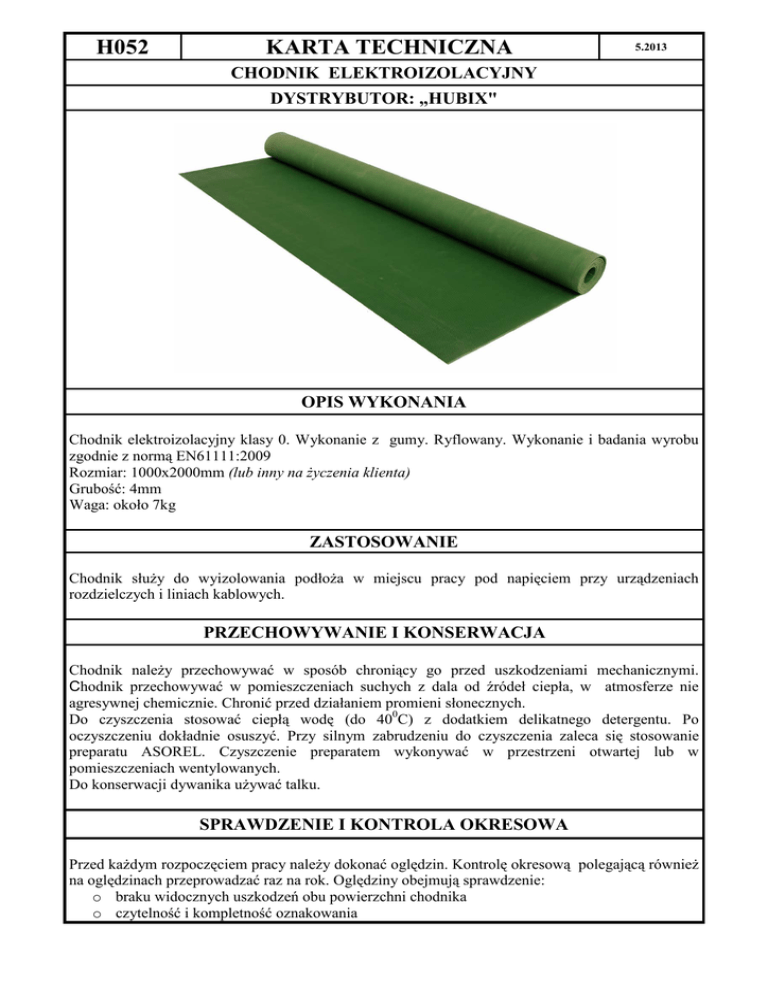 H052 KARTA TECHNICZNA 5.2013 CHODNIK ELEKTROIZOLACYJNY DYSTRYBUTOR: „HUBIX" OPIS WYKONANIA Chodnik elektroizolacyjny klasy 0. Wykonanie z gumy. Ryflowany. Wykonanie i badania wyrobu zgodnie z normą EN61111:2009 Rozmiar: 1000x2000mm (lub inny na życzenia klienta) Grubość: 4mm Waga: około 7kg ZASTOSOWANIE Chodnik służy do wyizolowania podłoża w miejscu pracy pod napięciem przy urządzeniach rozdzielczych i liniach kablowych. PRZECHOWYWANIE I KONSERWACJA Chodnik należy przechowywać w sposób chroniący go przed uszkodzeniami mechanicznymi. Chodnik przechowywać w pomieszczeniach suchych z dala od źródeł ciepła, w atmosferze nie agresywnej chemicznie. Chronić przed działaniem promieni słonecznych. Do czyszczenia stosować ciepłą wodę (do 400C) z dodatkiem delikatnego detergentu. Po oczyszczeniu dokładnie osuszyć. Przy silnym zabrudzeniu do czyszczenia zaleca się stosowanie preparatu ASOREL. Czyszczenie preparatem wykonywać w przestrzeni otwartej lub w pomieszczeniach wentylowanych. Do konserwacji dywanika używać talku. SPRAWDZENIE I KONTROLA OKRESOWA Przed każdym rozpoczęciem pracy należy dokonać oględzin. Kontrolę okresową polegającą również na oględzinach przeprowadzać raz na rok. Oględziny obejmują sprawdzenie: o braku widocznych uszkodzeń obu powierzchni chodnika o czytelność i kompletność oznakowania Chodniki uszkodzone, silnie zużyte (przetarcia, rysy) lub zabrudzone nie mogą być użyte w pracach pod napięciem. W przypadku zawilgocenia sprzęt należy dokładnie osuszyć przed użyciem. UWAGA! W przypadku powstania wątpliwości dotyczących właściwości elektrycznych, chodniki powinny być skierowane do laboratorium w celu wykonania badań elektrycznych. CZĘSTOTLIWOŚĆ BADAŃ Sprawdzenie przed użyciem i kontrolę okresową przeprowadzać zgodnie z poniższą tabelą Przez kogo SPRAWDZANIE KONTROLA OKRESOWA kierujący zespołem dozór Kiedy przed każdorazowym użyciem W jaki sposób wzrokowo (oględziny) *jeżeli instrukcja organizacji prac pod napięciem nie stanowi inaczej data raz na rok* wzrokowo (oględziny) KARTA PRZEGLĄDÓW NARZĘDZI KONTROLA OKRESOWA kontrolujący wynik kontroli PRZYKŁAD ZASTOSOWANIA podpis