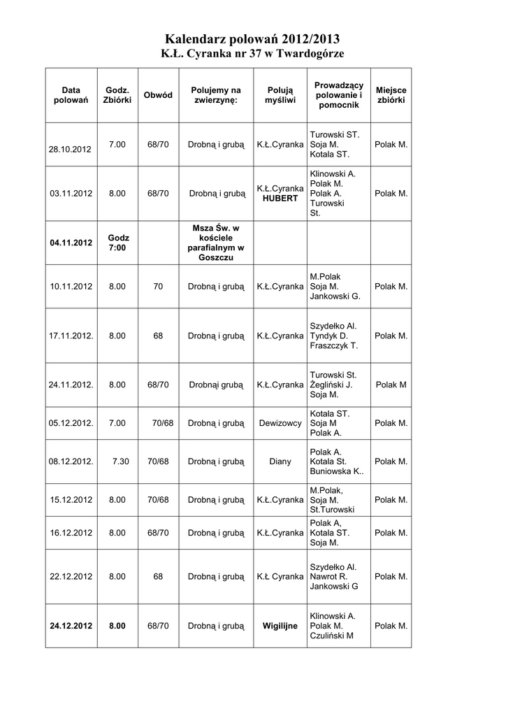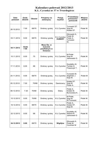 Kalendarz polowań 2012/2013 K.Ł. Cyranka nr 37 w Twardogórze Data polowań 28.10.2012 Obwód Polujemy na zwierzynę: 7.00 68/70 Drobną i grubą Turowski ST. K.Ł.Cyranka Soja M. Kotala ST. Polak M. Drobną i grubą Klinowski A. Polak M. K.Ł.Cyranka Polak A. HUBERT Turowski St. Polak M. Miejsce zbiórki 03.11.2012 8.00 04.11.2012 Godz 7:00 10.11.2012 8.00 70 Drobną i grubą M.Polak K.Ł.Cyranka Soja M. Jankowski G. Polak M. 17.11.2012. 8.00 68 Drobną i grubą Szydełko Al. K.Ł.Cyranka Tyndyk D. Fraszczyk T. Polak M. 24.11.2012. 8.00 68/70 Drobnąi grubą Turowski St. K.Ł.Cyranka Żegliński J. Soja M. Polak M 05.12.2012. 7.00 Drobną i grubą Kotala ST. Dewizowcy Soja M Polak A. Polak M. 08.12.2012. 7.30 68/70 Polują myśliwi Prowadzący polowanie i pomocnik Godz. Zbiórki Msza Św. w kościele parafialnym w Goszczu 70/68 70/68 Drobną i grubą Diany Polak A. Kotala St. Buniowska K.. Polak M. 15.12.2012 8.00 70/68 Drobną i grubą M.Polak, K.Ł.Cyranka Soja M. St.Turowski Polak M. 16.12.2012 8.00 68/70 Drobną i grubą Polak A, K.Ł.Cyranka Kotala ST. Soja M. Polak M. 22.12.2012 8.00 68 Drobną i grubą Szydełko Al. K.Ł Cyranka Nawrot R. Jankowski G Polak M. 24.12.2012 8.00 68/70 Drobną i grubą Klinowski A. Polak M. Czuliński M Polak M. Wigilijne 05.01.2013 8.00 68/70 Drobną i grubą Nawrot R. K.Ł.Cyranka Żegliński J. Szydełko Al.. Polak M. 06.01.2013 8.00 68/70 Drobną i grubą A.Polak, K.Ł.Cyranka Kotala ST. Pietrucha M. Polak M. 12.01.2013 8.00 68/70 Drobną i grubą M.Polak, K.Ł.Cyranka Klinowski A. Turowski St. Polak M. 20.01.2013 8.00 68/70 Na lisy 27.01.2013 8.00 68/70 Na lisy 03.02.2013 8.00 68/70 Na lisy 10.02.2013 8.00 68/70 Na lisy 17.02.2013 8.00 68/70 Na lisy 24.02.2013 8.00 68/70 Na lisy K.Ł. Cyranka K.Ł. Cyranka K.Ł. Cyranka K.Ł. Cyranka Arkadiusz Polak Arkadiusz Polak Arkadiusz Polak Arkadiusz Polak Arkadiusz K.Ł.Cyranka Polak Arkadiusz K.Ł.Cyranka Polak Polak M. Polak M. Polak M. Polak M. Polak M. Polak M. Wszystkie sprawy związane z polowaniem Prowadzący uzgadnia z Łowczym. 1. Prowadzący polowanie zobowiązany jest do przygotowania: - kamizelek w kolorze pomarańczowym - apteczkę pierwszej pomocy - sygnałówkę - karty stanowiskowe - ogniska i miejsce na spożycie posiłku 2. Prowadzący polowanie zobowiązany jest do złożenia pisemnego sprawozdania z jego przebiegu w ciągu 3 dni. 3. Za przygotowanie apteczki odpowiada Kol. Jarosław Gonera cały sezon. 4. Odpowiedzialnym za przygotowanie naganki jest Kol. Marian Polak, za wypełnienie dokumentów i rozliczeń naganki kol. Stanisław Paluszek oraz kol.Arkadiusz Polak. 5. Kandydaci zobowiązani są do systematycznego uczestnictwa w polowaniach. W razie nieobecności kandydat powinien zastąpić siebie innym naganiaczem. 6. Zarząd Koła zastrzega sobie prawo do zmiany terminów i miejsca zbiórki. Do wiadomości: Okręgowy Zarząd PZŁ W-w 1. Nadleśnictwo Oleśnica 2. Nadleśnictwo Milicz 3. Nadleśnictwo Syców 4. Starostwo Powiatowe Oleśnica 5. Członkowie i kandydaci K.Ł. Cyranka 6. Leśnictwo Bukowinka 7. Leśnictwo Dziesławice 8. Leśnictwo Gola Wielka 9. Leśnictwo Twardogóra 10. Leśnictwo Goszcz 11. Leśnictwo Krośnice