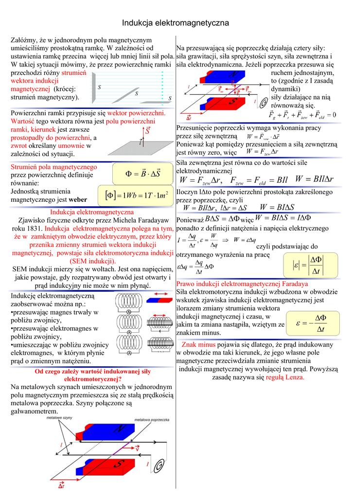 Indukcja elektromagnetyczna Załóżmy, że w jednorodnym polu magnetycznym umieściliśmy prostokątną ramkę. W zależności od Na przesuwającą się poprzeczkę działają cztery siły: ustawienia ramkę przecina więcej lub mniej linii sił pola. siła grawitacji, siła sprężystości szyn, siła zewnętrzna i W takiej sytuacji mówimy, że przez powierzchnię ramki siła elektrodynamiczna. Jeżeli poprzeczka przesuwa się przechodzi różny strumień ruchem jednostajnym, wektora indukcji to (zgodnie z I zasadą magnetycznej (krócej: dynamiki) strumień magnetyczny). siły działające na nią równoważą się. Powierzchni ramki przypisuje się wektor powierzchni. Wartość tego wektora równa jest polu powierzchni Przesunięcie poprzeczki wymaga wykonania pracy ramki, kierunek jest zawsze przez siłę zewnętrzną prostopadły do powierzchni, a Ponieważ kąt pomiędzy przesunięciem a siłą zewnętrzną zwrot określany umownie w jest równy zero, więc zależności od sytuacji. Siła zewnętrzna jest równa co do wartości sile Strumień pola magnetycznego elektrodynamicznej przez powierzchnię definiuje równanie: Jednostką strumienia Iloczyn lΔto pole powierzchni prostokąta zakreślonego magnetycznego jest weber przez poprzeczkę, czyli Indukcja elektromagnetyczna Zjawisko fizyczne odkryte przez Michela Faradayaw roku 1831. Indukcja elektromagnetyczna polega na tym, że w zamkniętym obwodzie elektrycznym, przez który przenika zmienny strumień wektora indukcji magnetycznej, powstaje siła elektromotoryczna indukcji (SEM indukcji). SEM indukcji mierzy się w woltach. Jest ona napięciem, jakie powstaje, gdy rozpatrywany obwód jest otwarty i prąd indukcyjny nie może w nim płynąć. Indukcję elektromagnetyczną zaobserwować można np.: •przesuwając magnes trwały w pobliżu zwojnicy, •przesuwając elektromagnes w pobliżu zwojnicy, •umieszczając w pobliżu zwojnicy elektromagnes, w którym płynie prąd o zmiennym natężeniu. Od czego zależy wartość indukowanej siły elektromotorycznej? Na metalowych szynach umieszczonych w jednorodnym polu magnetycznym przemieszcza się ze stałą prędkością metalowa poprzeczka. Szyny połączone są galwanometrem. Ponieważ więc ponadto z definicji natężenia i napięcia elektrycznego czyli podstawiając do otrzymanego wyrażenia na pracę Prawo indukcji elektromagnetycznej Faradaya Siła elektromotoryczna indukcji wzbudzona w obwodzie wskutek zjawiska indukcji elektromagnetycznej jest ilorazem zmiany strumienia wektora indukcji magnetycznej i czasu, w jakim ta zmiana nastąpiła, wziętym ze znakiem minus. Znak minus pojawia się dlatego, że prąd indukowany w obwodzie ma taki kierunek, że jego własne pole magnetyczne przeciwdziała zmianie strumienia indukcji magnetycznej wywołującej ten prąd. Powyższą zasadę nazywa się regułą Lenza. Indukcja elektromagnetyczna Przykład: Jaki kierunek ma prąd indukcyjny w przypadku przedstawionym na rysunku? Wyznaczenie kierunku prądu indukcyjnego wywołanego zmianą strumienia indukcji pola magnetycznego polega na: 1.Ustaleniu, czy strumień indukcji pola magnetycznego rośnie, czy maleje. 2.Wykorzystaniu reguły Lentza: jeśli strumień rośnie, to pole magnetyczne prądu indukcyjnego rysujemy przeciwnie do pola magnetycznego zewnętrznego; jeśli maleje, wtedy pole magnetyczne prądu indukcyjnego rysujemy zgodnie z polem magnetycznym zewnętrznym. 3.Ustaleniu za pomocą reguły prawej dłoni lub reguły śruby prawoskrętnej kierunku prądu indukcyjnego. W przedstawionym przypadku 1.Strumień pola rośnie. 2.Indukowane pole ma zwrot przeciwny do pola zewnętrznego. 3.Indukowany prąd płynie przeciwnie do ruchu wskazówek zegara.