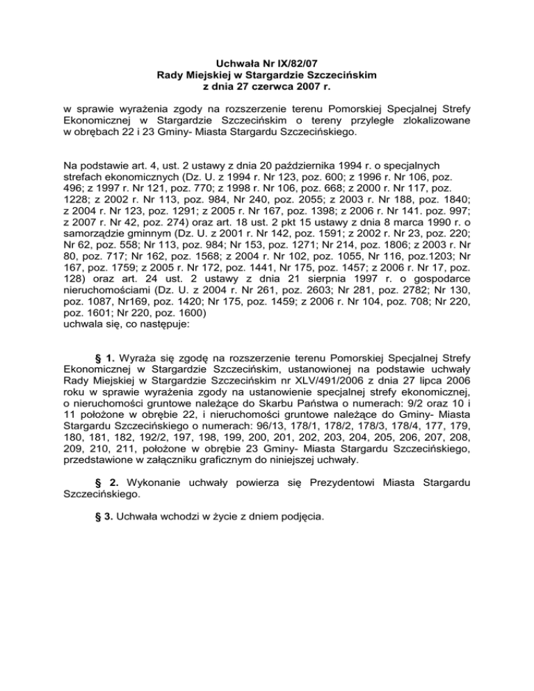 Uchwała Nr IX/82/07 Rady Miejskiej w Stargardzie Szczecińskim z dnia 27 czerwca 2007 r. w sprawie wyraŜenia zgody na rozszerzenie terenu Pomorskiej Specjalnej Strefy Ekonomicznej w Stargardzie Szczecińskim o tereny przyległe zlokalizowane w obrębach 22 i 23 Gminy- Miasta Stargardu Szczecińskiego. Na podstawie art. 4, ust. 2 ustawy z dnia 20 października 1994 r. o specjalnych strefach ekonomicznych (Dz. U. z 1994 r. Nr 123, poz. 600; z 1996 r. Nr 106, poz. 496; z 1997 r. Nr 121, poz. 770; z 1998 r. Nr 106, poz. 668; z 2000 r. Nr 117, poz. 1228; z 2002 r. Nr 113, poz. 984, Nr 240, poz. 2055; z 2003 r. Nr 188, poz. 1840; z 2004 r. Nr 123, poz. 1291; z 2005 r. Nr 167, poz. 1398; z 2006 r. Nr 141. poz. 997; z 2007 r. Nr 42, poz. 274) oraz art. 18 ust. 2 pkt 15 ustawy z dnia 8 marca 1990 r. o samorządzie gminnym (Dz. U. z 2001 r. Nr 142, poz. 1591; z 2002 r. Nr 23, poz. 220; Nr 62, poz. 558; Nr 113, poz. 984; Nr 153, poz. 1271; Nr 214, poz. 1806; z 2003 r. Nr 80, poz. 717; Nr 162, poz. 1568; z 2004 r. Nr 102, poz. 1055, Nr 116, poz.1203; Nr 167, poz. 1759; z 2005 r. Nr 172, poz. 1441, Nr 175, poz. 1457; z 2006 r. Nr 17, poz. 128) oraz art. 24 ust. 2 ustawy z dnia 21 sierpnia 1997 r. o gospodarce nieruchomościami (Dz. U. z 2004 r. Nr 261, poz. 2603; Nr 281, poz. 2782; Nr 130, poz. 1087, Nr169, poz. 1420; Nr 175, poz. 1459; z 2006 r. Nr 104, poz. 708; Nr 220, poz. 1601; Nr 220, poz. 1600) uchwala się, co następuje: § 1. WyraŜa się zgodę na rozszerzenie terenu Pomorskiej Specjalnej Strefy Ekonomicznej w Stargardzie Szczecińskim, ustanowionej na podstawie uchwały Rady Miejskiej w Stargardzie Szczecińskim nr XLV/491/2006 z dnia 27 lipca 2006 roku w sprawie wyraŜenia zgody na ustanowienie specjalnej strefy ekonomicznej, o nieruchomości gruntowe naleŜące do Skarbu Państwa o numerach: 9/2 oraz 10 i 11 połoŜone w obrębie 22, i nieruchomości gruntowe naleŜące do Gminy- Miasta Stargardu Szczecińskiego o numerach: 96/13, 178/1, 178/2, 178/3, 178/4, 177, 179, 180, 181, 182, 192/2, 197, 198, 199, 200, 201, 202, 203, 204, 205, 206, 207, 208, 209, 210, 211, połoŜone w obrębie 23 Gminy- Miasta Stargardu Szczecińskiego, przedstawione w załączniku graficznym do niniejszej uchwały. § 2. Wykonanie uchwały powierza się Prezydentowi Miasta Stargardu Szczecińskiego. § 3. Uchwała wchodzi w Ŝycie z dniem podjęcia. UZASADNIENIE W dniu 27 lipca 2006 roku Rada Miejska w Stargardzie Szczecińskim przyjęła uchwałę nr XLV/491/2006, w sprawie wyraŜenia zgody na ustanowienie specjalnej strefy ekonomicznej. Na jej podstawie, działki gruntowe o powierzchni 100 ha, zlokalizowane w obrębie 22 Gminy- Miasta Stargardu Szczecińskiego objęte zostały statusem specjalnej strefy ekonomicznej. Specjalne strefy ekonomiczne stanowią jeden z podstawowych instrumentów polityki regionalnej, tworzonych w celu pozyskiwania nowych inwestycji w naszym kraju. Ocena ich działalności na przestrzeni ostatnich lat dowodzi, iŜ gminy które w swojej ofercie inwestycyjnej posiadają tereny objęte statusem specjalnych stref ekonomicznych przewodzą w rankingach dotyczących pozyskiwania bezpośrednich inwestycji, a tym samym specjalne strefy ekonomiczne są waŜnym elementem mającym wpływ na rozwój gmin i regionów. Gmina- Miasto Stargard Szczeciński w swojej ofercie inwestycyjnej wypracowała elementy stanowiące pakiet zachęt dla inwestorów, w tym równieŜ wysoko oceniane przez inwestorów programy zwolnień od podatków lokalnych dla firm dokonujących inwestycji na terenie Gminy- Miasta Stargardu Szczecińskiego i tworzących nowe miejsca pracy (program de minimis oraz Program Regionalnej Pomocy Inwestycyjnej dla przedsiębiorców na terenie miasta Stargardu Szczecińskiego - uchwała Rady Miejskiej nr: VII/64/07 z dnia 24 kwietnia 2007 r.). Rozszerzenie terenów posiadających status specjalnej strefy ekonomicznej o tereny zlokalizowane w sąsiedztwie tych, których zarządzającym jest Pomorska Specjalna Strefa Ekonomiczna, wraz z elementami zachęt dla inwestorów wypracowanymi przez Gminę- Miasto Stargard Szczeciński, będzie stanowiło o atrakcyjności oferty inwestycyjnej miasta. Biorąc pod uwagę korzyści wynikające z posiadania przez Gminę terenów objętych statusem specjalnej strefy ekonomicznej, szczególnie istotne z punktu widzenia rozwoju gospodarczego miasta, zasadnym jest przyjęcie niniejszej uchwały.