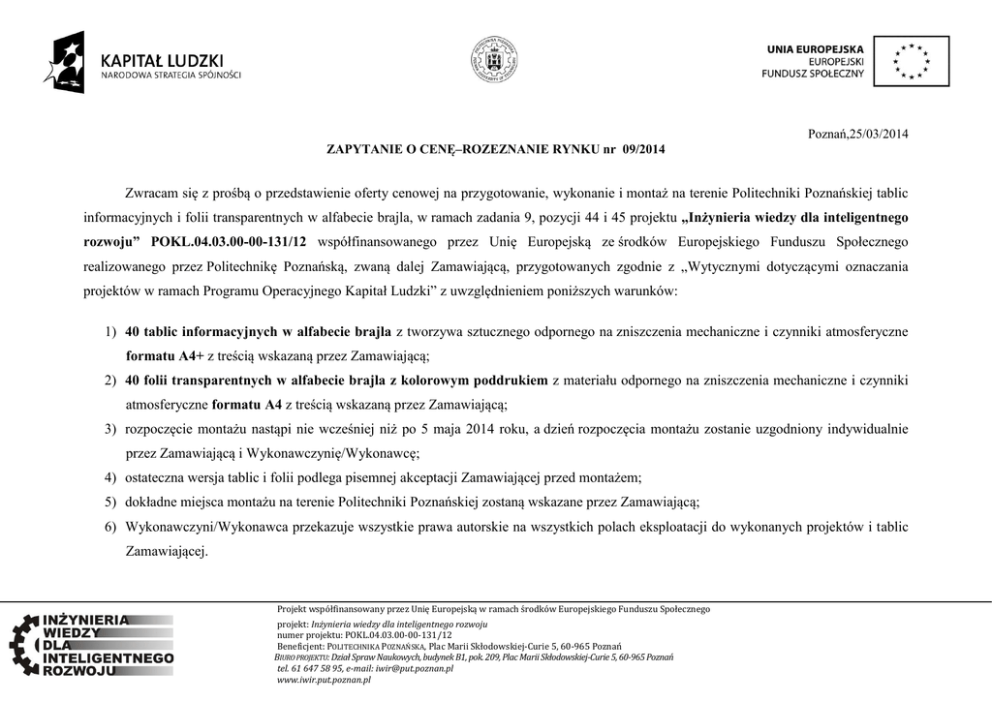 Poznań,25/03/2014 ZAPYTANIE O CENĘ–ROZEZNANIE RYNKU nr 09/2014 Zwracam się z prośbą o przedstawienie oferty cenowej na przygotowanie, wykonanie i montaż na terenie Politechniki Poznańskiej tablic informacyjnych i folii transparentnych w alfabecie brajla, w ramach zadania 9, pozycji 44 i 45 projektu „Inżynieria wiedzy dla inteligentnego rozwoju” POKL.04.03.00-00-131/12 współfinansowanego przez Unię Europejską ze środków Europejskiego Funduszu Społecznego realizowanego przez Politechnikę Poznańską, zwaną dalej Zamawiającą, przygotowanych zgodnie z „Wytycznymi dotyczącymi oznaczania projektów w ramach Programu Operacyjnego Kapitał Ludzki” z uwzględnieniem poniższych warunków: 1) 40 tablic informacyjnych w alfabecie brajla z tworzywa sztucznego odpornego na zniszczenia mechaniczne i czynniki atmosferyczne formatu A4+ z treścią wskazaną przez Zamawiającą; 2) 40 folii transparentnych w alfabecie brajla z kolorowym poddrukiem z materiału odpornego na zniszczenia mechaniczne i czynniki atmosferyczne formatu A4 z treścią wskazaną przez Zamawiającą; 3) rozpoczęcie montażu nastąpi nie wcześniej niż po 5 maja 2014 roku, a dzień rozpoczęcia montażu zostanie uzgodniony indywidualnie przez Zamawiającą i Wykonawczynię/Wykonawcę; 4) ostateczna wersja tablic i folii podlega pisemnej akceptacji Zamawiającej przed montażem; 5) dokładne miejsca montażu na terenie Politechniki Poznańskiej zostaną wskazane przez Zamawiającą; 6) Wykonawczyni/Wykonawca przekazuje wszystkie prawa autorskie na wszystkich polach eksploatacji do wykonanych projektów i tablic Zamawiającej. Projekt współfinansowany przez Unię Europejską w ramach środków Europejskiego Funduszu Społecznego projekt: Inżynieria wiedzy dla inteligentnego rozwoju numer projektu: POKL.04.03.00-00-131/12 Beneficjent: POLITECHNIKA POZNAŃSKA, Plac Marii Skłodowskiej-Curie 5, 60-965 Poznań BIURO PROJEKTU: Dział Spraw Naukowych, budynek B1, pok. 209, Plac Marii Skłodowskiej-Curie 5, 60-965 Poznań tel. 61 647 58 95, e-mail: [email protected] www.iwir.put.poznan.pl Proszę o przesłanie oferty cenowej w kwocie brutto na przedmiotowe zapytanie o cenę–rozeznanie rynku na e-mail: [email protected] lub dostarczenie jej do Biura Projektu (adres wskazany w stopce dokumentu) od poniedziałku do piątku włącznie, w godzinach od 07.00. do 15.00 w terminie do 10 dni roboczych od daty przesłania/ogłoszenia tego zapytania z wykorzystaniem poniższej tabeli: 1 2 3 4 5 6 Cena netto 1 tablicy Wysokość podatku Cena 40 tablic Cena netto 1 folii Wysokość podatku Cena 40 folii informacyjnej VAT za 1 tablicę z tworzywa transparentnej VAT za 1 folię transparentnych w alfabecie z tworzywa sztucznego z tworzywa sztucznego w alfabecie z kolorowym transparentną brajla z kolorowym w alfabecie brajla, sztucznego w alfabecie brajla, format A4+ poddrukiem z kolorowym poddrukiem, format A4 format A4+ brajla, format A4+ z podatkiem VAT w alfabecie brajla, poddrukiem w alfabecie z podatkiem VAT format A4 brajla, format A4 7 Suma: kolumna 3+6 Kryterium wyboru oferty z uwzględnieniem powyższych warunków stanowi najniższa cena brutto (z podatkiem VAT) wskazana w kolumnie 7 (suma za kolumnę 3 i kolumnę 6). Obowiązkowo należy wypełnić także cenę i wysokość podatku VAT w kolumnie 1, 2, 4, 5. W przypadku ewentualnych pytań lub wątpliwości proszę o kontakt e-mailowy na adres: [email protected] lub telefoniczny: 61-665-37-73. Z poważaniem Ilona Długa Specjalista ds. Rekrutacji i Promocji Załączniki: 1) Wytyczne dotyczące oznaczania projektów w ramach Programu Operacyjnego Kapitał Ludzki. Projekt współfinansowany przez Unię Europejską w ramach środków Europejskiego Funduszu Społecznego projekt: Inżynieria wiedzy dla inteligentnego rozwoju numer projektu: POKL.04.03.00-00-131/12 Beneficjent: POLITECHNIKA POZNAŃSKA, Plac Marii Skłodowskiej-Curie 5, 60-965 Poznań BIURO PROJEKTU: Dział Spraw Naukowych, budynek B1, pok. 209, Plac Marii Skłodowskiej-Curie 5, 60-965 Poznań tel. 61 647 58 95, e-mail: [email protected] www.iwir.put.poznan.pl