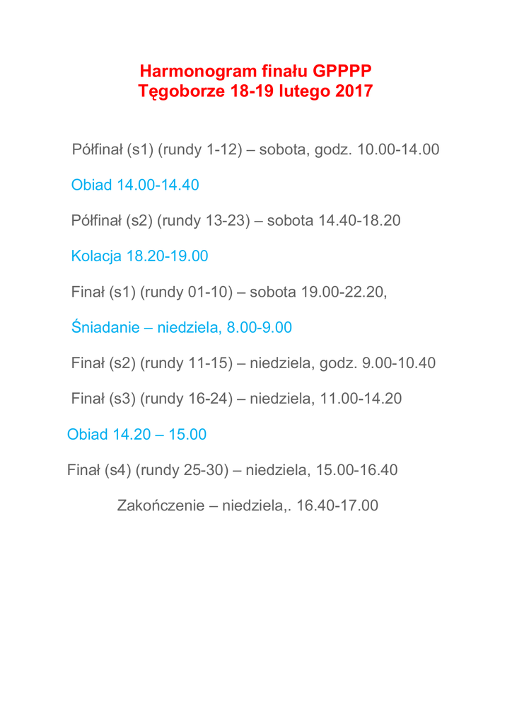 Harmonogram finału GPPPP Tęgoborze 18-19 lutego 2017 Półfinał (s1) (rundy 1-12) – sobota, godz. 10.00-14.00 Obiad 14.00-14.40 Półfinał (s2) (rundy 13-23) – sobota 14.40-18.20 Kolacja 18.20-19.00 Finał (s1) (rundy 01-10) – sobota 19.00-22.20, Śniadanie – niedziela, 8.00-9.00 Finał (s2) (rundy 11-15) – niedziela, godz. 9.00-10.40 Finał (s3) (rundy 16-24) – niedziela, 11.00-14.20 Obiad 14.20 – 15.00 Finał (s4) (rundy 25-30) – niedziela, 15.00-16.40 Zakończenie – niedziela,. 16.40-17.00