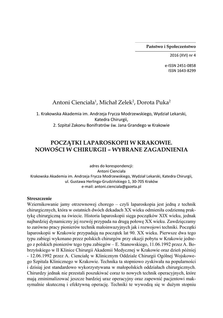 Państwo i Społeczeństwo 2016 (XVI) nr 4 e-ISSN 2451-0858 ISSN 1643-8299 Antoni Cienciała1, Michał Zelek2, Dorota Puka2 1. Krakowska Akademia im. Andrzeja Frycza Modrzewskiego, Wydział Lekarski, Katedra Chirurgii, 2. Szpital Zakonu Bonifratrów św. Jana Grandego w Krakowie POCZĄTKI LAPAROSKOPII W KRAKOWIE. NOWOŚCI W CHIRURGII – WYBRANE ZAGADNIENIA adres do korespondencji: Antoni Cienciała Krakowska Akademia im. Andrzeja Frycza Modrzewskiego, Wydział Lekarski, Katedra Chirurgii, ul. Gustawa Herlinga-Grudzińskiego 1, 30-705 Kraków e-mail: [email protected] Streszczenie Wziernikowanie jamy otrzewnowej chorego – czyli laparoskopia jest jedną z technik chirurgicznych, która w ostatnich dwóch dekadach XX wieku odmieniła codzienną praktykę chirurgiczną na świecie. Historia laparoskopii sięga początków XIX wieku, jednak najbardziej dynamiczny jej rozwój przypada na drugą połowę XX wieku. Zawdzięczamy to zarówno pracy pionierów technik małoinwazyjnych jak i rozwojowi techniki. Początki laparoskopii w Krakowie przypadają na początek lat 90. XX wieku. Pierwsze dwa tego typu zabiegi wykonano przez polskich chirurgów przy okazji pobytu w Krakowie jednego z polskich pionierów tego typu zabiegów – E. Stanowskiego, 11.06.1992 przez A. Bobrzyńskiego w II Klinice Chirurgii Akademii Medycznej w Krakowie oraz dzień później - 12.06.1992 przez A. Cienciałę w Klinicznym Oddziale Chirurgii Ogólnej Wojskowego Szpitala Klinicznego w Krakowie. Technika ta stopniowo zyskiwała na popularności i dzisiaj jest standardowo wykorzystywana w małopolskich oddziałach chirurgicznych. Chirurdzy jednak nie przestali poszukiwać coraz to nowych technik operacyjnych, które mają zminimalizować jeszcze bardziej uraz operacyjny oraz zapewnić pacjentowi maksymalnie skuteczną i efektywną operację. Techniki te wywodzą się w dużym stopniu 128 ANTONI CIENCIAŁA, MICHAŁ ZELEK, DOROTA PUKA bądź stanowią swego rodzaju rozwinięcie klasycznej laparoskopii. Wśród nich należy wymienić SILS (Single Incision Laparoscopic Surgery), NOTES (Natural Orifice Translumenal Endoscopic Surgery), operacje hybrydowe oraz roboty chirurgiczne. Słowa kluczowe: laparoskopia, historia medycyny, Kraków, robot chirurgiczny Wprowadzenie Jedną z technik chirurgicznych, która w ostatnich dwóch dekadach XX wieku odmieniła codzienną praktykę chirurgiczną na świecie jest laparoskopia. Laparoskopia jest to wziernikowanie jamy otrzewnowej chorego za pomocą specjalnego układu optycznego w celach diagnostycznych oraz terapeutycznych. Umożliwia wykonywanie skomplikowanych zabiegów chirurgicznych przez niewielkie nacięcia na jamie brzusznej pacjenta. Historia laparoskopii Historia laparoskopii sięga początków XIX wieku kiedy to w 1805r. P. Bozzini zbudował pierwszy endoskop, który miał służyć wziernikowaniu wnętrza ludzkiego ciała [1]. Niestety nie wykorzystał swojego wynalazku praktyce, gdyż ówczesne środowisko naukowe nie zaakceptowało jego nowatorskiego pomysłu. Kontynuatorem jego pomysłu był G. Kelling, który wykonał pierwszą laparoskopię u psa [2]. Pierwsze udane próby na ludziach wykonał w roku 1910 szwedzki chirurg H.C. Jacobeus [5]. Dalszy rozwój techniki laparoskopowej umożliwiło wynalezienie bezpieczniejszych oraz wygodniejszych narzędzi wykorzystywanych przez chirurgów – igły do wytwarzania odmy otrzewnowej (tzw. Igła Veressa) oraz automatycznego isuflatora umożliwiającego utrzymanie stałego ciśnienia w jamie otrzewnowej. Dało to możliwość wykonywania początkowo prostych zabiegów chirurgicznych. W 1980 roku pierwsze laparoskopowe usunięcie wyrostka robaczkowego (appendektomię) wykonał K. Semm zwany później „ojcem nowoczesnej chirurgii małoinwazyjnej” [11]. Kolejnym krokiem było wykonanie w 1985 roku przez niemieckiego chirurga E.Mühe pierwszego laparoskopowego usunięcia pęcherzyka żółciowego, jednak jego osiągnięcia nie znalazły uznania w środowisku chirurgów. Dopiero po wykonaniu, nieco później, w 1985 roku laparoskopowej cholecystektomii podczas zabiegu ginekologicznego przez P. Moureta, technika ta dzięki licznym zaletom w porównaniu do klasycznej chirurgii, jak krótsza rekonwalescencja oraz mniejsze dolegliwości bólowe, stawała się coraz popularniejsza oraz umożliwiała wykonywanie coraz większego wachlarza zabiegów. W roku 1992 liczba laparoskopowych cholecystektomii wykonywanych w Stanach Zjednoczonych zrównała się z liczbą zabiegów metodą klasyczną, by ostatecznie zdecydowanie ją wyprzeć. Obecnie POCZĄTKI LAPAROSKOPII W KRAKOWIE. NOWOŚCI W CHIRURGII... 129 praktycznie każdy zabieg chirurgiczny w jamie brzusznej może być wykonany zarówno klasycznie jak i laparoskopowo. Laparoskopia w Krakowie W Polsce pierwszy zabieg laparoskopowy wykonał w roku 1991 francuz J. Domerq, natomiast z polskich chirurgów – P. Pyda w Poznaniu w 1991 roku. W Krakowie rozpoczęto wykonywanie operacji laparoskopowych w roku 1992 kiedy zaproszony francuski chirurg wykonał laparoskopowe usunięcie pęcherzyka żółciowego w II Klinice Chirurgii AM. Natomiast pierwsze dwie cholecystektomie laparoskopowe wykonane przez chirurgów polskich w Małopolsce przeprowadzono podczas pobytu w Krakowie E. Stanowskiego – jednego z pionierów tego typu operacji w Polsce. Zabiegi te przeprowadził kolejno 11.06.1992 r. A. Bobrzyński w II Klinice Chirurgii AM oraz 12.06.1992 r. A. Cienciała w Klinice Chirurgii Ogólnej 5 Wojskowego Szpitala Klinicznego w Krakowie. Od tego czasu rozpoczął się proces coraz szerszego wykonywania tych zabiegów w krakowskich oddziałach chirurgicznych. Technika ta stopniowo zyskiwała na popularności i dzisiaj jest standardowo wykorzystywana w małopolskich oddziałach chirurgicznych. Nowości w chirurgii – wybrane zagadnienia Chirurdzy jednak nie przestali poszukiwać coraz to nowych technik operacyjnych, które mają zminimalizować jeszcze bardziej uraz operacyjny oraz zapewn