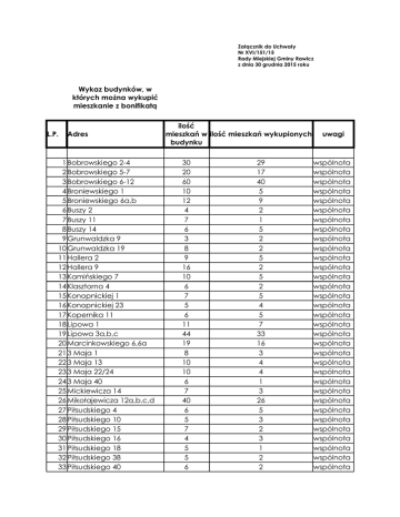 Załącznik do Uchwały Nr XVI/151/15 Rady Miejskiej Gminy Rawicz z dnia 30 grudnia 2015 roku Wykaz budynków, w których można wykupić mieszkanie z bonifikatą L.P. Adres 1 Bobrowskiego 2-4 2 Bobrowskiego 5-7 3 Bobrowskiego 6-12 4 Broniewskiego 1 5 Broniewskiego 6a,b 6 Buszy 2 7 Buszy 11 8 Buszy 14 9 Grunwaldzka 9 10 Grunwaldzka 19 11 Hallera 2 12 Hallera 9 13 Kamińskiego 7 14 Klasztorna 4 15 Konopnickiej 1 16 Konopnickiej 23 17 Kopernika 11 18 Lipowa 1 19 Lipowa 3a,b,c 20 Marcinkowskiego 6,6a 21 3 Maja 1 22 3 Maja 13 23 3 Maja 22/24 24 3 Maja 40 25 Mickiewicza 14 26 Mikołajewicza 12a,b,c,d 27 Piłsudskiego 4 28 Piłsudskiego 10 29 Piłsudskiego 15 30 Piłsudskiego 16 31 Piłsudskiego 18 32 Piłsudskiego 38 33 Piłsudskiego 40 ilość mieszkań w ilość mieszkań wykupionych budynku 30 20 60 10 12 4 7 6 3 8 9 16 10 6 7 5 6 11 44 19 8 10 10 6 7 40 6 5 7 4 5 5 6 29 17 40 5 9 2 1 5 2 2 5 2 5 2 5 4 5 7 33 16 3 4 4 1 3 26 5 3 2 3 1 2 2 uwagi wspólnota wspólnota wspólnota wspólnota wspólnota wspólnota wspólnota wspólnota wspólnota wspólnota wspólnota wspólnota wspólnota wspólnota wspólnota wspólnota wspólnota wspólnota wspólnota wspólnota wspólnota wspólnota wspólnota wspólnota wspólnota wspólnota wspólnota wspólnota wspólnota wspólnota wspólnota wspólnota wspólnota 34 Piłsudskiego 51 35 Piotra Skargi 2 36 Piotra Skargi 6,6a 37 Plac Wolności 3 38 Plac Wolności 3a 39 Plac Wolności 5 40 Podzamcze 5 41 Podzamcze 7 42 Podzamcze 12-14 43 Przyjemskiego 1 44 Przyjemskiego 3, 3a 45 Przytorze 2 46 Scherwentkego 2 47 Scherwentkego 2a,b 48 Staszica 1 49 Staszica 4 50 17 Stycznia 4 51 17 Stycznia 18-20 52 17 Stycznia 49 53 17 Stycznia 51 54 Szarych Szeregów 15 55 Średnia 5 56 Średnia 18-20 57 Wazów 16 58 Wojska Polskiego 31 59 Wojska Polskiego 46 60 Wyszyńskiego 3a,b 61 Wyszyńskiego 8 62 Wały Kościuszki 35 63 Wały Poniatowskiego 4 64 Wały Poniatowskiego 8 65 Wały Poniatowskiego 19 66 Wały Poniatowskiego 23 67 Wały Powst. Wlkp. 25a,b,c 68 Rynek Sarnowski 2 69 Sarnówka 42 70 Grota Roweckiego 9 a 71 Grota Roweckiego 9 b 72 Grota Roweckiego 9 c 73 Grota Roweckiego 9 d 74 Grunwaldzka 20 75 Grunwaldzka 22 76 Grunwaldzka 34 77 Grunwaldzka 41 78 Grunwaldzka 54 6 30 20 8 3 6 4 5 5 9 12 7 5 24 11 6 6 7 16 7 4 8 5 5 5 12 30 12 10 4 9 4 6 27 5 2 18 19 16 22 3 4 5 5 3 3 26 17 2 2 3 1 2 1 7 5 2 1 16 7 5 5 1 10 5 2 4 1 1 4 8 23 7 1 3 1 2 3 21 4 1 wspólnota wspólnota wspólnota wspólnota wspólnota wspólnota wspólnota wspólnota wspólnota wspólnota wspólnota wspólnota wspólnota wspólnota wspólnota wspólnota wspólnota wspólnota wspólnota wspólnota wspólnota wspólnota wspólnota wspólnota wspólnota wspólnota wspólnota wspólnota wspólnota wspólnota wspólnota wspólnota wspólnota wspólnota wspólnota wspólnota 79 Kopernika 6 80 Królowej Jadwigi 28 81 Mickiewicza 11 82 Piłsudskiego 16 a 83 Piłsudskiego 31 84 Plac Wolności 3 b 85 Półwiejska 3 86 Przyjemskiego 13 87 Przyjemskiego 34 88 Sienkiewicza 17 89 Sukiennicza 3 90 Szarych Szeregów 13 91 Śląska 2 – Masłowo 92 Wały Powst. Wlkp. 3 93 Wały Powst. Wlkp. 4 94 Wały Powst. Wlkp. 4 a 95 Wały Powst. Wlkp. 23 96 Kilińskiego 29 97 Paderewskiego 7 98 Zielona Wieś 73 Razem 8 5 5 4 10 4 6 4 6 3 4 5 4 2 5 6 6 11 5 2 957 462