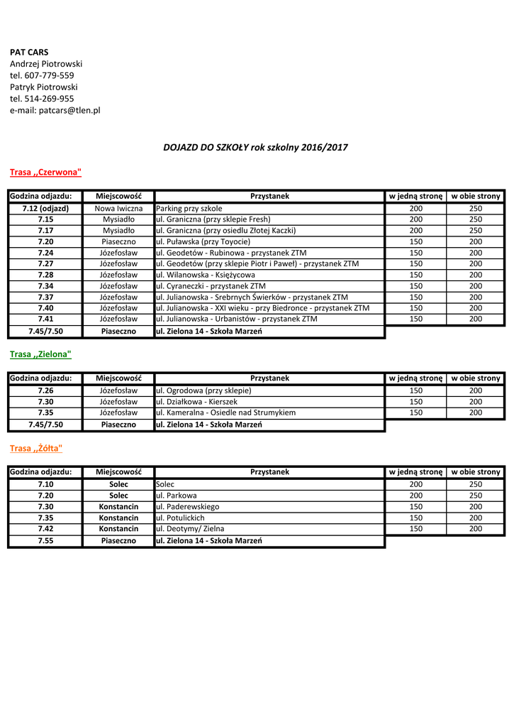 PAT CARS Andrzej Piotrowski tel. 607-779-559 Patryk Piotrowski tel. 514-269-955 e-mail: [email protected] DOJAZD DO SZKOŁY rok szkolny 2016/2017 Trasa ,,Czerwona" Godzina odjazdu: 7.12 (odjazd) 7.15 7.17 7.20 7.24 7.27 7.28 7.34 7.37 7.40 7.41 7.45/7.50 Miejscowość Nowa Iwiczna Mysiadło Mysiadło Piaseczno Józefosław Józefosław Józefosław Józefosław Józefosław Józefosław Józefosław Piaseczno Przystanek w jedną stronę 200 200 200 150 150 150 150 150 150 150 150 w obie strony 250 250 250 200 200 200 200 200 200 200 200 Parking przy szkole ul. Graniczna (przy sklepie Fresh) ul. Graniczna (przy osiedlu Złotej Kaczki) ul. Puławska (przy Toyocie) ul. Geodetów - Rubinowa - przystanek ZTM ul. Geodetów (przy sklepie Piotr i Paweł) - przystanek ZTM ul. Wilanowska - Księżycowa ul. Cyraneczki - przystanek ZTM ul. Julianowska - Srebrnych Świerków - przystanek ZTM ul. Julianowska - XXI wieku - przy Biedronce - przystanek ZTM ul. Julianowska - Urbanistów - przystanek ZTM ul. Zielona 14 - Szkoła Marzeń Miejscowość Józefosław Józefosław Józefosław Piaseczno Przystanek ul. Ogrodowa (przy sklepie) ul. Działkowa - Kierszek ul. Kameralna - Osiedle nad Strumykiem ul. Zielona 14 - Szkoła Marzeń w jedną stronę 150 150 150 w obie strony 200 200 200 Miejscowość Solec Solec Konstancin Konstancin Konstancin Piaseczno Przystanek Solec ul. Parkowa ul. Paderewskiego ul. Potulickich ul. Deotymy/ Zielna ul. Zielona 14 - Szkoła Marzeń w jedną stronę 200 200 150 150 150 w obie strony 250 250 200 200 200 Trasa ,,Zielona" Godzina odjazdu: 7.26 7.30 7.35 7.45/7.50 Trasa ,,Żółta" Godzina odjazdu: 7.10 7.20 7.30 7.35 7.42 7.55 POWRÓT ZE SZKOŁY rok szkolny 2016/2017 Trasa o 15.45 Godzina odjazdu: 15.45 15.49 15.51 15.54 15.55 15.57 15.58 16.05 Miejscowość Piaseczno Józefosław Józefosław Józefosław Józefosław Józefosław Józefosław Józefosław Przystanek ul. Zielona 14 - Szkoła Marzeń ul. Julianowska - przy XXI wieku ul. Julianowska - Srebrnych Świerków - przystanek ZTM ul. Kameralna - Osiedle nad Strumykiem ul. Wilanowska - Osiedle Platynowa ul. Wilanowska - Magnoli - Urocza ul. Wilanowska - Księżycowa ul. Ogrodowa w jedną stronę 150 150 150 150 150 150 150 Miejscowość Piaseczno Józefosław Józefosław Józefosław Józefosław Józefosław Mysiadło Nowa Iwiczna Przystanek ul. Zielona 14 - Szkoła Marzeń ul. Julianowska - Urbanistów - przystanek ZTM ul. Julianowska - XXI wieku - przy Biedronce ul. Julianowska - Srebrnych Świerków - przystanek ZTM ul. Cyraneczki ul. Geodetów - Rubinowa - przystanek ZTM ul. Graniczna (przy sklepie Fresh) Parking przy szkole w jedną stronę 150 150 150 150 150 200 200 w obie strony 200 200 200 200 200 250 250 Miejscowość Piaseczno Józefosław Józefosław Józefosław Przystanek ul. Zielona 14 - Szkoła Marzeń ul. Kameralna - Osiedle nad Strumykiem ul. Działkowa - Kierszek ul. Ogrodowa (przy sklepie) w jedną stronę 150 150 150 w obie strony 200 200 200 Miejscowość Piaseczno Konstancin Konstancin Konstancin Konstancin Solec Solec Przystanek ul. Zielona 14 - Szkoła Marzeń ul. Deotymy/ Zielna ul. Prusa/ Rycerska ul. Paderewskiego ul. Potulickich ul. Parkowa Solec w jedną stronę 150 150 150 150 200 200 w obie strony 200 200 200 200 250 250 Trasa ,,Czerwona" Godzina odjazdu: 16.35 16.41 16.42 16.44 16.46 16.54 16.58 17.05 Trasa ,,Zielona" Godzina odjazdu: 16.35 16.42 16.46 16.50 Trasa ,,Żółta" Godzina odjazdu: 16.35 16.42 16.46 16.52 16.55 17.05 17.10 * w zależności od liczby osób chętnych godziny i trasy przejazdów mogą ulec zmianie * zniżka dla rodzeństwa: 50 zł od osoby (tylko przy przewozie w obie strony) * ilość miejsc w autobusie o godz. 15.45 jest ograniczona (o zapisie decyduje kolejność zgłoszeń)