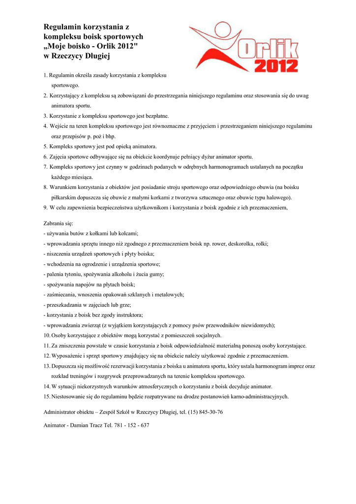 Regulamin korzystania z kompleksu boisk sportowych „Moje boisko - Orlik 2012" w Rzeczycy Długiej 1. Regulamin określa zasady korzystania z kompleksu sportowego. 2. Korzystający z kompleksu są zobowiązani do przestrzegania niniejszego regulaminu oraz stosowania się do uwag animatora sportu. 3. Korzystanie z kompleksu sportowego jest bezpłatne. 4. Wejście na teren kompleksu sportowego jest równoznaczne z przyjęciem i przestrzeganiem niniejszego regulaminu oraz przepisów p. poż i bhp. 5. Kompleks sportowy jest pod opieką animatora. 6. Zajęcia sportowe odbywające się na obiekcie koordynuje pełniący dyżur animator sportu. 7. Kompleks sportowy jest czynny w godzinach podanych w odrębnych harmonogramach ustalanych na początku każdego miesiąca. 8. Warunkiem korzystania z obiektów jest posiadanie stroju sportowego oraz odpowiedniego obuwia (na boisku piłkarskim dopuszcza się obuwie z małymi korkami z tworzywa sztucznego oraz obuwie typu halowego). 9. W celu zapewnienia bezpieczeństwa użytkownikom i korzystania z boisk zgodnie z ich przeznaczeniem, Zabrania się: - używania butów z kołkami lub kolcami; - wprowadzania sprzętu innego niż zgodnego z przeznaczeniem boisk np. rower, deskorolka, rolki; - niszczenia urządzeń sportowych i płyty boiska; - wchodzenia na ogrodzenie i urządzenia sportowe; - palenia tytoniu, spożywania alkoholu i żucia gumy; - spożywania napojów na płytach boisk; - zaśmiecania, wnoszenia opakowań szklanych i metalowych; - przeszkadzania w zajęciach lub grze; - korzystania z boisk bez zgody instruktora; - wprowadzania zwierząt (z wyjątkiem korzystających z pomocy psów przewodników niewidomych); 10. Osoby korzystające z obiektów mogą korzystać z pomieszczeń socjalnych. 11. Za zniszczenia powstałe w czasie korzystania z boisk odpowiedzialność materialną ponoszą osoby korzystające. 12. Wyposażenie i sprzęt sportowy znajdujący się na obiekcie należy użytkować zgodnie z przeznaczeniem. 13. Dopuszcza się możliwość rezerwacji korzystania z boiska u animatora sportu, który ustala harmonogram imprez oraz rozkład treningów i rozgrywek przeprowadzanych na terenie kompleksu sportowego. 14. W sytuacji niekorzystnych warunków atmosferycznych o korzystaniu z boisk decyduje animator. 15. Niestosowanie się do regulaminu będzie rozpatrywane na drodze postanowień karno-administracyjnych. Administrator obiektu – Zespół Szkół w Rzeczycy Długiej, tel. (15) 845-30-76 Animator - Damian Tracz Tel. 781 - 152 - 637
