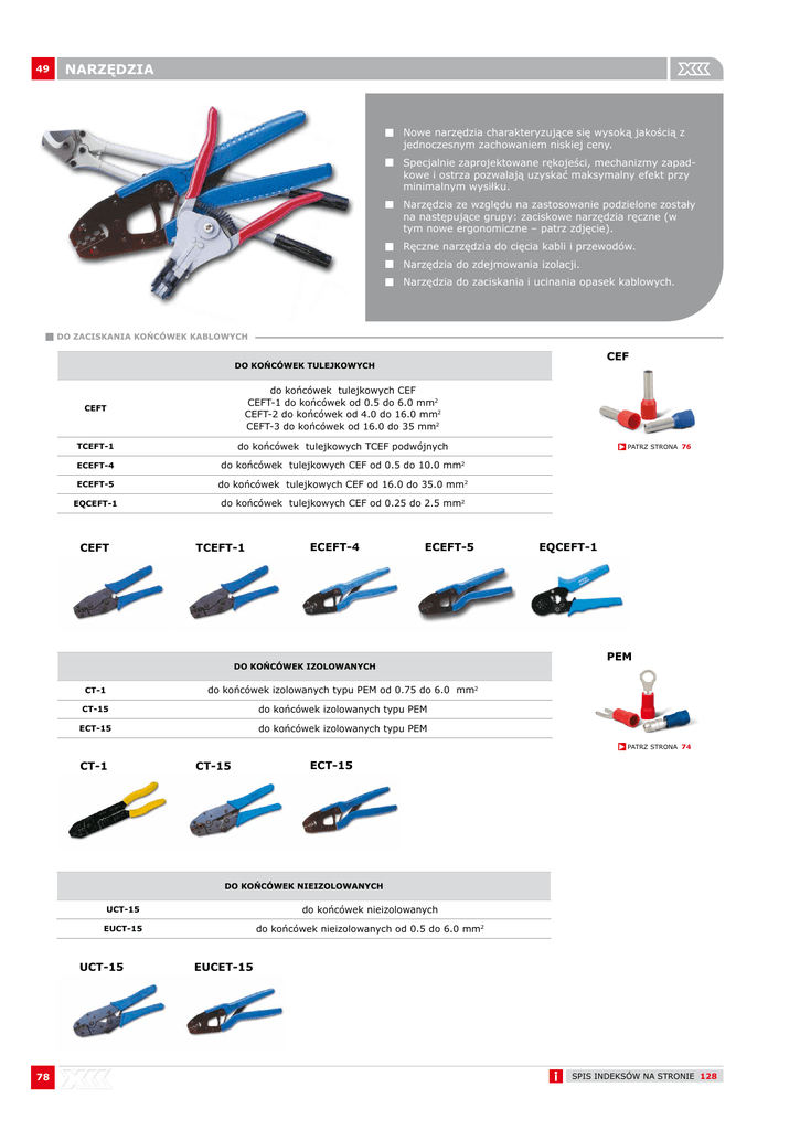 NARZĘDZIA M3 49 Nowe narzędzia charakteryzujące się wysoką12 jakością z jednoczesnym zachowaniem niskiej ceny. M3 M2 M1 Specjalnie zaprojektowane rękojeści, mechanizmy zapadkowe i ostrza pozwalają uzyskać maksymalny efekt przy 123 12 minimalnym wysiłku.1 2 3 123 M1 Narzędzia ze względu na zastosowanie podzielone zostały na następujące grupy: zaciskowe narzędzia ręczne (w tym nowe ergonomiczne – patrz zdjęcie). Ręczne narzędzia do cięcia kabli i przewodów. Narzędzia do zdejmowania izolacji. 12 CEF CEFT do końcówek tulejkowych CEF CEFT-1 do końcówek od 0.5 do 6.0 mm2 CEFT-2 do końcówek od 4.0 do 16.0 mm2 CEFT-3 do końcówek od 16.0 do 35 mm2 TCEFT-1 do końcówek tulejkowych TCEF podwójnych ECEFT-4 do końcówek tulejkowych CEF od 0.5 do 10.0 mm ECEFT-5 do końcówek tulejkowych CEF od 16.0 do 35.0 mm2 EQCEFT-1 do końcówek tulejkowych CEF od 0.25 do 2.5 mm2 123 M1 DO KOŃCÓWEK TULEJKOWYCH CEFT 123 M2 123 M3 DO ZACISKANIA KOŃCÓWEK KABLOWYCH M1 M2 Narzędzia do zaciskania i ucinania opasek kablowych. 123 PATRZ STRONA 76 2 TCEFT-1 ECEFT-4 ECEFT-5 DO KOŃCÓWEK IZOLOWANYCH CT-1 do końcówek izolowanych typu PEM od 0.75 do 6.0 mm2 CT-15 do końcówek izolowanych typu PEM ECT-15 do końcówek izolowanych typu PEM EQCEFT-1 PEM PATRZ STRONA 74 CT-1 CT-15 ECT-15 DO KOŃCÓWEK NIEIZOLOWANYCH UCT-15 do końcówek nieizolowanych EUCT-15 do końcówek nieizolowanych od 0.5 do 6.0 mm2 UCT-15 78 EUCET-15 SPIS INDEKSÓW NA STRONIE 128 COL DO KOŃCÓWEK MIEDZIANYCH CT 1.5 - 16 do końcówek miedzianych typu COL od 1.5 do 16 mm2 CT 10 - 16 do końcówek miedzianych typu COL 10, COL16 CT-50 do końcówek miedzianych typu COL od 6.0 do 50.0 mm2 CT-120 do końcówek miedzianych typu COL od 16.0 do 120.0 mm2 CT-150 do końcówek miedzianych typu COL od 25.0 do 150.0 mm2 PHCT-400 hydrauliczne narzędzie do końcówek typu COL od 35.0 do 400.0 mm2 CT 1.5-16 CT 10-16 CT-50 CT-120 PATRZ STRONA 73 CT-150 DO CIĘCIA PRZEWODÓW I KABLI TYP OPIS WC-5 ekonomiczne narzedzie do cięcia przewodów PCC-38 popularny ręczny odcinak do przewodów i kabli Cu i Al. do 38 mm2 PCC-80 popularny ręczny odcinak do przewodów i kabli Cu i Al. do 80 mm2 PCC-250 popularny ręczny odcinak do przewodów i kabli Cu i Al. do 250 mm2 PCC-400A ręczny odcinak do przewodów i kabli Cu i Al. do 400 mm2. PRCC-380 ręczny odcinak do przewodów i kabli Cu i Al do 380 mm2. PRCC-500 ręczny odcinak do przewodów i kabli Cu i Al do 500 mm2. PRTC-500 ręczny odcinak do kabli telekomunikacyjnych do 2700 par WC-5 PCC-38 PRCC-380 PRCC-500 PCC-80 PCC-250 PCC-400A PRTC-500 DO ZACISKANIA OPASEK KABLOWYCH PKB TYP OPIS TT-1 automatyczne narzędzie do zaciągania i obcinania opasek kablowych o szerokości 2.2 4.8 mm TT-3 narzędzie do zaciągania opasek kablowych, umożliwia manualne obcięcie opasek o szerokości od 3.6 - 9.0 mm TT-4 narzędzie do zaciągania opasek kablowych, umożliwia manualne obcięcie opasek o szerokości od 3.6 - 13.0 mm TT-1 TT-3 SPIS INDEKSÓW NA STRONIE 116, 128-129 PKB PATRZ STRONA 44 TT-4 79 DO ŚCIĄGANIA IZOLACJI TYP OPIS PWS-A Automatyczne narzędzie do zdejmowania izolacji z końców przewodów jedno i wielożyłowych od 0.5 do 2 mm2 PWS-B Automatyczne narzędzie do zdejmowania izolacji z końców przewodów jedno i wielożyłowych od 1.0 do 3.2 mm2 PWS-A 80 PWS-B