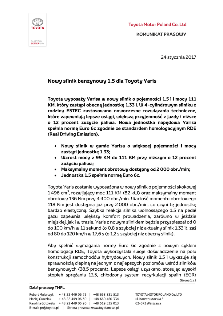 24 stycznia 2017 Nowy silnik benzynowy 1.5 dla Toyoty Yaris Toyota wyposaży Yarisa w nowy silnik o pojemności 1.5 l i mocy 111 KM, który zastąpi obecną jednostkę 1.33 l. W 4-cylindrowym silniku z rodziny ESTEC zastosowano nowoczesne rozwiązania techniczne, które zapewniają lepsze osiągi, większą przyjemność z jazdy i niższe o 12 procent zużycie paliwa. Nowa jednostka napędowa Yarisa spełnia normę Euro 6c zgodnie ze standardem homologacyjnym RDE (Real Driving Emission). Nowy silnik w gamie Yarisa o większej pojemności i mocy zastąpi jednostkę 1.33; Wzrost mocy z 99 KM do 111 KM przy niższym o 12 procent zużyciu paliwa; Maksymalny moment obrotowy dostępny od 2 000 obr./min; Jednostka 1.5 spełnia normę Euro 6c. Toyota Yaris zostanie wyposażona w nowy silnik o pojemności skokowej 1 496 cm3, rozwijający moc 111 KM (82 kW) oraz maksymalny moment obrotowy 136 Nm przy 4 400 obr./min. Wartość momentu obrotowego 118 Nm jest dostępna już przy 2 000 obr./min, co czyni tę jednostkę bardzo elastyczną. Szybka reakcja silnika wolnossącego 1.5 na pedał gazu zapewnia większy komfort prowadzenia, zarówno w jeździe miejskiej, jak i w trasie. Yaris z nowym silnikiem będzie przyspieszał od 0 do 100 km/h w 11 sekund (o 0,8 s szybciej niż aktualny silnik 1.33 l), zaś od 80 do 120 km/h w 17,6 s (o 1,2 s szybciej niż obecny silnik). Aby spełnić wymagania normy Euro 6c zgodnie z nowym cyklem homologacji RDE, Toyota wykorzystała swoje doświadczenie na polu konstrukcji samochodów hybrydowych. Nowy silnik 1.5 l wykazuje się sprawnością cieplną na jednym z najlepszych poziomów wśród silników benzynowych (38,5 procent). Lepsze osiągi uzyskano, stosując wysoki stopień sprężania 13,5, chłodzony system recyrkulacji spalin (EGR) Strona 1 z 2 i nowy system zmiennych faz rozrządu, który umożliwia szybkie przejście pracy silnika z cyklu Otto na cykl Atkinsona. Większy stopień sprężania uzyskano dzięki nowemu projektowi komory spalania i tłoków, który sprzyja także powstawaniu homogenicznej mieszanki powietrza z benzyną i szybkiemu spalaniu. Obniżenie temperatury spalania i chłodzony układ EGR pomagają uniknąć spalania stukowego. Oprócz tego, ponowne wprowadzanie odpowiedniej ilości gazów pozwala zmniejszyć straty pompowania przy niewielkich i średnich obciążeniach, co zwiększa sprawność silnika. Zastosowanie innowacyjnego systemu sterowania czasem otwarcia zaworów dolotowych VVT-iE (Variable Valve Timing intelligent system Electric Motor) umożliwia błyskawiczne przechodzenie z dynamicznego cyklu Otto na oszczędny cykl Atkinsona i z powrotem. Elektroniczne sterowanie zmianą faz wałka rozrządu zaworów dolotowych pozwala opóźnić zamknięcie zaworu dolotowego poza dolną pozycję tłoka, co powoduje efektywne skrócenie suwu sprężania i przyczynia się do dalszego zmniejszenia strat pompowania (w cyklu Atkinsona), a także pozwala przyspieszyć, by wrócić do cyklu Otto, zapewniającego lepsze osiągi przy dużych obciążeniach. Zmiana fazy wałka rozrządu zaworów wylotowych jest sterowana systemem hydraulicznym. Twórcy nowego silnika skupili się także na zmniejszeniu zużycia paliwa i emisji spalin przy prędkościach autostradowych. Po raz pierwszy w historii Toyoty nowy silnik jest wyposażony w kolektor dolotowy chłodzony cieczą. Obniżenie temperatury pozwala uniknąć wzbogacania mieszanki i w ten sposób ogranicza temperaturę spalania przy większych prędkościach, jednocześnie zmniejszając zużycie paliwa i emisję niepożądanych substancji. Tak jak w przypadku wszystkich silników z rodziny ESTEC (Economy with Superior Thermal Efficient Combustion), nowy silnik 1.5 korzysta z najnowszych udoskonaleń służących ograniczeniom tarcia. Strona 2 z 2