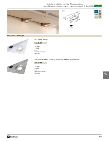 Vestavbu do nábytku a nástavbu Zabudowa meblowa для мебели, с встраиванием внутрь и надстройки сверху | Downlights Micro Line (mm) LED On/Off 40 125 125 ⌀ 26 Micro Line LED Triangle Bílá Biały Белый incl. 3x1W 5 120° 2700 K 6 cd EAN 4000870 985199 985.19 Kartáčované železo Żelazo szczotkowane Железо шероховатое incl. 3x1W 5 120° 2700 K 6 cd EAN 4000870 985182 985.18 357