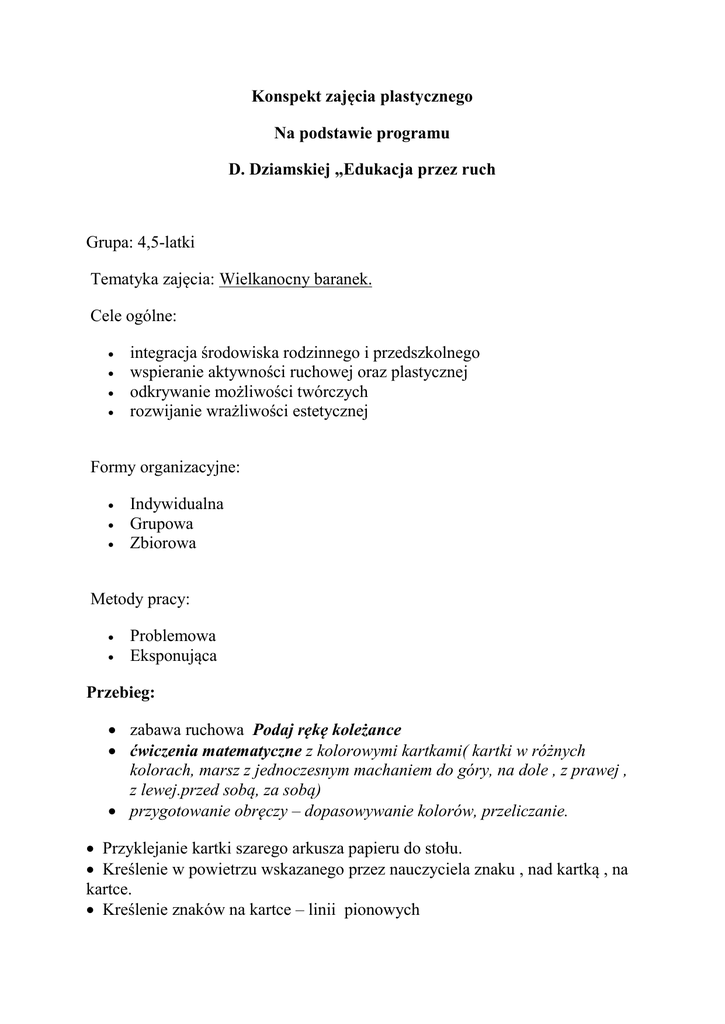 Konspekt zajęcia plastycznego Na podstawie programu D. Dziamskiej „Edukacja przez ruch Grupa: 4,5-latki Tematyka zajęcia: Wielkanocny baranek. Cele ogólne: integracja środowiska rodzinnego i przedszkolnego wspieranie aktywności ruchowej oraz plastycznej odkrywanie możliwości twórczych rozwijanie wrażliwości estetycznej Formy organizacyjne: Indywidualna Grupowa Zbiorowa Metody pracy: Problemowa Eksponująca Przebieg: zabawa ruchowa Podaj rękę koleżance ćwiczenia matematyczne z kolorowymi kartkami( kartki w różnych kolorach, marsz z jednoczesnym machaniem do góry, na dole , z prawej , z lewej.przed sobą, za sobą) przygotowanie obręczy – dopasowywanie kolorów, przeliczanie. Przyklejanie kartki szarego arkusza papieru do stołu. Kreślenie w powietrzu wskazanego przez nauczyciela znaku , nad kartką , na kartce. Kreślenie znaków na kartce – linii pionowych konstruowanie baranka z wcześniej przygotowanych szarych chmurek konstruowanie baranka – ćwiczenia w składaniu i cięciu papieru przyklejanie do arkuszy szarego papieru baranka doklejanie ozdobnej ramki zorganizowanie wystawki