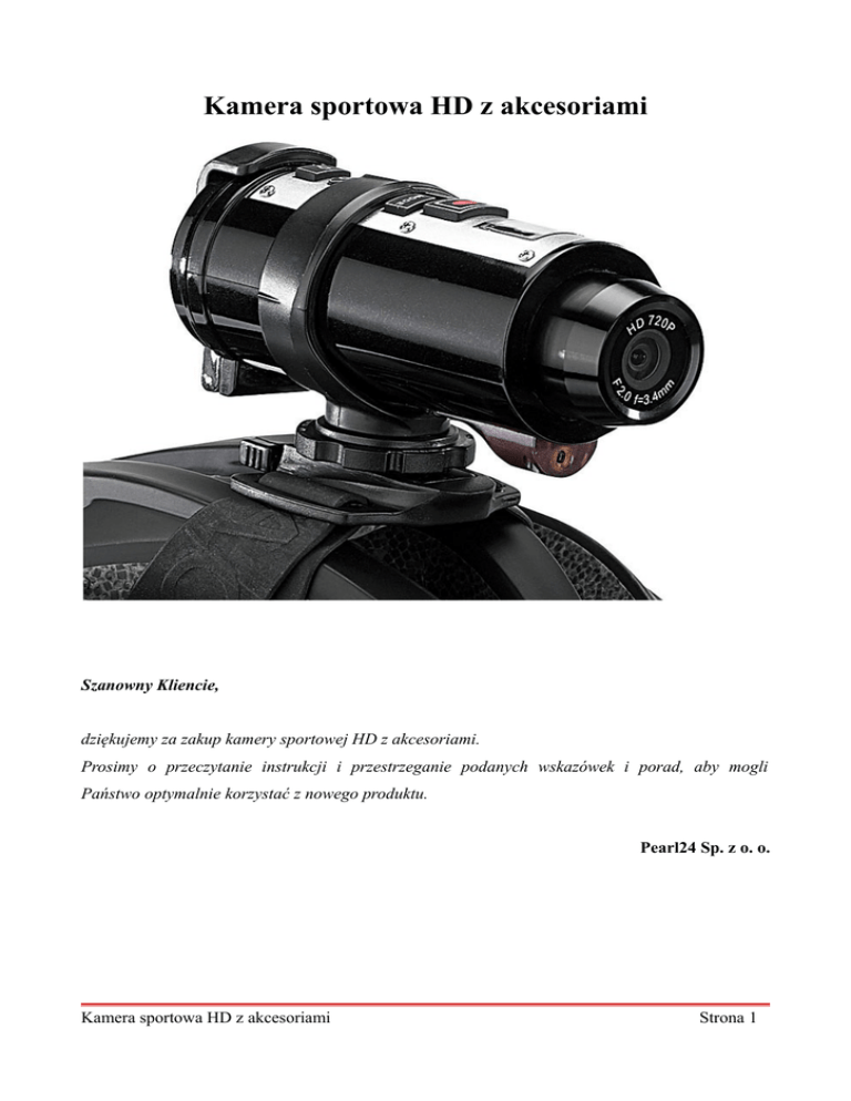 Kamera sportowa HD z akcesoriami Szanowny Kliencie, dziękujemy za zakup kamery sportowej HD z akcesoriami. Prosimy o przeczytanie instrukcji i przestrzeganie podanych wskazówek i porad, aby mogli Państwo optymalnie korzystać z nowego produktu. Pearl24 Sp. z o. o. Kamera sportowa HD z akcesoriami Strona 1 Zawartość zestawu: • Kamera • Uchwyt z przyssawką • Adapter do zamontowania na kierownicy • Gumowy pasek • Pasek na rzep • Kabel AV • Kabel HDMI • Płyta CD z oprogramowaniem • Ładowarka do akumulatora • Instrukcja obsługi. Obsługiwane systemy operacyjne • Windows 2000 • Windows XP • Windows Vista • Windows 7. Kamera sportowa HD z akcesoriami Strona 2 Bezpieczeństwo • Niniejsza instrukcja ma na celu zapoznanie Państwa z zasadami prawidłowego korzystania z produktu. Zaleca się przechowywanie instrukcji w łatwo dostępnym miejscu, aby w razie potrzeby mogli Państwo zweryfikować informacje. • Należy korzystać z produktu w sposób do tego przeznaczony. Każde inne użycie może spowodować uszkodzenie produktu lub jego otoczenia. • Wszelkie modyfikacje produktu obniżają poziom jego bezpieczeństwa. UWAGA! Istnieje ryzyko obrażeń! • Nie należy rozkładać ani naprawiać urządzenia samodzielnie! • Zaleca się ostrożne obchodzenie się z produktem. Produkt może ulec uszkodzeniu w wyniku uderzenia, wstrząsów lub upadku nawet z niewielkiej wysokości. • Nie należy zanurzać urządzenia w wodzie oraz innych płynach. • Wszelkie prawa do wprowadzania zmian technicznych oraz eliminacji błędów są zastrzeżone. Ważne wskazówki dotyczące utylizacji Urządzenia elektrycznego nie zalicza się do odpadów gospodarstwa domowego. W celu właściwej utylizacji urządzenia należy skontaktować się z organizacją odpowiedzialną za zbiórkę elektroodpadów w wybranej miejscowości. Deklaracja zgodności Pearl Agency GmbH oświadcza, że produkt PX-8169 jest zgodny z zasadniczymi wymaganiami aktualnych wytycznych. Kamera sportowa HD z akcesoriami Strona 3 Szczegóły produktu Przód kamery 1. Obiektyw 2. Otwór wylotowy wiązki laserowej Bok kamery 3. Mikrofon 4. Śruby obudowy Góra kamery 5. Wyświetlacz LCD 6. Przycisk nagrywania 7. Przycisk trybu MODE 8. Przycisk ON / OFF 9. Włączanie / wyłączanie wiązki laserowej 10. Przycisk SET Kamera sportowa HD z akcesoriami Strona 4 Tył kamery 11. Dioda LED stanu ładowania 12. Dioda LED stanu pracy 13. Slot na kartę SD 14. Komora akumulatora 15. Zamknięcie komory akumulatora 16. Złącze HDMI 17. Złącze AV 18. Złącze USB Dane techniczne • Obraz: CMOS, 5 MP • Rozdzielczość wideo: 720p / 1280 x 720 pikseli (30 fps); VGA / 640 x 480 pikseli (60 fps) • Pamięć: wbudowana pamięć 64 GB; karta pamięci SD do 32 GB • Obiektyw: F 2.0, f=3,4 mm • Akumulator: litowo-jonowy, 3,7 V / 1700 mAh • Interfejsy: USB 2.0, HDMI, wyjście AV • Obudowa: odporna na zachlapania. Kamera sportowa HD z akcesoriami Strona 5 UŻYTKOWANIE Wkładanie akumulatora 1. Najpierw należy upewnić się, że akumulator jest w pełni naładowany. 2. Następnie należy otworzyć komorę baterii, znajdującą się z tyłu kamery. 3. Należy włożyć akumulator, zwracając uwagę na prawidłową polaryzację. 4. Należy zamknąć komorę. Kamera jest teraz gotowa do pracy. Ładowanie akumulatora 1. Należy włożyć akumulator do kamery tak jak pokazano powyżej. 2. Następnie należy podłączyć kamerę za pomocą kabla USB do komputera. Akumulator jest ładowany. 3. Czerwona dioda LED wskazuje na stan ładowania. Jeśli dioda nie świeci się, oznacza to, że akumulator jest w pełni naładowany. 4. Alternatywnie można użyć dołączonej do zestawu ładowarki. Wkładanie i wyjmowanie karty SD 1. Najpierw należy otworzyć klapę ochronną z tyłu kamery. 2. Należy włożyć kartę SD. 3. Aby wyjąć kartę należy nacisnąć lekko kartę, aż wyskoczy. 4. Na koniec należy zamknąć klapę ochronną. WSKAZÓWKA Przed włożeniem karty pamięci należy sprawdzić czy nie jest zablokowana. Kamera sportowa HD z akcesoriami Strona 6 MOCOWANIE KAMERY Mocowanie za pomocą uchwytu z przyssawką 1. Kamerę należy przykręcić do uchwytu z przyssawką. 2. Uchwyt należy mocować do gładkiej powierzchni. Przyssawkę należy docisnąć na wybranym miejscu montażu i przytrzymać w tej pozycji. Należy przymocować urządzenie mocujące na przyssawce, aż zaskoczy w kliku krokach. Jeśli nie możesz przesunąć dalej urządzenia mocującego, uchwyt jest przymocowany i może być zwolniony. Aby zwolnić uchwyt należy nacisnąć dwa przełączniki suwakowe w lewo i prawo w tym samym czasie na urządzeniu mocującym. 3. Można dostosować kamerę za pomocą różnych śrub i przegubów na uchwycie. Należy lekko poluzować odpowiednie śruby, ustawić uchwyt w odpowiedniej pozycji i ponownie dokręcić śruby. Mocowanie na kasku 1. Pasek gumowy należy przełożyć przez uchwyt kamery. 2. Pasek gumowy należy przełożyć przez kask i mocno zacisnąć. Należy sprawdzić, czy pasek nie ślizga się. 3. Kamerę należy przymocować do uchwytu kamery. 4. Należy poluzować dużą śrubę kamery, aby dopasować kamerę. Po dopasowaniu należy ponownie przykręcić śrubę. 5. Należy nacisnąć dwa zaciski nad dużą śrubą kamery, aby zwolnić blokadę kamery. Teraz można wyjąc kamerę z uchwytu. 6. Alternatywnie, można przymocować kamerę za pomocą paska z rzepą na kasku z otworami wentylacyjnymi. Aby to zrobić, należy wyjąć uchwyt kamery z gumowego paska i przełożyć pasek z rzepami przez uchwyt. Kamera sportowa HD z akcesoriami Strona 7 Mocowanie na kierownicy 1. Kamerę można przymocować na kierownicy. W tym należy najpierw wziąć dołączony do zestawu adapter i wsunąć na kierownicę. 2. Adapter należy przymocować za pomocą dołączonej śruby bezpiecznie na kierownicy. 3. Kamerę należy wsunąć do uchwytu, aż do zatrzaśnięcia. 4. Należy poluzować dużą śrubę, aby dopas