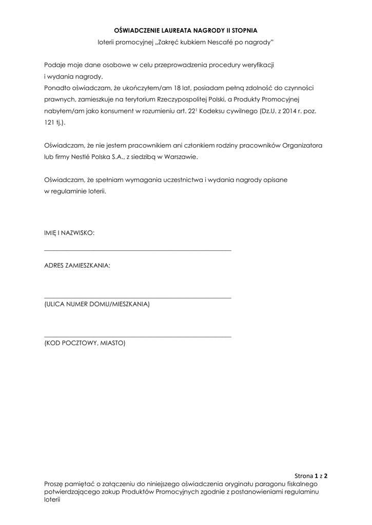 OŚWIADCZENIE LAUREATA NAGRODY II STOPNIA loterii promocyjnej „Zakręć kubkiem Nescafé po nagrody” Podaje moje dane osobowe w celu przeprowadzenia procedury weryfikacji i wydania nagrody. Ponadto oświadczam, że ukończyłem/am 18 lat, posiadam pełną zdolność do czynności prawnych, zamieszkuje na terytorium Rzeczypospolitej Polski, a Produkty Promocyjnej nabyłem/am jako konsument w rozumieniu art. 221 Kodeksu cywilnego (Dz.U. z 2014 r. poz. 121 tj.). Oświadczam, że nie jestem pracownikiem ani członkiem rodziny pracowników Organizatora lub firmy Nestlé Polska S.A., z siedzibą w Warszawie. Oświadczam, że spełniam wymagania uczestnictwa i wydania nagrody opisane w regulaminie loterii. IMIĘ I NAZWISKO: ____________________________________________________________ ADRES ZAMIESZKANIA: ____________________________________________________________ (ULICA NUMER DOMU/MIESZKANIA) ____________________________________________________________ (KOD POCZTOWY, MIASTO) Strona 1 z 2 Proszę pamiętać o załączeniu do niniejszego oświadczenia oryginału paragonu fiskalnego potwierdzającego zakup Produktów Promocyjnych zgodnie z postanowieniami regulaminu loterii Wybór formy przekazania NAGRODY II STOPNIA* (dotyczy tylko nagród pieniężnych) 1. Przekazanie nagrody w formie przelewu bankowego Wnoszę o przekazanie uzyskanej nagrody na numer rachunku bankowego: __-____-____- ____- ____-____-____ (numer rachunku bankowego) ______________________________________ IMIĘ I NAZWISKO POSIADACZA RACHUNKU Potwierdzam, iż jestem posiadaczem rachunku o powyższym numerze** ______________________________________ PODPIS I DATA **w przypadku nieposiadania rachunku bankowego i wskazania rachunku bankowego innej osoby fizycznej, należy podać jej dane osobowe (imię, nazwisko) oraz oświadczenie o zgodzie na przekazanie nagrody na jej numer rachunku bankowego. 2. Przekazanie nagrody w formie przekazu pocztowego Wnoszę o przekazanie nagrody przekazem pocztowym pod wskazany adres (wskazać jak inny niż powyżej): ______________________________________ IMIĘ I NAZWISKO ______________________________________ ADRES (ULICA, NUMER DOMU/MIESZKANIA) ______________________________________ MIEJSCOWOŚĆ, KOD POCZTOWY ______________________________________ PODPIS I DATA *Proszę wypełnić punkt 1 albo punkt 2. Strona 2 z 2 Proszę pamiętać o załączeniu do niniejszego oświadczenia oryginału paragonu fiskalnego potwierdzającego zakup Produktów Promocyjnych zgodnie z postanowieniami regulaminu loterii