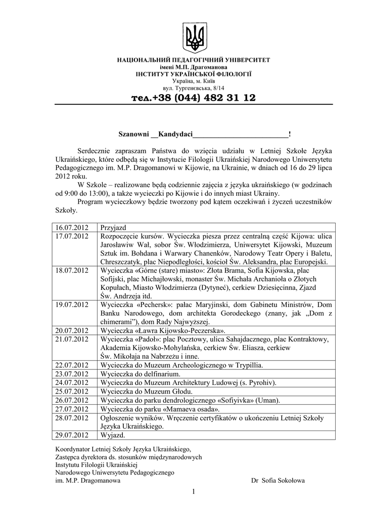 НАЦІОНАЛЬНИЙ ПЕДАГОГІЧНИЙ УНІВЕРСИТЕТ імені М.П. Драгоманова ІНСТИТУТ УКРАЇНСЬКОЇ ФІЛОЛОГІЇ Україна, м. Київ вул. Тургенєвська, 8/14 тел.+38 (044) 482 31 12 Szanowni __Kandydaci__________________________! Serdecznie zapraszam Państwa do wzięcia udziału w Letniej Szkołe Języka Ukraińskiego, które odbędą się w Instytucie Filologii Ukraińskiej Narodowego Uniwersytetu Pedagogicznego im. M.P. Dragomanowi w Kijowie, na Ukrainie, w dniach od 16 do 29 lipca 2012 roku. W Szkole – realizowane będą codziennie zajęcia z języka ukraińskiego (w godzinach od 9:00 do 13:00), a także wycieczki po Kijowie i do innych miast Ukrainy. Program wycieczkowy będzie tworzony pod kątem oczekiwań i życzeń uczestników Szkoły. 16.07.2012 17.07.2012 18.07.2012 19.07.2012 20.07.2012 21.07.2012 22.07.2012 23.07.2012 24.07.2012 25.07.2012 26.07.2012 27.07.2012 28.07.2012 29.07.2012 Przyjazd Rozpoczęcie kursów. Wycieczka piesza przez centralną część Kijowa: ulica Jarosławiw Wał, sobor Św. Włodzimierza, Uniwersytet Kijowski, Muzeum Sztuk im. Bohdana i Warwary Chanenków, Narodowy Teatr Opery i Baletu, Chreszczatyk, plac Niepodległości, kościoł Św. Aleksandra, plac Europejski. Wycieczka «Górne (stare) miasto»: Złota Brama, Sofia Kijowska, plac Sofijski, plac Michajłowski, monaster Św. Michała Archanioła o Złotych Kopułach, Miasto Włodzimierza (Dytyneć), cerkiew Dziesięcinna, Zjazd Św. Andrzeja itd. Wycieczka «Pechersk»: pałac Maryjinski, dom Gabinetu Ministrów, Dom Banku Narodowego, dom architekta Gorodeckego (znany, jak „Dom z chimerami”), dom Rady Najwyższej. Wycieczka «Ławra Kijowsko-Peczerska». Wycieczka «Padoł»: plac Pocztowy, ulica Sahajdacznego, plac Kontraktowy, Akademia Kijowsko-Mohylańska, cerkiew Św. Eliasza, cerkiew Św. Mikołaja na Nabrzeżu i inne. Wycieczka do Muzeum Archeologicznego w Trypillia. Wycieczka do delfinarium. Wycieczka do Muzeum Architektury Ludowej (s. Pyrohiv). Wycieczka do Muzeum Głodu. Wycieczka do parku dendrologicznego «Sofiyivka» (Uman). Wycieczka do parku «Mamaeva osada». Ogłoszenie wyników. Wręczenie certyfikatów o ukończeniu Letniej Szkoły Języka Ukraińskiego. Wyjazd. Koordynator Letniej Szkoły Języka Ukraińskiego, Zastępca dyrektora ds. stosunków międzynarodowych Instytutu Filologii Ukraińskiej Narodowego Uniwersytetu Pedagogicznego im. M.P. Dragomanowa 1 Dr Sofia Sokołowa INFORMACJA NARODOWY UNIWERSYTET PEDAGOGICZNY im. M.P. Dragomanowa INSTYTUT FILOLOGII UKRAIŃSKIEJ ogłasza nabór słuchaczy do Letniej Szkoły Języka Ukraińskiego Miejsce – Kijów. Celem kursu jest badanie następujących zagadnień: • nowoczesnego ukraińskiego języka literackiego, • historii kultury Ukrainy. A także: • wycieczki do historycznych i kulturalnych zabytków Kijowa i Ukrainy, • wizyty w muzeach, zwiedzanie wystaw, itp., • komunikacja z rodzimymi użytkownikami języka. Czas trwania kursu: 16 – 29 lipca 2012 roku. Zajęcia – bezpłatnie. Wydatki na podróż, ubezpieczenie, noclegi, wyżywienie, zwiedzanie muzeów, teatrów, itp. są pokrywane samodzielnie przez słuchaczy Szkoły. Lista kosztów, których mogą się spodziewać słuchacze Letniej Szkoły Języka Ukraińskiego: 1. 2. 3. 4. 5. 6. 7. Kurs językowy Pobyt (dom studencki hotelowego typu) Koszt jednej podróży: autobus, trolejbus, tramwaj metro miejski prywatny transport taksówka Wycieczki: koszt wejściówki do muzeów koszt wycieczek zwiedzanie muzeów poza Kijowem (z uwzględnieniem kosztów przejazdu) Koszt wejściówki do teatrów Średni koszt obiadu : zakłady żywienia szybkiej obsługi kawiarnie restauracje Średni koszt podręcznika języka ukraińskiego 2 bezpłatnie 120 hrywien za dobę (13,2 €) 1 hrywna 50 kopiejek (0,17 €) 2 hrywny (0,22 €) 2 hrywni 50 kopiejek (0,28 €) od 50 hrywien (5,5 €) ≈ 15–50 hrywien (1,70–5,5 €) ≈ 40–200 hrywien (bilet grupowy) (4,4–22 €) ≈ 500 hrywien (55 €) ≈ 30-200 hrywien (3,3–22 €) ≈ 50 hrywien (4,4–5,5 €) ≈ 100 hrywien (11 €) ≈ 200 hrywien (22 €) ≈ 50 hrywien (5,5 €) Na podstawie naszych dotychczasowych doświadczeń z realizacji innych programów kulturalno-oświatowych wynika, że dla zorganizowanych grup słuchaczy Letniej Szkoły Języka Ukraińskiego organizacyjnie i finansowo korzystnie jest przyjeżdżać własnym transportem. Dlatego rekomendujemy Państwu firmę, z usług której nieraz korzystaliśmy w ramach innych kulturalno-oświatowych projektów. Jesteśmy bardzo zadowoleni z jakości usług tej firmy: Firma – Przedsiębiorstwo Produkcyjno-Handlowo-Usługowe "Kesz" http://www.kesz.pnet.pl/ e-mail: [email protected] tel. kom. +48 604 980 147 – Antoni Szczubkowski fax. / faks (81) 886 62 71 W związku z koniecznością dokumentowania przedsięwzięcia uczestnicy Szkoły otrzymują Świadectwo Ukończenia Letniej Szkoły Języka Ukraińskiego Chcąc zostać słuchaczami Letniej Szkoły Języka Ukraińskiego powinniśmy wypełnić i przesłać ankietę-zgłoszenie. Kontakt: Koordynator Letniej Szkoły Języka Ukraińskiego, Zastępca dyrektora ds. stosunków międzynarodowych Instytutu Filologii Ukraińskiej Narodowego Uniwersytetu Pedagogicznego im. M.P. Dragomanowa – Sofia Sokołowa e-mail: [email protected] tel. stacjonarny praca: +38 (044) 482 31 12; tel. komórkowy (+38) 066 298 92 96. www.iuf.npu.edu.ua/movna_shkola.html albo http://www.iuf.npu.edu.ua/index.php?option=com_content&view=article&id=101&Itemid=86&lang=uk 3 Letnia Szkoła Języka Ukraińskiego ZGŁOSZENIE (wyślij e-mailem na adres: [email protected]) 1. 2. 3. 4. 5. 6. 7. 8. 9. 10. 11. 12. 13. 14. 15. 16. 17. Nazwisko, imię. Data urodzenia. Miejsce urodzenia. Obywatelstwo. Narodowość. Wykształcenie. Miejsce pracy. Post. Jakie znasz języki i w jakim stopniu. Proszę określić zakres korzystania z języka ukraińskiego – szkoły pod