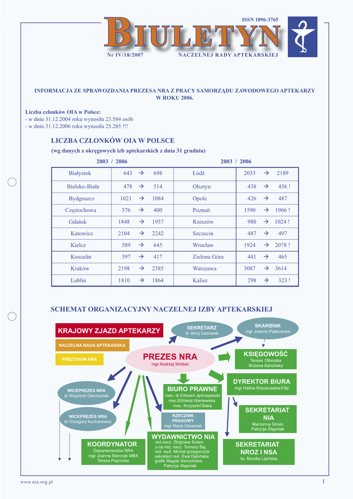 B IULETYN ISSN 1896-3765 Nr IV/18/2007 NACZELNEJ RADY APTEKARSKIEJ INFORMACJA ZE SPRAWOZDANIA PREZESA NRA Z PRACY SAMORZĄDU ZAWODOWEGO APTEKARZY W ROKU 2006. Liczba członków OIA w Polsce: - w dniu 31.12.2004 roku wynosiła 23.584 osób - w dniu 31.12.2006 roku wynosiła 25.285 !!! LICZBA CZŁONKÓW OIA W POLSCE (wg danych z okręgowych izb aptekarskich z dnia 31 grudnia) 2003 / 2006 2003 / 2006 643 698 Łódź 2033 2189 478 514 Olsztyn 438 456 ! Bydgoszcz 1021 1084 Opole 426 487 Częstochowa 376 400 Poznań 1848 1937 2104 Kielce 589 Koszalin Białystok Bielsko-Biała 1590 1966 ! Rzeszów 980 1024 ! 2242 Szczecin 487 645 Wrocław 1924 397 417 Zielona Góra Kraków 2198 2385 Warszawa Lublin 1810 1864 Kalisz Gdańsk Katowice 441 3087 298 497 2078 ! 465 3614 323 ! SCHEMAT ORGANIZACYJNY NACZELNEJ IZBY APTEKARSKIEJ KRAJOWY ZJAZD APTEKARZY SEKRETARZ dr Jerzy Łazowski SKARBNIK mgr Joanna Piątkowska NACZELNA RADA APTEKARSKA PREZYDIUM NRA PREZES NRA mgr Andrzej Wróbel KSIĘGOWOŚĆ Teresa Olborska Bożena Kamińska DYREKTOR BIURA WICEPREZES NRA dr Wojciech Giermaziak WICEPREZES NRA dr Grzegorz Kucharewicz BIURO PRAWNE mec. dr Edward Jędrzejewski mec.Elżbieta Waniewska mec. Krzysztof Baka RZECZNIK PRASOWY mgr Maria Głowniak mgr Halina Roszkowska-Filip SEKRETARIAT NIA Marzanna Stosio Patrycja Stępniak WYDAWNICTWO NIA KOORDYNATOR Departamentów NRA mgr Joanna Marczak MBA Teresa Paprocka www.nia.org.pl www.nia.org.pl red.nacz. Zbigniew Solarz z-ca red. nacz. Tomasz Baj red. wyd. Michał grzegorczyk sekretarz red. Ewa Dębińska grafik Magda Sierocińska Patrycja Stępniak SEKRETARIAT NROZ I NSA lic. Monika Lipińska 19I c.d SCHEMAT ORGANIZACYJNY NACZELNEJ IZBY APTEKARSKIEJ c.d. KOORDYNATOR PREZES NRA Departamentów NRA mgr Joanna Marczak MBA mgr Andrzej Wróbel WICEPREZES NRA dr WojciechGiermaziak Rzecznik Prasowy WICEPREZES NRA dr Grzegorz Kucharewicz mgr Maria Głowniak WYDAWNICTWO NIA red. naczelny Zbigniew Solarz z-ca red. nacz. Tomasz Baj red. wyd. Michał Grzegorczyk sekretarz red. Ewa Dębińska grafik Magda Sierocińska Patrycja Stępniak Dep. Informacji i Rejestru Farmaceutów mgr Michał Grzegorczyk KOORDYNATORZY DEPARTAMENTÓW PIONU ORGANIZACYJNEGO (PO) KOORDYNATORZY DEPARTAMENTÓW PIONU GOSPODARCZEGO (PG) KOORDYNATORZY DEPARTAMENTÓW PIONU PRAWNEGO (PP) Dep. Spraw Zagranicznych dr Jerzy Łazowski Dep. Prawny mgr Barbara Kozicka Dep. Aptek Ogólnodostępnych dr Grzegorz Kucharewicz Dep. Odwoławczy dr Stefan Kaliszuk Dep. Etyki i Deontologii Zawodu mgr Marian Mikulski Dep. Aptek Szpitalnych mgr Janina Pawłowska Forum Młodych Aptekarzy mgr Henryk Domaradzki Dep. Nauki i Szkolenia dr Marek Jędrzejczak Dep. Hurtowni Farmaceutycznych mgr Henrietta Kania CZŁONKOWIE PREZYDIUM NRA: PREZYDIUM NRA dr Marek Jędrzejczak (Kielce) mgr Barbara Kozicka (Warszawa) dr Stefan Kaliszuk (Lublin) mgr Marian Mikulski (Lublin) mgr Janina Pawłowska (Kraków) mgr Piotr Jóźwiakowski (Kraków) SEKRETARZ dr Jerzy Łazowski (Warszawa) Bez prawa głosu w posiedzeniach uczestniczą: mgr Maria Głowniak (Warszawa) – Rzecznik Prasowy mgr Michał Grzegorczyk (Lublin) – Dep. Informacji SKARBNIK PREZES NRA mgr Andrzej Wróbel (Bydgoszcz) WICEPREZES NRA dr Grzegorz Kucharewicz (Białystok) Braliśmy udział i współorganizowaliśmy: • Spotkania robocze z delegacją niemieckiej izby aptekarskiej ABDA w Davos i Berlinie (luty, maj), • Zgromadzenie Delegatów Grupy Farmaceutycznej Unii Europejskiej PGUE w Lizbonie (czerwiec), • Sympozjum międzynarodowe „O roli samorządów aptekarskich…” w Warszawie (wrzesień), • Międzynarodowy Kongres Naukowo-Szkoleniowy Farmaceutów w Krakowie (październik). Wzięliśmy aktywny udział w 19 krajowych konferencjach: - Koalicja Teraz Zdrowie - 3 x Farmacja 20 II mgr Joanna Piątkowska (Wrocław) WICEPREZES NRA dr Wojciech Giermaziak (Łódź) - Rynek Zdrowia - Debaty o Zdrowiu - Forum Ekonomiczne Aptekarzy - Dni Farmacji - Konferencje Naukowe PTFarm itp… Patronowaliśmy targom farmaceutycznym Torfarmu i dwa razy „Forum Medicamentum” Prospera. • Z inicjatywy NRA odbyło się 101 spotkań z delegacjami organizacji zawodowych i społecznych oraz osobami indywidualnymi. • W następnych 116 spotkaniach członkowie władz samorządu brali udział jako goście zaproszeni. www.nia.org.pl TRADYCJE • Wydano łącznie 50 Kurierów NIA z bieżącymi informacjami, które stanowią szczegółową ilustrację wydarzeń 2006 roku. • Wydano 7+2 miesięczniki Aptekarz Polski. Realizacja zadań w ramach dotacji z Ministerstwa Zdrowia: • Prowadzenie rejestru ukaranych farmaceutów. Założono 80 kart w tym: a) wpis do rejestru - 40 b) skreślenie z rejestru - 17 c) zapytanie o karalność - 23 • Postępowanie w zakresie odpowiedzialności zawodowej prowadzone przez Naczelnego Rzecznika Odpowiedzialności Zawodowej - 40 spraw • Postępowanie w zakresie odpowiedzialności zawodowej prowadzone przez Naczelny Sąd Aptekarski - 7 spraw Pozyskano na roczną działalność ustawową: - z Ministerstwa Zdrowia na rejestr 66.800,- ze sponsoringu ponad 300.000,- z działalności gospodarczej ok. 280.000,- ze składek członkowskich ok. 1.800.000,W ciągu trzech lat odbudowano rezerwę finansową na organizację Krajowego Zjazdu Aptekarzy w kwocie 180.000,Prezydia NRA 2006 • Odbyło się 14 na 11 zaplanowanych posiedzeń Prezydiów NRA - Poruszono ponad 70 różnych problemów z 15 grup tematycznych. Naczelne Rady Aptekarskie 2006 • Odbyło się 6 na 5 zaplanowanych posiedzeń NRA. - Poruszono 75 różnych problemów z 15 grup tematycznych. - Podjęto 46 uchwał 67 apeli, stanowisk i postanowień NRA. Sekretariat 2006 • Zanotowano ruch 1908 pism. Dla porównania: - w roku 2005 było ich ponad 1600 - w 2004 - 1720, - a w 2003 - 1079. (Coraz częściej przychodzą zapytania pocztą elektroniczną i dla części odpowiedzi są udzielane poza ewidencją tą samą drogą.) • W tym wychodzących pism 388 Dla porównania: - w roku 2005 - 365 - w 2004 - 378 - w 2003 -