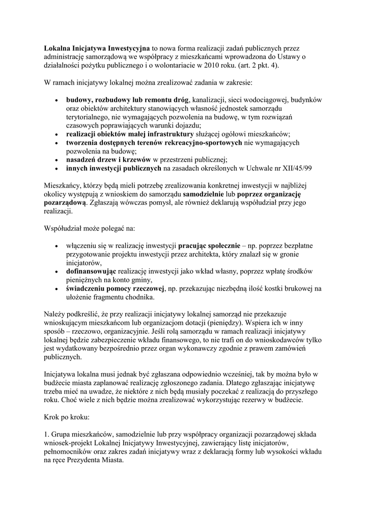 Lokalna Inicjatywa Inwestycyjna to nowa forma realizacji zadań publicznych przez administrację samorządową we współpracy z mieszkańcami wprowadzona do Ustawy o działalności pożytku publicznego i o wolontariacie w 2010 roku. (art. 2 pkt. 4). W ramach inicjatywy lokalnej można zrealizować zadania w zakresie: budowy, rozbudowy lub remontu dróg, kanalizacji, sieci wodociągowej, budynków oraz obiektów architektury stanowiących własność jednostek samorządu terytorialnego, nie wymagających pozwolenia na budowę, w tym rozwiązań czasowych poprawiających warunki dojazdu; realizacji obiektów małej infrastruktury służącej ogółowi mieszkańców; tworzenia dostępnych terenów rekreacyjno-sportowych nie wymagających pozwolenia na budowę; nasadzeń drzew i krzewów w przestrzeni publicznej; innych inwestycji publicznych na zasadach określonych w Uchwale nr XII/45/99 Mieszkańcy, którzy będą mieli potrzebę zrealizowania konkretnej inwestycji w najbliżej okolicy występują z wnioskiem do samorządu samodzielnie lub poprzez organizację pozarządową. Zgłaszają wówczas pomysł, ale również deklarują współudział przy jego realizacji. Współudział może polegać na: włączeniu się w realizację inwestycji pracując społecznie – np. poprzez bezpłatne przygotowanie projektu inwestycji przez architekta, który znalazł się w gronie inicjatorów, dofinansowując realizację inwestycji jako wkład własny, poprzez wpłatę środków pieniężnych na konto gminy, świadczeniu pomocy rzeczowej, np. przekazując niezbędną ilość kostki brukowej na ułożenie fragmentu chodnika. Należy podkreślić, że przy realizacji inicjatywy lokalnej samorząd nie przekazuje wnioskującym mieszkańcom lub organizacjom dotacji (pieniędzy). Wspiera ich w inny sposób – rzeczowo, organizacyjnie. Jeśli rolą samorządu w ramach realizacji inicjatywy lokalnej będzie zabezpieczenie wkładu finansowego, to nie trafi on do wnioskodawców tylko jest wydatkowany bezpośrednio przez organ wykonawczy zgodnie z prawem zamówień publicznych. Inicjatywa lokalna musi jednak być zgłaszana odpowiednio wcześniej, tak by można było w budżecie miasta zaplanować realizację zgłoszonego zadania. Dlatego zgłaszając inicjatywę trzeba mieć na uwadze, że niektóre z nich będą musiały poczekać z realizacją do przyszłego roku. Choć wiele z nich będzie można zrealizować wykorzystując rezerwy w budżecie. Krok po kroku: 1. Grupa mieszkańców, samodzielnie lub przy współpracy organizacji pozarządowej składa wniosek-projekt Lokalnej Inicjatywy Inwestycyjnej, zawierający listę inicjatorów, pełnomocników oraz zakres zadań inicjatywy wraz z deklaracją formy lub wysokości wkładu na ręce Prezydenta Miasta. 2. W terminie 30 dni odpowiednia komórka/jednostka właściwa do zadania przekazuje Prezydentowi opinię. 3. Prezydent na podstawie wniosku i opinii podejmuje decyzję o realizacji wniosku, kierując się celowością, pilnością wykonania zadania, wielkością wkładu stron, a także liczbą beneficjentów, którzy skorzystają z realizacji inicjatywy. 4. W przypadku pozytywnej opinii Prezydent przekazuje projekt Lokalnej Inicjatywy Inwestycyjnej odpowiedniej komórce do realizacji. 5. Opiekę nad zrealizowanym obiektem przejmuje nieodpłatnie miasto Gdynia. Najprawdopodobniej w połowie tego roku mieszkańcy Gdyni będą mogli korzystać z Lokalnej Inicjatywy Inwestycyjne