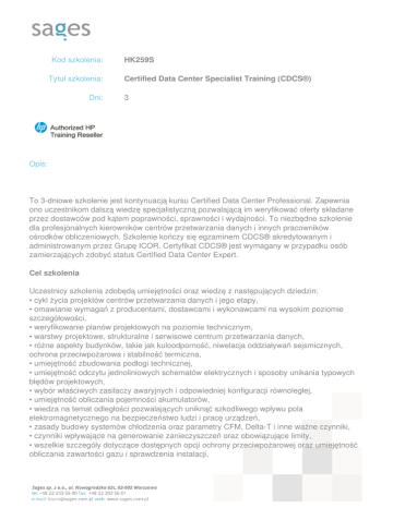 Kod szkolenia: Tytuł szkolenia: Dni: HK259S Certified Data Center Specialist Training (CDCS®) 3 Opis: To 3-dniowe szkolenie jest kontynuacją kursu Certified Data Center Professional. Zapewnia ono uczestnikom dalszą wiedzę specjalistyczną pozwalającą im weryfikować oferty składane przez dostawców pod kątem poprawności, sprawności i wydajności. To niezbędne szkolenie dla profesjonalnych kierowników centrów przetwarzania danych i innych pracowników ośrodków obliczeniowych. Szkolenie kończy się egzaminem CDCS® akredytowanym i administrowanym przez Grupę ICOR. Certyfikat CDCS® jest wymagany w przypadku osób zamierzających zdobyć status Certified Data Center Expert. Cel szkolenia Uczestnicy szkolenia zdobędą umiejętności oraz wiedzę z następujących dziedzin: • cykl życia projektów centrów przetwarzania danych i jego etapy, • omawianie wymagań z producentami, dostawcami i wykonawcami na wysokim poziomie szczegółowości, • weryfikowanie planów projektowych na poziomie technicznym, • warstwy projektowe, strukturalne i serwisowe centrum przetwarzania danych, • różne aspekty budynków, takie jak kuloodporność, niwelacja oddziaływań sejsmicznych, ochrona przeciwpożarowa i stabilność termiczna, • umiejętność zbudowania podłogi technicznej, • umiejętność odczytu jednoliniowych schematów elektrycznych i sposoby unikania typowych błędów projektowych, • wybór właściwych zasilaczy awaryjnych i odpowiedniej konfiguracji równoległej, • umiejętność obliczania pojemności akumulatorów, • wiedza na temat odległości pozwalających uniknąć szkodliwego wpływu pola elektromagnetycznego na bezpieczeństwo ludzi i pracę urządzeń, • zasady budowy systemów chłodzenia oraz parametry CFM, Delta-T i inne ważne czynniki, • czynniki wpływające na generowanie zanieczyszczeń oraz obowiązujące limity, • wszelkie szczegóły dotyczące dostępnych opcji ochrony przeciwpożarowej oraz umiejętność obliczania zawartości gazu i sprawdzenia instalacji, • umiejętność zmierzenia i poprawy sprawności energetycznej centrum przetwarzania danych. Adresaci szkolenia Szkolenie jest przeznaczone przede wszystkim dla specjalistów z zakresu informatyki, centrów przetwarzania danych i zarządzania obiektami, którzy pracują w takich centrach lub realizują zadania z nimi związane. W kursie mogą też wziąć udział osoby odpowiedzialne za dostępność centrów przetwarzania danych i łatwość zarządzania nimi oraz za usprawnienia w tym obszarze. Wymagania Uczestnicy szkolenia Certified Data Center Specialist - CDCS® muszą dysponować ważnym certyfikatem Certified Data Center Professional - CDCP® HK258S Informacje dodatkowe Szkolenie może być zrealizowane w języku polskim lub angielskim. Uczestnicy otrzymują akredytowane materiały szkoleniowe w języku angielskim. Program szkolenia: 1. Przegląd projektu/cyklu życia centrum przetwarzania danych. Przegląd etapów cyklu życia centrum przetwarzania danych. Planowanie, modyfikowanie struktury i ciągłe usprawnianie. 2. Warstwy. Historia definicji „warstw”. Definicje, kategorie i punkty pomiarowe warstw. Opcje nadmiarowości. Metodyka TIMS (Tiered Infrastructure Maintenance Standards). 3. Zagadnienia i standardy związane z budynkami. Wymagania w dziedzinie obciążenia i grubości podłogi. Stopień ochrony przeciwpożarowej dla ścian i szyb. Ochrona przed wybuchem. Kuloodporność. Ochrona przeciwwłamaniowa. 4. Zaawansowane zagadnienia dotyczące podłogi technicznej i sufitu podwieszanego. Wytyczne dotyczące instalacji podłogi technicznej pozwalające zapewnić, że wykonawcy zainstalują odpowiednio zamkniętą i wypoziomowaną podłogę tego typu. Wybór odpowiednich płytek i ich lokalizacja. Konstrukcje podłogowe niwelujące oddziaływania sejsmiczne. Wybór odpowiedniego sufitu podwieszanego. 5. Zaawansowane systemy zasilania. Schemat infrastruktury zasilania. Agregaty prądotwórcze. Systemy zasilania awaryjnego (UPS). Filtry harmonicznych. Systemy akumulatorów. 6. Zaawansowane aspekty związane z polem elektromagnetycznym. Różnice między polem elektromagnetycznym wokół obwodów jedno- i trójfazowych oraz przewodów szynowych. Dostępne możliwości pomiaru pola elektromagnetycznego i interpretacja wyników pomiarów jednoosiowych i złożonych. Wytyczne dotyczące bezpiecznej odległości dla sprzętu i ludzi. Obliczanie współczynnika tłumienia pola elektromagnetycznego dla ekranów ochronnych. Przenikalność i nasycenie materiałów. 7. Zaawansowane systemy chłodzenia. Definicje klas środowiskowych i specyfikacje termiczne. Przepływ powietrza wokół sprzętu oraz definicje i limity dla parametru Delta-T. Planowanie rozmieszczenia sprzętu naziemnego, stelaży i urządzeń chłodzących. Obliczanie i konwersja wymagań CFM. Specyfikacje dotyczące systemów klimatyzacji oraz kryteria wyboru właściwego klimatyzatora o odpowiedniej mocy i przepływie. Techniki optymalizacji przepływu powietrza. Wytyczne dotyczące nadmiarowości klimatyzatorów. Wytyczne dotyczące chłodzenia cieczą w centrach przetwarzania danych. 8. Zaawansowana ochrona przeciwpożarowa. Trójkąt spalania i elementy pozwalające zatrzymać pożar. Szczegóły dotyczące systemów wykrywania ognia (VESDA, VIEW, czujniki dymu). Zagadnienia dotyczące instalacji czujników. Różnice między systemami wodnymi, suchymi instalacjami tryskaczowymi i systemami wstępnego reagowania, a także przyczyny i sposoby wykrywania ich nieskuteczności. Szczegóły dotyczące systemów gaśniczych zawierających gazy obojętne, fluorowane gazy cieplarniane oraz halony, a także kryteria. wyboru właściwego gazu dla określonego centrum przetwarzania danych. Obliczanie zawartości gazu wystarczającej do powstrzymania ognia. Inne wymogi dotyczące gazowych systemów gaśniczych (czas uwalniania, czas utrzymywania, wymagania w zakresie instalacji rur i inne istotne czy