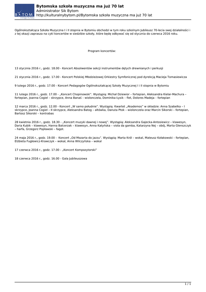 Bytomska szkoła muzyczna ma już 70 lat Administrator Sik Bytom http://kulturalnybytom.pl/Bytomska szkoła muzyczna ma już 70 lat Ogólnokształcąca Szkoła Muzyczna I i II stopnia w Bytomiu obchodzi w tym roku szkolnym Jubileusz 70-lecia swej działalności i z tej okazji zaprasza na cykl koncertów w siedzibie szkoły, które będę odbywać się od stycznia do czerwca 2016 roku. Program koncertów: 13 stycznia 2016 r., godz. 18.00 - Koncert Absolwentów sekcji instrumentów dętych drewnianych i perkusji 21 stycznia 2016 r., godz. 17.00 - Koncert Polskiej Młodzieżowej Orkiestry Symfonicznej pod dyrekcją Macieja Tomasiewicza 9 lutego 2016 r., godz. 17.00 - Koncert Pedagogów Ogólnokształcącej Szkoły Muzycznej I i II stopnia w Bytomiu 11 lutego 2016 r., godz. 17.00 - „Koncert Chopinowski”. Wystąpią: Michał Dziewior – fortepian, Aleksandra Kielar-Machura – fortepian, Joanna Cogiel – skrzypce, Anna Banaś – wiolonczela, Dominika Łysik – flet, Dolores Madeja – fortepian 12 marca 2016 r., godz. 12.00 - Koncert „W samo południe”. Wystąpią: Kwartet „Akademos” w składzie: Anna Szabelka – I skrzypce, Joanna Cogiel – II skrzypce, Aleksandra Batog – altówka, Danuta Ptok – wiolonczela oraz Marcin Sikorski – fortepian, Bartosz Sikorski – kontrabas 28 kwietnia 2016 r., godz. 18.30 - „Koncert muzyki dawnej i nowej”. Wystąpią: Aleksandra Gajecka-Antosiewicz – klawesyn, Daria Kubik – klawesyn, Hanna Balcerzak – klawesyn, Anna Katyńska – viola da gamba, Katarzyna Nej – obój, Marta Glenszczyk – harfa, Grzegorz Popławski – fagot. 24 maja 2016 r., godz. 19.00 - Koncert „Od Mozarta do jazzu”. Wystąpią: Marta Król – wokal, Mateusz Kołakowski – fortepian, Elżbieta Fuglewicz-Krawczyk – wokal, Anna Wilczyńska – wokal 17 czerwca 2016 r., godz. 17.00 - „Koncert Kompozytorski” 18 czerwca 2016 r., godz. 16.00 - Gala Jubileuszowa 1/1 Powered by TCPDF (www.tcpdf.org)
