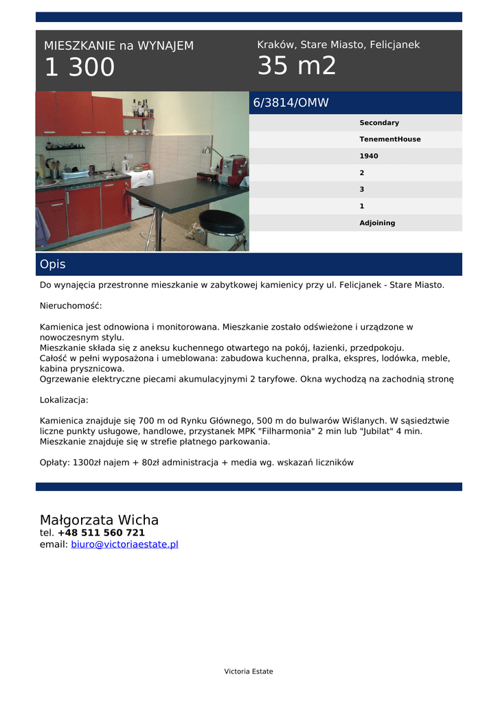 MIESZKANIE na WYNAJEM 1 300 Kraków, Stare Miasto, Felicjanek 35 m2 6/3814/OMW Secondary TenementHouse 1940 2 3 1 Adjoining Opis Do wynajęcia przestronne mieszkanie w zabytkowej kamienicy przy ul. Felicjanek - Stare Miasto. Nieruchomość: Kamienica jest odnowiona i monitorowana. Mieszkanie zostało odświeżone i urządzone w nowoczesnym stylu. Mieszkanie składa się z aneksu kuchennego otwartego na pokój, łazienki, przedpokoju. Całość w pełni wyposażona i umeblowana: zabudowa kuchenna, pralka, ekspres, lodówka, meble, kabina prysznicowa. Ogrzewanie elektryczne piecami akumulacyjnymi 2 taryfowe. Okna wychodzą na zachodnią stronę Lokalizacja: Kamienica znajduje się 700 m od Rynku Głównego, 500 m do bulwarów Wiślanych. W sąsiedztwie liczne punkty usługowe, handlowe, przystanek MPK "Filharmonia" 2 min lub "Jubilat" 4 min. Mieszkanie znajduje się w strefie płatnego parkowania. Opłaty: 1300zł najem + 80zł administracja + media wg. wskazań liczników Małgorzata Wicha tel. +48 511 560 721 email: [email protected] Victoria Estate Powered by TCPDF (www.tcpdf.org)