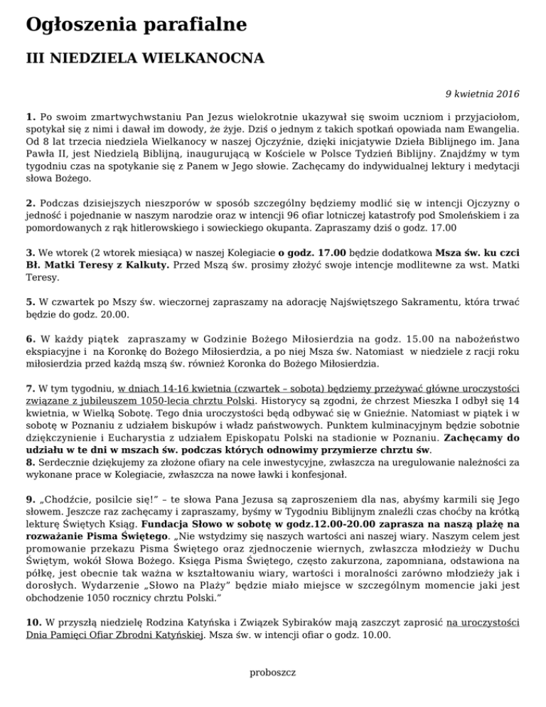 Ogłoszenia parafialne III NIEDZIELA WIELKANOCNA 9 kwietnia 2016 1. Po swoim zmartwychwstaniu Pan Jezus wielokrotnie ukazywał się swoim uczniom i przyjaciołom, spotykał się z nimi i dawał im dowody, że żyje. Dziś o jednym z takich spotkań opowiada nam Ewangelia. Od 8 lat trzecia niedziela Wielkanocy w naszej Ojczyźnie, dzięki inicjatywie Dzieła Biblijnego im. Jana Pawła II, jest Niedzielą Biblijną, inaugurującą w Kościele w Polsce Tydzień Biblijny. Znajdźmy w tym tygodniu czas na spotykanie się z Panem w Jego słowie. Zachęcamy do indywidualnej lektury i medytacji słowa Bożego. 2. Podczas dzisiejszych nieszporów w sposób szczególny będziemy modlić się w intencji Ojczyzny o jedność i pojednanie w naszym narodzie oraz w intencji 96 ofiar lotniczej katastrofy pod Smoleńskiem i za pomordowanych z rąk hitlerowskiego i sowieckiego okupanta. Zapraszamy dziś o godz. 17.00 3. We wtorek (2 wtorek miesiąca) w naszej Kolegiacie o godz. 17.00 będzie dodatkowa Msza św. ku czci Bł. Matki Teresy z Kalkuty. Przed Mszą św. prosimy złożyć swoje intencje modlitewne za wst. Matki Teresy. 5. W czwartek po Mszy św. wieczornej zapraszamy na adorację Najświętszego Sakramentu, która trwać będzie do godz. 20.00. 6. W każdy piątek zapraszamy w Godzinie Bożego Miłosierdzia na godz. 15.00 na nabożeństwo ekspiacyjne i na Koronkę do Bożego Miłosierdzia, a po niej Msza św. Natomiast w niedziele z racji roku miłosierdzia przed każdą mszą św. również Koronka do Bożego Miłosierdzia. 7. W tym tygodniu, w dniach 14-16 kwietnia (czwartek – sobota) będziemy przeżywać główne uroczystości związane z jubileuszem 1050-lecia chrztu Polski. Historycy są zgodni, że chrzest Mieszka I odbył się 14 kwietnia, w Wielką Sobotę. Tego dnia uroczystości będą odbywać się w Gnieźnie. Natomiast w piątek i w sobotę w Poznaniu z udziałem biskupów i władz państwowych. Punktem kulminacyjnym będzie sobotnie dziękczynienie i Eucharystia z udziałem Episkopatu Polski na stadionie w Poznaniu. Zachęcamy do udziału w te dni w mszach św. podczas których odnowimy przymierze chrztu św. 8. Serdecznie dziękujemy za złożone ofiary na cele inwestycyjne, zwłaszcza na uregulowanie należności za wykonane prace w Kolegiacie, zwłaszcza na nowe ławki i konfesjonał. 9. „Chodźcie, posilcie się!” – te słowa Pana Jezusa są zaproszeniem dla nas, abyśmy karmili się Jego słowem. Jeszcze raz zachęcamy i zapraszamy, byśmy w Tygodniu Biblijnym znaleźli czas choćby na krótką lekturę Świętych Ksiąg. Fundacja Słowo w sobotę w godz.12.00-20.00 zaprasza na naszą plażę na rozważanie Pisma Świętego. „Nie wstydzimy się naszych wartości ani naszej wiary. Naszym celem jest promowanie przekazu Pisma Świętego oraz zjednoczenie wiernych, zwłaszcza młodzieży w Duchu Świętym, wokół Słowa Bożego. Księga Pisma Świętego, często zakurzona, zapomniana, odstawiona na półkę, jest obecnie tak ważna w kształtowaniu wiary, wartości i moralności zarówno młodzieży jak i dorosłych. Wydarzenie „Słowo na Plaży” będzie miało miejsce w szczególnym momencie jaki jest obchodzenie 1050 rocznicy chrztu Polski.” 10. W przyszłą niedzielę Rodzina Katyńska i Związek Sybiraków mają zaszczyt zaprosić na uroczystości Dnia Pamięci Ofiar Zbrodni Katyńskiej. Msza św. w intencji ofiar o godz. 10.00. proboszcz