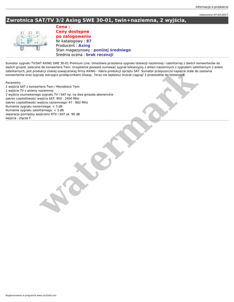 Informacje o produkcie Utworzono 07-03-2017 Zwrotnica SAT/TV 3/2 Axing SWE 30-01, twin+naziemna, 2 wyjścia, Cena : Ceny dostępne po zalogowaniu Nr katalogowy : 87 Producent : Axing Stan magazynowy : poniżej średniego Średnia ocena : brak recenzji Sumator sygnału TV/SAT AXING SWE 30-01 Premium Line. Umożliwia przesłania sygnału telewizji naziemnej i satelitarnej z dwóch konwerterów do dwóch gniazd, zalecane do konwertera Twin. Urządzenie pozwala sumować sygnał telewizyjny z anten naziemnych z sygnałem satelitarnym z anten satelitarnych, jest produkcji znanej szwajcarskiej firmy AXING - lidera produkcji sprzętu SAT. Sumator przepuszcza napięcie stałe do zasilania konwerterów oraz sygnały sterujące przełącznikami Diseqc. Teraz nie będziesz musiał ciągnąć 2 przewodów do telewizora. w at er m ar k Parametry : 2 wejścia SAT z konwertera Twin / Monoblock Twin 1 wejście TV z anteny naziemnej 2 wyjścia zsumowanego sygnału TV i SAT np. na dwa gniazda abonenckie zakres częstotliwości wejścia SAT: 950 - 2400 MHz zakres częstotliwości wejścia naziemnego: 47 - 862 MHz tłumienie sygnału naziemnego: < 3 dB tłumienie sygnału satelitarnego: < 3 dB separacja pomiędzy wejściami RTV i SAT ok. 90 dB wejścia - złącze F Wygenerowano w programie www.oscGold.com
