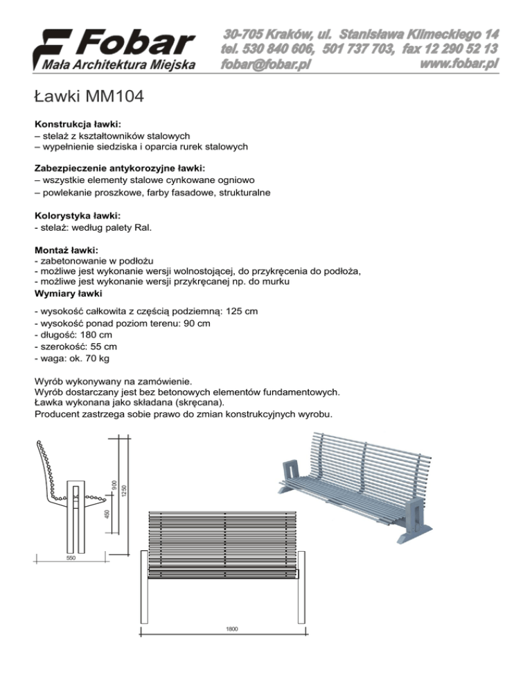 Ławki MM104 Konstrukcja ławki: – stelaż z kształtowników stalowych – wypełnienie siedziska i oparcia rurek stalowych Zabezpieczenie antykorozyjne ławki: – wszystkie elementy stalowe cynkowane ogniowo – powlekanie proszkowe, farby fasadowe, strukturalne Kolorystyka ławki: - stelaż: według palety Ral. Montaż ławki: - zabetonowanie w podłożu - możliwe jest wykonanie wersji wolnostojącej, do przykręcenia do podłoża, - możliwe jest wykonanie wersji przykręcanej np. do murku Wymiary ławki - wysokość całkowita z częścią podziemną: 125 cm - wysokość ponad poziom terenu: 90 cm - długość: 180 cm - szerokość: 55 cm - waga: ok. 70 kg 900 450 1250 Wyrób wykonywany na zamówienie. Wyrób dostarczany jest bez betonowych elementów fundamentowych. Ławka wykonana jako składana (skręcana). Producent zastrzega sobie prawo do zmian konstrukcyjnych wyrobu. 550 1800