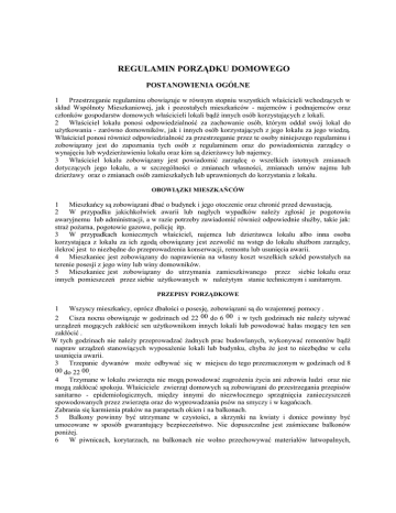REGULAMIN PORZĄDKU DOMOWEGO POSTANOWIENIA OGÓLNE 1 Przestrzeganie regulaminu obowiązuje w równym stopniu wszystkich właścicieli wchodzących w skład Wspólnoty Mieszkaniowej, jak i pozostałych mieszkańców - najemców i podnajemców oraz członków gospodarstw domowych właścicieli lokali bądź innych osób korzystających z lokali. 2 Właściciel lokalu ponosi odpowiedzialność za zachowanie osób, którym oddał swój lokal do uŜytkowania - zarówno domowników, jak i innych osób korzystających z jego lokalu za jego wiedzą. Właściciel ponosi równieŜ odpowiedzialność za przestrzeganie przez te osoby niniejszego regulaminu i zobowiązany jest do zapoznania tych osób z regulaminem oraz do powiadomienia zarządcy o wynajęciu lub wydzierŜawieniu lokalu oraz kim są dzierŜawcy lub najemcy. 3 Właściciel lokalu zobowiązany jest powiadomić zarządcę o wszelkich istotnych zmianach dotyczących jego lokalu, a w szczególności o zmianach własności, zmianach umów najmu lub dzierŜawy oraz o zmianach osób zamieszkałych lub uprawnionych do korzystania z lokalu. OBOWIĄZKI MIESZKAŃCÓW 1 Mieszkańcy są zobowiązani dbać o budynek i jego otoczenie oraz chronić przed dewastacją. 2 W przypadku jakichkolwiek awarii lub nagłych wypadków naleŜy zgłosić je pogotowiu awaryjnemu lub administracji, a w razie potrzeby zawiadomić równieŜ odpowiednie słuŜby, takie jak: straŜ poŜarna, pogotowie gazowe, policję itp. 3 W przypadkach koniecznych właściciel, najemca lub dzierŜawca lokalu albo inna osoba korzystająca z lokalu za ich zgodą obowiązany jest zezwolić na wstęp do lokalu słuŜbom zarządcy, ilekroć jest to niezbędne do przeprowadzenia konserwacji, remontu lub usunięcia awarii. 4 Mieszkaniec jest zobowiązany do naprawienia na własny koszt wszelkich szkód powstałych na terenie posesji z jego winy lub winy domowników. 5 Mieszkaniec jest zobowiązany do utrzymania zamieszkiwanego przez siebie lokalu oraz innych pomieszczeń przez siebie uŜytkowanych w naleŜytym stanie technicznym i sanitarnym. PRZEPISY PORZĄDKOWE 1 Wszyscy mieszkańcy, oprócz dbałości o posesję, zobowiązani są do wzajemnej pomocy . 2 Cisza nocna obowiązuje w godzinach od 22 00 do 6 00 i w tych godzinach nie naleŜy uŜywać urządzeń mogących zakłócić sen uŜytkownikom innych lokali lub powodować hałas mogący ten sen zakłócić . W tych godzinach nie naleŜy przeprowadzać Ŝadnych prac budowlanych, wykonywać remontów bądź napraw urządzeń stanowiących wyposaŜenie lokali lub budynku, chyba Ŝe jest to niezbędne w celu usunięcia awarii. 3 Trzepanie dywanów moŜe odbywać się w miejscu do tego przeznaczonym w godzinach od 8 00 do 22 00. 4 Trzymane w lokalu zwierzęta nie mogą powodować zagroŜenia Ŝycia ani zdrowia ludzi oraz nie mogą zakłócać spokoju. Właściciele zwierząt domowych są zobowiązani do przestrzegania przepisów sanitarno - epidemiologicznych, między innymi do niezwłocznego sprzątnięcia zanieczyszczeń spowodowanych przez zwierzęta oraz do wyprowadzania psów na smyczy i w kagańcach. Zabrania się karmienia ptaków na parapetach okien i na balkonach. 5 Balkony powinny być utrzymane w czystości, a skrzynki na kwiaty i donice powinny być umocowane w sposób gwarantujący bezpieczeństwo. Nie dopuszczalne jest zaśmiecane balkonów poniŜej. 6 W piwnicach, korytarzach, na balkonach nie wolno przechowywać materiałów łatwopalnych, Ŝrących i cuchnących środków chemicznych, materiałów wybuchowych oraz gazu w butlach. 7 Piwnice i strychy naleŜy utrzymywać w czystości i porządku a korzystając z nich, naleŜy przestrzegać przepisów przeciwpoŜarowych. 8 Niedozwolone jest zakładanie gniazd poboru prądu elektrycznego na własny uŜytek w pomieszczeniach piwnicznych oraz prowadzenie w tych pomieszczeniach działalności usługowej lub produkcyjnej bez zgody Wspólnoty. 9 Ciągów komunikacyjnych (korytarzy, klatek schodowych) oraz strychów nie wolno zastawiać Ŝadnymi przedmiotami. JeŜeli jednak jest to konieczne ze względu na prace remontowe w lokalu, to przez czas nie dłuŜszy niŜ 7 dni. Przedmioty te naleŜy usunąć na ustne wezwanie kierownika administracji. Niezastosowanie się do tego wezwania moŜe spowodować usunięcie tych przedmiotów przez zarządcę na koszt osoby, która zastawiła nimi ciąg komunikacyjny. 10 W przypadku braku miejsca do parkowania na terenie posesji właściciele pojazdów zobowiązani są do ich parkowania poza jej terenem. Ustawianie pojazdów na terenie posesji, na ciągach dla pieszych albo w sposób mogący utrudnić poruszanie się pojazdom specjalnym jest zabronione. 11 Zabrania się trwałego parkowania na terenie posesji samochodów cięŜarowych, dostawczych lub pojazdów specjalnych. 12 Zabrania się mycia samochodów na terenie posesji poza stanowiskiem do tego przeznaczonym. 13 Na terenie posesji pojazdy powinny poruszać się z szybkością bezpieczną i zaleca się szczególną ostroŜność przy wjeździe i wyjeździe z bramy przy zachowaniu szczególnej ostroŜności podczas wjazdu i wyjazdu z bramy. Wszelkie uszkodzenia spowodowane uŜytkowaniem pojazdów na terenie posesji obciąŜają właściciela pojazdu 14 Śmieci naleŜy wyrzucać wyłącznie do przeznaczonych w tym celu pojemników w podwórkach gospodarczych. 15 Usuwanie gruzu po remoncie lokalu odbywa się na koszt właściciela lub najemcy lokalu w sposób uzgodniony z zarządcą. 16 Zabrania się zakłócania spokoju mieszkańców i innych uŜytkowników oraz: - zanieczyszczania wspólnej części budynku i posesji. - pisania, drapania na ścianach, malowania ściany pomieszczeń wspólnych albo ścian zewnętrznych budynku bez zezwolenia zarządcy. - wieszania i przybijania tablic lub innych przedmiotów bez zezwolenia Wspólnoty. 17 Rodzice lub opiekunowie zobowiązani są dbać, aby dzieci stosowały się do postanowień niniejszego regulaminu. Za szkody wyrządzone na terenie posesji pr