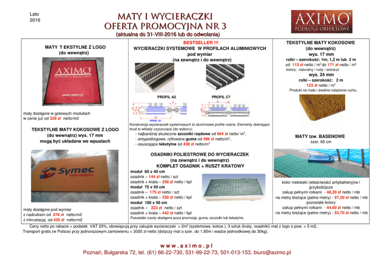 Lato 2016 MATY I WYCIERACZKI OFERTA PROMOCYJNA nr 3 (aktualna do 31VIII2016 lub do odwołania) MATY T EKSTYLNE Z LOGO (do wewnątrz) BESTSELLER !!! WYCIERACZKI SYSTEMOWE W PROFILACH ALUMINIOWYCH pod wymiar (na zewnątrz i do wewnątrz) TEKSTYLNE MATY KOKOSOWE (do wewnątrz) wys. 17 mm rolki – szerokość: 1m; 1,2 m lub 2 m od 113 zł netto / m2 do 171 zł netto / m2 kolory: naturalny / rudy / antracyt wys. 24 mm rolki – szerokość: 2 m 123 zł netto / m2 Produkt na małe i średnie natężenie ruchu. PROFIL A2 PROFIL C7 maty dostępne w gotowych modułach w cenie już od 328 zł netto/m2 TEKSTYLNE MATY KOKOSOWE Z LOGO (do wewnątrz) wys. 17 mm mogą być układane we wpustach Konstrukcja wycieraczek systemowych to aluminiowe profile nośne. Elementy zbierające brud to wkłady czyszczące (do wyboru): najbardziej skuteczne szczotki rzędowe od 664 zł netto/ m2, antypoślizgowe, ryflowana guma od 496 zł netto/m2, osuszające tekstylne od 438 zł netto/m2 MATY tzw. BASENOWE szer. 60 cm OSADNIKI POLIESTROWE DO WYCIERACZEK (na zewnątrz i do wewnątrz) KOMPLET OSADNIK + RUSZT KRATOWY maty dostępne pod wymiar z nadrukiem od 276 zł netto/m2 z inkrustacją od 435 zł netto/m2 moduł 60 x 40 cm osadnik – 144 zł netto / szt osadnik + krata – 258 zł netto / kpl moduł 75 x 50 cm osadnik – 175 zł netto / szt osadnik + krata – 330 zł netto / kpl moduł 100 x 50 cm osadnik – 223 zł netto / szt osadnik + krata – 442 zł netto / kpl kolor niebieski (właściwości antybakteryjne i grzybobójcze zakup pełnymi rolkami 48,20 zł netto / mb na metry bieżące (pełne metry) 57,30 zł netto / mb pozostałe kolory zakup pełnymi rolkami 44,60 zł netto / mb na metry bieżące (pełne metry) 53,70 zł netto / mb Pozostałe ruszty dostępne poza promocję: guma, szczotki lub tekstylne. Ceny netto po rabacie + podatek VAT 23%, obowiązują przy zakupie wycieraczek > 2m2 (systemowe, kokos ), 3 sztuk (kraty, osadniki) mat z logo o pow. > 5 m2,. Transport gratis (w Polsce) przy jednorazowym zamówieniu > 3000 zł netto (dotyczy mat o szer. do 1,95m i wadze jednostkowej do 30kg). w w w . a x i m o . p l Poznań, Bułgarska 72, tel. (61) 6622730, 531992273, 501013153, [email protected]