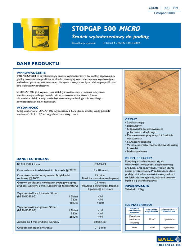 CI/Sfb (43) Pr4 Listopad 2008 STOPGAP 500 MICRO Środek wykończeniowy do podłóg CT-C7-F4 - BS EN 13813:2002 Klasyfikacja wylewek: Dane produktu Wprowadzenie STOPGAP 500 to szybkoschnący środek wykończeniowy do podłóg, zapewniający gładką powierzchnię podłożu ze sklejki, istniejącej warstwie zaprawy wyrównującej, wylewkom piaskowo-cementowym i innym sztywnym, suchym i chłonnym podłożom pod wykładziny podłogowe. STOPGAP 500 jest wymiarowo stabilny i dostarczany w postaci fabrycznie wymieszanego suchego proszku do zastosowań w warstwach 3 mm. nie zawiera białek, a więc może być stosowany w biologicznie wrażliwych pomieszczeniach np. w szpitalach. Wydajność 12 kg wiaderko STOPGAP 500 wymieszany z 6,75 litrami czystej wody posiada wydajność około 13,5 m2 o grubości warstwy 1 mm. Cechy • Szybkoschnący • Bezbiałkowy • Odpowiedni do stosowania na połączeniach sklejkowych • Do zastosowań przy małych i średnich obciążeniach • Nanoszony szpachlą • W razie potrzeby można obniżyć do ostrej krawędzi • Niskozapachowy BS EN13813:2002 Dane techniczne BS EN 13813 Klasa CT-C7-F4 Czas zachowania właściwości roboczych @ 20°C 15 - 20 minut Czas utwardzania do uzyskania obciążalności ruchowej @ 20°C 25 minut Powłoka o strukturze drapanej Gotowy do ułożenia wykładziny podłogowej (przy grubości warstwy 3 mm) (Zależny od temperatury) 25 minut Powłoka o strukturze drapanej 1 godzin @ 2 - 3 mm Wytrzymałość na ściskanie N/mm2 (BS EN13892-2) 1 Dzień 7 Dni 28 Dni >3,0 >5,0 >10,0 Wytrzymałość na zginanie N/mm2 (BS EN13892-2) 1 Dzień 7 Dni 28 Dni >1,0 >3,0 >4,0 Powyższy standard odnosi się do właściwości i wydajności eksploatacyjnej produktu oraz specyfikacji, według której został przetestowany. Przedstawione dane podają minimalne wartości wytrzymałości na ściskanie i na zginanie, którymi produkt będzie się charakteryzował Opakowania Wiaderko 12kg Ile materiału? Grubość nanoszonej warstwy Wydajność na jednostkę ZUŻYCIE NA 50m2 POWIERZCHNI 50 m2 1 jednostki 13,5m2 4 jednostki Zużycie na 1 mm grubości warstwy 0,89kg /m2 Powłoka o strukturze drapanej Grubość nanoszonej warstwy 0 - 3 mm 1mm Przygotowanie powierzchni podłoża Warunkiem prawidłowego nałożenia wykładziny podłogowej jest właściwe przygotowanie podłoża. Podłoże musi być solidne, gładkie, suche (<75% RH) i wolne od mleczka betonowego oraz innych zanieczyszczeń, które mogą ujemnie wpływać na przyczepność kleju. Do usuwania tłuszczu (smaru), oleju, pasty, mydła itp. z niechłonnego podłoża należy użyć środka STYCCOCLEAN C140. Wylewki betonowe i piaskowo-cementowe muszą być całkowicie utwardzone, a wszelkie zanieczyszczenia takie jak mleczko cementowe i stare powłoki muszą być całkowicie usunięte z powierzchni. Temperaturę podłogi należy utrzymywać na poziomie 5°C przez cały czas nanoszenia i schnięcia podkład. Ogrzewanie podpodłogowe należy wyłączyć co najmniej 48 godzin przed aplikacją, w trakcie aplikacji i po jej zakończeniu. Szczegółowe informacje podaje dostępny na życzenie poradnik firmy F. Ball „Przygotowanie podłoża” (Subfloor Preparation Guide). Gruntowanie Nie wymaga gruntowania. Mieszanie Proszek wymieszać z wodą w stosunku 2:1.(Ręcznie). Uwaga: proszek należy dodawać do wody i mieszać do uzyskania sztywnej konsystencji bez grudek. Wymieszać tylko taką ilość, którą można nanieść zanim produkt zgęstnieje. Nie używać mieszanki, która zgęstnieje przed nałożeniem - nie dodawać wody; wymieszany produkt należy wyrzucić. Dodawanie wody - Nie przekraczać 3 litrów wody na worek 12 kg. Nanoszenie Rozprowadzić masę równomiernie po przygotowanym obszarze do uzyskania gładkiej, jednolitej powierzchni bez nieregularności. Najlepszy rezultat uzyskuje się nakładając warstwę o grubości poniżej 1 mm, ale na niewielkich, odizolowanych obszarach warstwa może w razie potrzeby dochodzić do 3 mm. STOPGAP 500 nie jest odpowiedni do stosowania w pomieszczeniach z nagłymi zmianami temperatury, takimi jak np. oszklona weranda (ogród zimowy), z wyjątkiem użycia pomiędzy połączeniami elementów ze sklejki UMIESZCZANIE Narzędzia Odpowiednia stalowa szpachla do wygładzania, wałek z kolcami. Narzędzia należy umyć wodą, gdy klej jest jeszcze mokry lub środkiem STYCCOCLEAN C141 albo rozcieńczalnikiem (biały spirytus), jeżeli klej zaschnie. Przechowywanie Produkt należy przechowywać w nieotwartych wiaderko, ponad ziemią, w chłodnym, suchym, zadaszonym pomieszczeniu, zabezpieczonym przed mrozem i nadmiernym przeciągiem. Okres trwałości 9 miesięcy w nieotwartym pojemniku przechowywanym w dobrych warunkach. Informacje dotyczące bezpieczeństwa i higieny pracy Produkt zaklasyfikowany w rozumieniu przepisów o środkach chemicznych (Informacje o zagrożeniach i opakowaniach). Należy zastosować się do zaleceń podanych we właściwej karcie charakterystyki substancji niebezpiecznej. Podane na stronie www.f-ball.co.uk Można również nabyć u dystrybutora lub w firmie F. Ball and Co. Ltd. pod adresem podanym poniżej. Warunki terenowe są różne - aby upewnić się, że dany produkt jest odpowiedni i dane w karcie produktu są aktualne, należy skontaktować się z działem technicznym firmy. Gdy po podłożu można już chodzić - normalnie 25 minuty po wylaniu przy temperaturze 20°C. Podany czas wydłuży się przy niższych temperaturach. Podany czas wydłuży się przy niższych temperaturach. W miejscach wymagającej grubszej warstwy czas utwardzania i czas schnięcia będzie dłuższy. Dodatkowych informacji na temat produktów firmy F. Ball oraz pomocy i porad technicznych udziela: Churnetside Business Park Station Road, Cheddleton, Leek Staffordshire ST13 7RS United Kingdom Tel: +44 (0) 1538 361633 Fax: +44 (0) 1538 361622 Tech Services Fax: +44 (0) 1538 361567 Email: [email protected] www.f-ball.co.uk