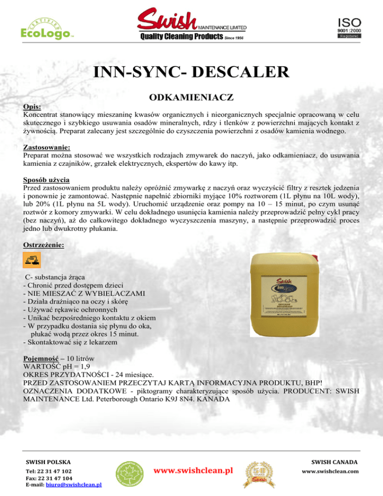 INN-SYNC- DESCALER ODKAMIENIACZ Opis: Koncentrat stanowiący mieszaninę kwasów organicznych i nieorganicznych specjalnie opracowaną w celu skutecznego i szybkiego usuwania osadów mineralnych, rdzy i tlenków z powierzchni mających kontakt z żywnością. Preparat zalecany jest szczególnie do czyszczenia powierzchni z osadów kamienia wodnego. Zastosowanie: Preparat można stosować we wszystkich rodzajach zmywarek do naczyń, jako odkamieniacz, do usuwania kamienia z czajników, grzałek elektrycznych, ekspertów do kawy itp. Sposób użycia Przed zastosowaniem produktu należy opróżnić zmywarkę z naczyń oraz wyczyścić filtry z resztek jedzenia i ponownie je zamontować. Następnie napełnić zbiorniki myjące 10% roztworem (1L płynu na 10L wody), lub 20% (1L płynu na 5L wody). Uruchomić urządzenie oraz pompy na 10 – 15 minut, po czym usunąć roztwór z komory zmywarki. W celu dokładnego usunięcia kamienia należy przeprowadzić pełny cykl pracy (bez naczyń), aż do całkowitego dokładnego wyczyszczenia maszyny, a następnie przeprowadzić proces jedno lub dwukrotny płukania. Ostrzeżenie: C- substancja żrąca - Chronić przed dostępem dzieci - NIE MIESZAĆ Z WYBIELACZAMI - Działa drażniąco na oczy i skórę - Używać rękawic ochronnych - Unikać bezpośredniego kontaktu z okiem - W przypadku dostania się płynu do oka, płukać wodą przez okres 15 minut. - Skontaktować się z lekarzem Pojemność – 10 litrów WARTOŚĆ pH = 1,9 OKRES PRZYDATNOŚCI - 24 miesiące. PRZED ZASTOSOWANIEM PRZECZYTAJ KARTĄ INFORMACYJNA PRODUKTU, BHP! OZNACZENIA DODATKOWE - piktogramy charakteryzujące sposób użycia. PRODUCENT: SWISH MAINTENANCE Ltd. Peterborough Ontario K9J 8N4. KANADA SWISH POLSKA Tel: 22 31 47 102 Fax: 22 31 47 104 E-mail: [email protected] www.swishclean.pl SWISH CANADA www.swishclean.com