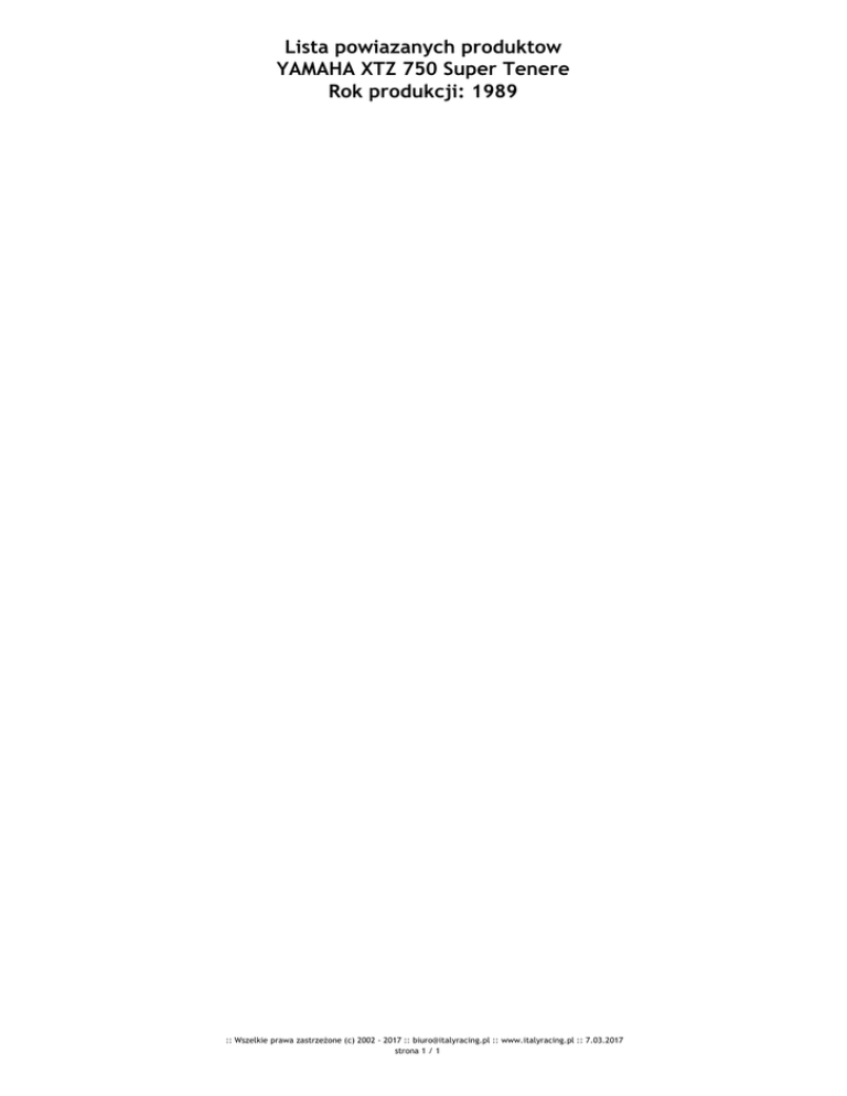 Lista powiazanych produktow YAMAHA XTZ 750 Super Tenere Rok produkcji: 1989 :: Wszelkie prawa zastrzeżone (c) 2002 - 2017 :: [email protected] :: www.italyracing.pl :: 7.03.2017 strona 1 / 1