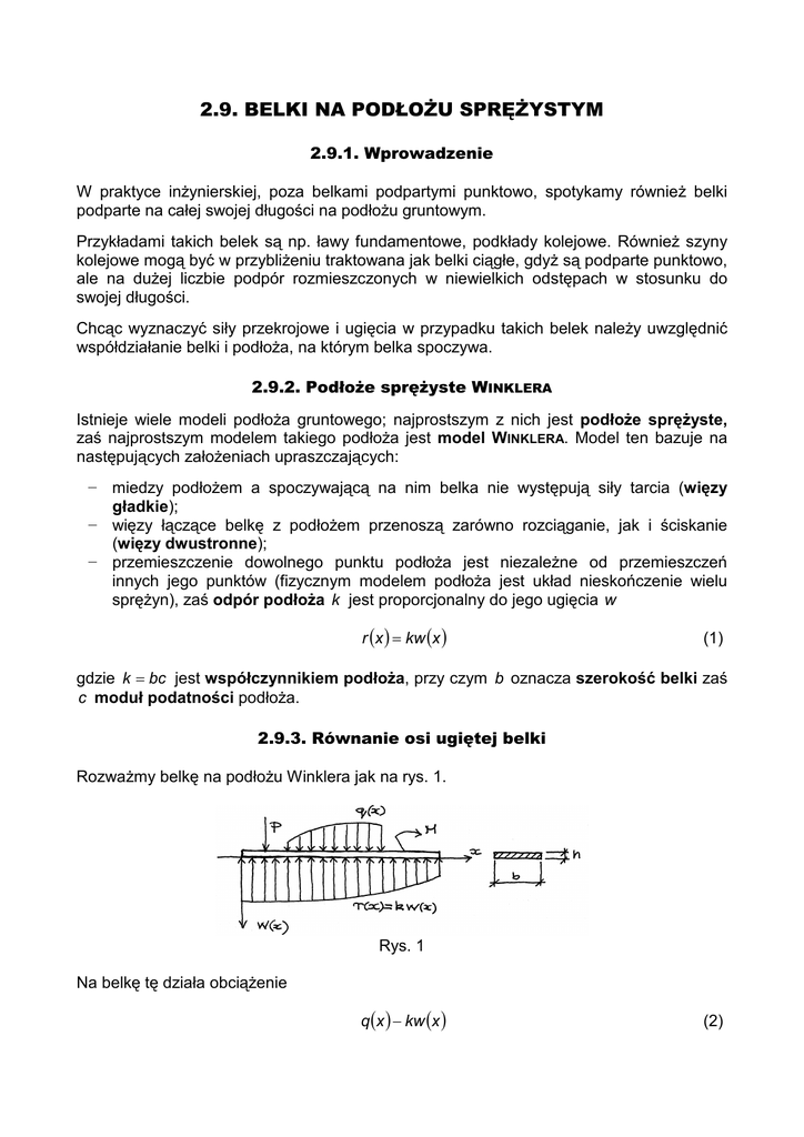 2.9. BELKI NA PODŁOŻU SPRĘŻYSTYM 2.9.1. Wprowadzenie W praktyce inżynierskiej, poza belkami podpartymi punktowo, spotykamy również belki podparte na całej swojej długości na podłożu gruntowym. Przykładami takich belek są np. ławy fundamentowe, podkłady kolejowe. Również szyny kolejowe mogą być w przybliżeniu traktowana jak belki ciągłe, gdyż są podparte punktowo, ale na dużej liczbie podpór rozmieszczonych w niewielkich odstępach w stosunku do swojej długości. Chcąc wyznaczyć siły przekrojowe i ugięcia w przypadku takich belek należy uwzględnić współdziałanie belki i podłoża, na którym belka spoczywa. 2.9.2. Podłoże sprężyste WINKLERA Istnieje wiele modeli podłoża gruntowego; najprostszym z nich jest podłoże sprężyste, zaś najprostszym modelem takiego podłoża jest model WINKLERA. Model ten bazuje na następujących założeniach upraszczających: − miedzy podłożem a spoczywającą na nim belka nie występują siły tarcia (więzy gładkie); − więzy łączące belkę z podłożem przenoszą zarówno rozciąganie, jak i ściskanie (więzy dwustronne); − przemieszczenie dowolnego punktu podłoża jest niezależne od przemieszczeń innych jego punktów (fizycznym modelem podłoża jest układ nieskończenie wielu sprężyn), zaś odpór podłoża k jest proporcjonalny do jego ugięcia w r (x ) = kw (x ) (1) gdzie k = bc jest współczynnikiem podłoża, przy czym b oznacza szerokość belki zaś c moduł podatności podłoża. 2.9.3. Równanie osi ugiętej belki Rozważmy belkę na podłożu Winklera jak na rys. 1. Rys. 1 Na belkę tę działa obciążenie q (x ) − kw (x ) (2) będące różnicą obciążenia czynnego q i obciążenia biernego (odporu gruntu) r określonego zależnością (1). Różniczkując równanie osi ugiętej belki dostajemy d 2w (x ) M (x ) d 3w (x ) 1 dM (x ) T (x ) d 4w (x ) 1 d 2M (x ) = − → = − = − → = − EI EI dx EI EI dx 2 dx 2 dx 3 dx 4 (3) gdzie EJ oznacza sztywność belki przy zginaniu. Ponieważ na rozważana belkę działa obciążenie (2), zatem związki między obciążeniem, siłą poprzeczną T i momentem zginającym M przyjmują w tym przypadku postać d 2M (x ) dT (x ) = = −q (x ) + kw (x ) dx dx 2 (4) Podstawiając (4) do (3) otrzymujemy następujące równanie osi ugiętej belki na podłożu sprężystym WINKLERA d 4w (x ) k q (x ) + w (x ) = 4 EI EI dx (5) k k = 4α 4 → α = 4 EI 4EI (6) Wprowadzając oznaczenie sprowadzamy równanie (6) do postaci d 4w (x ) q (x ) + 4α 4w (x ) = 4 EI dx (7) Rozwiązanie powyższego równania ma postać w (x ) = w s (x ) + e αx (A sinαx + B cos αx ) + e −αx (C sinαx + D cos αx ) (8) gdzie w s (x ) jest całką szczególną równania (7), której postać zależy od postaci funkcji q (x ) , natomiast stałe A, B,C i D dobieramy z kinematycznych, w przypadku w i dw dx , oraz statycznych, w przypadku T i M warunków brzegowych. Przykłady Przykład 1. Wyznaczyć ugięcie w , siłę poprzeczną. T nieskończenie długiej obciążonej jak na rys. P1. Dane: P, k, EI i moment zginający M w przypadku belki Szukane: w (x ), T (x ), M (x ) Rys. P1.1 Rozwiązanie Przyjmując początek układu odniesienia w punkcie przyłożenia siły i uwzględniając symetrię belki względem linii działania siły, rozpatrujemy tylko jej jedną połowę, czyli przedział x ≥ 0 . Ponieważ w rozważanym przypadku q (x ) = 0 , zatem równanie (7) staje się jednorodne, zatem w s (x ) = 0 i w konsekwencji jego rozwiązanie (8) przyjmuje następującą postać: (a) w (x ) = eαx (A sin αx + B cos αx ) + e −αx (C sin αx + D cos αx ) Krok 1. Wyznaczamy stałe całkowania Na osi symetrii belki (w punkcie x = 0 ) obrót (pochodna ugięcia) jest równy zeru, zaś wartość siły poprzecznej jest równa połowie siły przyłożonej do belki. Oznacza to, że na lewym końcu belki warunki brzegowe maja następującą postać: dw (x ) =0 dx x = 0 + (b) T (x ) x = 0 + = − P d 3w (x ) → 2 dx 3 =− x = 0+ T (x ) EI = x = 0+ P 2EI W przypadku prawego końca belki, który znajduje się w nieskończoności możemy przyjąć w (x ) x → ∞ = 0 (c) dw (x ) =0 dx x → ∞ Z postaci rozwiązania wynika, że warunki powyższe mogą być spełnione jedynie wtedy, gdy A = 0 i B = 0 . Zatem funkcja ugięcia przyjmuje postać (d) w (x ) = e −αx (C sin αx + D cos αx ) zaś jej pierwsza pochodna dana jest zależnością (e) dw (x ) = − (C + D )αe −αx sin αx + (C − D )αe −αx cos αx dx Wykorzystując w powyższej zależności warunek (b)1 dostajemy, że (f) C = D co oznacza, że w (x ) = Ce −αx (sin αx + cos αx ) dw (x ) = −2Cαe −αx sin αx dx (g) d 2w (x ) dx 2 d 3w (x ) dx 3 = 2Cα 2e −αx (sin αx − cos αx ) = 4Cα 3e −αx cos αx Podstawiając (g)4 do warunku (b)2. wyznaczamy stałą C (h) d 3w (x ) dx = 4Cα 3e −αx cos αx 3 x =0+ x = 0+ = 4Cα 3 = P P →C = 2EI 8α 3EI co pozwala przedstawić funkcję ugięcia belki w postaci (i) w (x ) = P 8α 3EI e −αx (sin αx + cos αx ) Natomiast siły przekrojowe wyznaczamy z zależności (3) przy uwzględnieniu relacji (g) d 2w (x ) M (x ) P −αx =− = 2Cα 2e −αx (sin αx − cos αx ) → M (x ) = − e (sin αx − cos αx ) 2 α EI 4 dx (j) d 3w (x ) T (x ) P =− = 4Cα 3e −αx cos αx → T (x ) = − e −αx cos αx 3 EI 2 dx Wykresy powyższych funkcji przedstawia rys. P1.2 Rys. P1.2