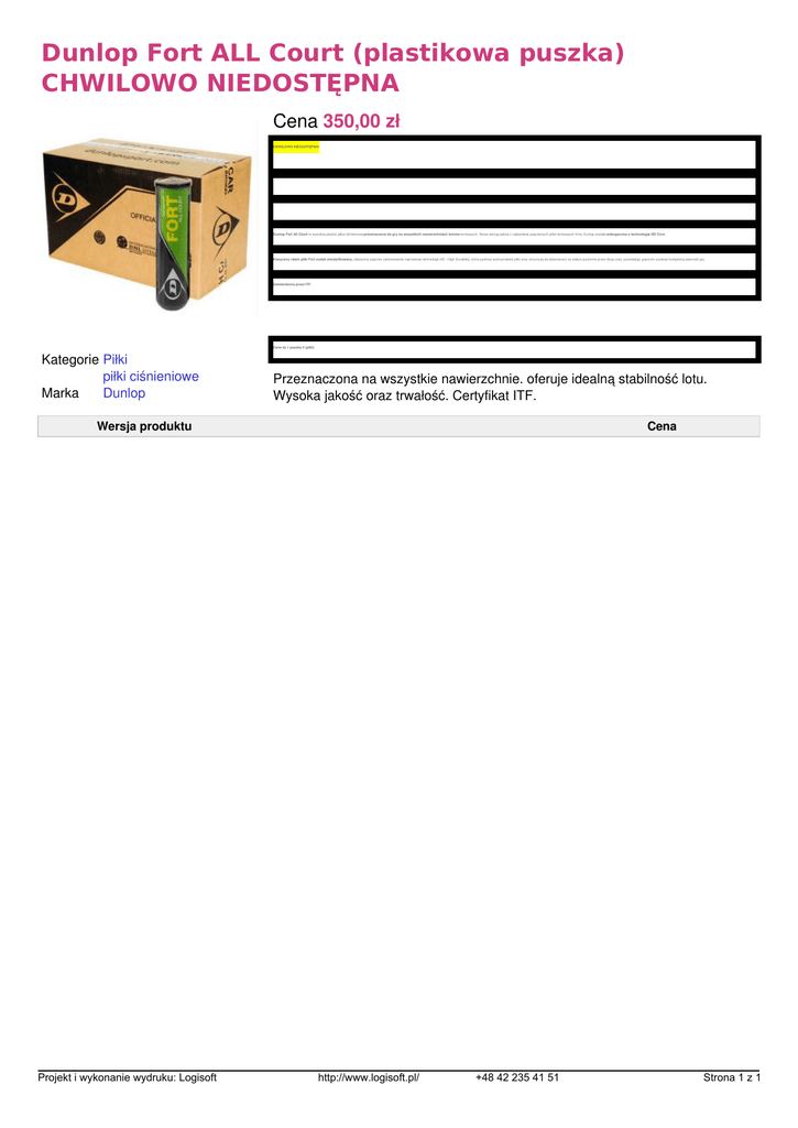 Dunlop Fort ALL Court (plastikowa puszka) CHWILOWO NIEDOSTĘPNA Cena 350,00 zł CHWILOWO NIEDOSTĘPNA! Dunlop Fort All Court to wysokiej jakości piłka ciśnieniową przeznaczona do gry na wszystkich nawierzchniach kortów tenisowych. Nowa wersja jednej z najbardziej popularnych piłek tenisowych firmy Dunlop została wzbogacona o technologię HD Core. Klasyczny rdzeń piłki Fort został zmodyfikowany, ulepszony poprzez zastosowanie najnowszej technologii HD - High Durability, która podnosi wytrzymałość piłki oraz utrzymuje jej właściwości na stałym poziomie przez długi czas, pozwalając graczom uzyskać kompletną pewność gry. Zatwierdzona przez ITF. Cena za 1 puszkę 4 (piłki) Kategorie Piłki piłki ciśnieniowe Marka Dunlop Przeznaczona na wszystkie nawierzchnie. oferuje idealną stabilność lotu. Wysoka jakość oraz trwałość. Certyfikat ITF. Wersja produktu Projekt i wykonanie wydruku: Logisoft Powered by TCPDF (www.tcpdf.org) Cena http://www.logisoft.pl/ +48 42 235 41 51 Strona 1 z 1