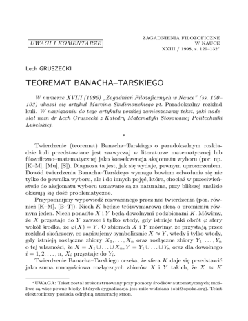 ZAGADNIENIA FILOZOFICZNE W NAUCE XXIII / 1998, s. 129–132∗ UWAGI I KOMENTARZE Lech GRUSZECKI TEOREMAT BANACHA–TARSKIEGO W numerze XVIII (1996) „Zagadnień Filozoficznych w Nauce” (ss. 100– 103) ukazał się artykuł Marcina Skulimowskiego pt. Paradoksalny rozkład kuli. W nawiązaniu do tego artykułu poniżej zamieszczamy tekst, jaki nadesłał nam dr Lech Gruszecki z Katedry Matematyki Stosowanej Politechniki Lubelskiej. * Twierdzenie (teoremat) Banacha–Tarskiego o paradoksalnym rozkładzie kuli przedstawiane jest zazwyczaj w literaturze matematycznej lub filozoficzno–matematycznej jako konsekwencja aksjomatu wyboru (por. np. [K–M], [Mu], [S]). Diagnoza ta jest, jak się wydaje, pewnym uproszczeniem. Dowód twierdzenia Banacha–Tarskiego wymaga bowiem odwołania się nie tylko do pewnika wyboru, ale i do innych pojęć, które, chociaż w przeciwieństwie do aksjomatu wyboru uznawane są za naturalne, przy bliższej analizie okazują się dość problematyczne. Przypomnijmy wypowiedź rozważanego przez nas twierdzenia (por. również [K–M], [B–T]). Niech K będzie trójwymiarową sferą o promieniu równym jeden. Niech ponadto X i Y będą dowolnymi podzbiorami K. Mówimy, że X przystaje do Y zawsze i tylko wtedy, gdy istnieje taki obrót ϕ sfery wokół środka, że ϕ(X) = Y . O zbiorach X i Y mówimy, że przystają przez rozkład skończony, co zapisujemy symbolicznie X ≈ Y , wtedy i tylko wtedy, gdy istnieją rozłączne zbiory X1 , . . . , Xn oraz rozłączne zbiory Y1 , . . . , Yn o tej własności, że X = X1 ∪ . . . ∪ Xn , Y = Y1 ∪ . . . ∪ Yn oraz dla dowolnego i = 1, 2, . . . , n, Xi przystaje do Yi . Twierdzenie Banacha–Tarskiego orzeka, że sfera K daje się przedstawić jako suma mnogościowa rozłącznych zbiorów X i Y takich, że X ≈ K ∗ UWAGA: Tekst został zrekonstruowany przy pomocy środków automatycznych; możliwe są więc pewne błędy, których sygnalizacja jest mile widziana ([email protected]). Tekst elektroniczny posiada odrębną numerację stron. 2 Lech GRUSZECKI oraz że Y ≈ K. Można wykazać, że twierdzenie zachodzi również dla kuli domkniętej (lub otwartej). W dowodzie twierdzenia korzysta się między innymi z aksjomatu wyboru, który stwierdza, że dla dowolnej rodziny zbiorów niepustych i rozłącznych istnieje zbiór, który ma dokładnie po jednym elemencie wspólnym z każdym ze zbiorów należących do tej rodziny. Aksjomat wyboru został sformułowany w 1904 r. przez E. Zermelo i od razu wzbudził kontrowersję. Wielu matematyków (np. Borel, Lebesgue) wskazywało na jego niekonstruktywny charakter; inni (np. Hausdorff, Fraenkel) przyjmowali ten aksjomat bez zastrzeżeń, nadając mu ten sam status, co innym pewnikom teorii mnogości. Trzeba przy tym zaznaczyć, że aksjomat wyboru jest niezbędny w dowodzie równoważności definicji Heinego i Cauchy’ego ciągłości funkcji oraz w dowodach kilku kluczowych twierdzeń różnych działów matematyki, np. w dowodach twierdzenia Tichonowa o zwartości produktu przestrzeni zwartych i twierdzenia Hahna–Banacha. W dowodzie twierdzenia Banacha–Tarskiego pewnik wyboru zastosowany jest do rodziny podzbiorów sfery K, przy czym zakłada się, że K ⊂ R3 . Właśnie to założenie, tzn. utożsamienie rzeczywistej przestrzeni fizycznej z trójwymiarową przestrzenią euklidesową może być źródłem paradoksalności twierdzenia. Wiadomo przecież, że przestrzeń R3 posiada własności, które mogą nie przysługiwać przestrzeni fizycznej. Przestrzeń euklidesowa jest nieskończenie podzielna, zupełna i spójna. Własności te czasem określa się jednym słowem: ciągłość (por. [Mi]). Współczesne nauki fizyczne wskazują jednak, że przestrzeń, w której żyjemy, ma strukturę dyskretną; ciągłość jest raczej wygodną formą ujmowania rzeczywistości przez nasz umysł. Dowód twierdzenia Banacha–Tarskiego opiera się natomiast na wykorzystaniu całego „bogactwa” zbioru liczb rzeczywistych, w szczególności na realistycznym traktowaniu liczb niewymiernych, którym mają odpowiadać punkty w przestrzeni (dla przykładu można wspomnieć, że dowód wymaga konstrukcji pewnej grupy obrotów sfery K; podstawą tej konstrukcji jest m. in. obrót wokół jednej z osi układu współrzędnych o kąt będący niewymierną wielokrotnością 2π). Problem istnienia liczb niewymiernych, jak wiadomo, budził wiele emocji w przeszłości. Starożytni Grecy uniknęli rozważania tego pojęcia poprzez sprowadzenie algebry do geometrii. W okresie późniejszym (zwłaszcza od czasu rozkwitu algebry we Włoszech w XVI w.) liczby niewymierne wprawdzie były stosowane, ale ich status pozostawał niejasny aż do drugiej połowy XIX w., kiedy to zostały przedstawione niezależnie przez Weierstrassa, De- TEOREMAT BANACHA–TARSKIEGO 3 dekinda i Cantora różne metody wprowadzania liczb rzeczywistych. Wszystkie one opierały się na postulowaniu analogii pomiędzy konstruowanym jako uzupełnienie zbioru liczb wymiernych zbiorem liczb rzeczywistych a prostą geometryczną. R. Dedekind pisał: „[...] porównanie dziedziny R liczb wymiernych i linii prostej doprowadziło do stwierdzenia istnienia luk, niezupełności czy nieciągłości tej pierwszej, podczas gdy prostej przypisujemy zupełność, brak luk czyli ciągłość” (por. [D]). O ile teoria liczb rzeczywistych stworzona w ubiegłym wieku jest operacyjnie użyteczna, to intuicje geometryczne, które (wraz z szeregiem zagadnień analizy matematycznej) przyczyniły się do jej powstania, są dziś poddawane w wątpliwość. Zwróćmy uwagę również i na to, że proces kształtowania matematycznego modelu przestrzeni fizycznej odbywa się przy użyciu pojęć logicznych, które powstają w oparciu o doświadczenie wielkości skończonych. Czy tak powstała struktura pojęć logicznych może być przeniesiona na obiekty nieskończone? Czy same zwroty kwantyfikatorowe nie sugerują punktowej bu